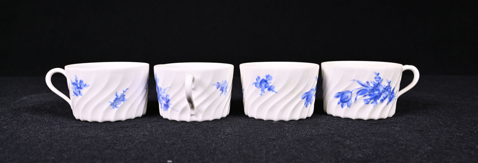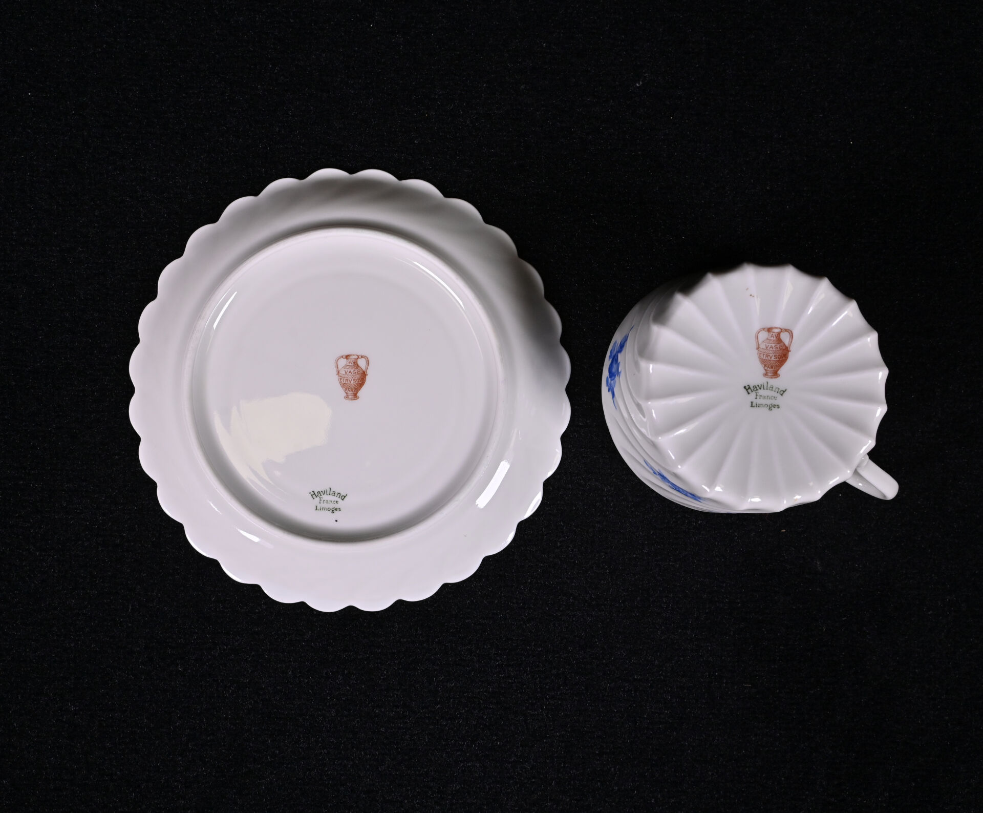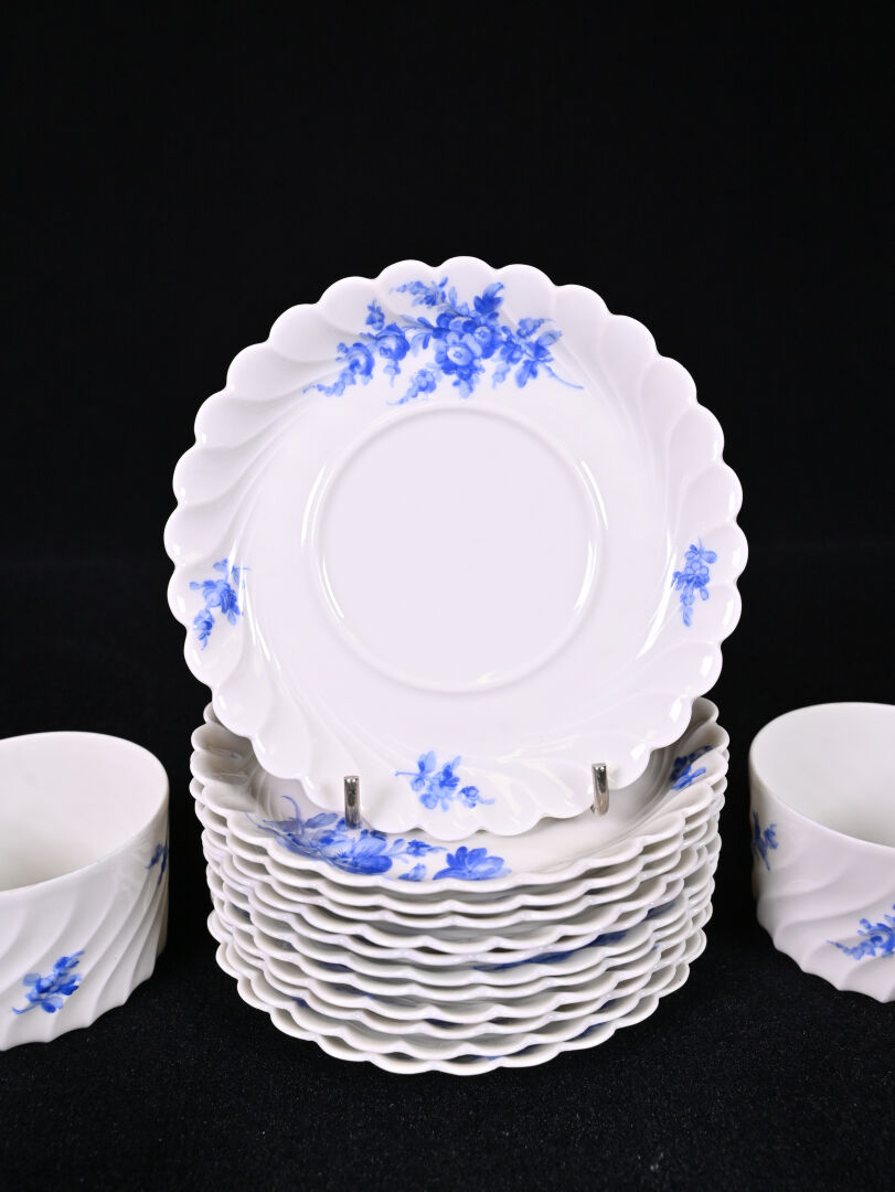 HAVILAND FRANCE. Service à café en porcelaine blanche à décor en bleu de fleurs comprenant 9 tasses et sous tasses et 3 sous tasses. Marqué au dessous avec marque AU VASE ETRUSQUE PARIS.