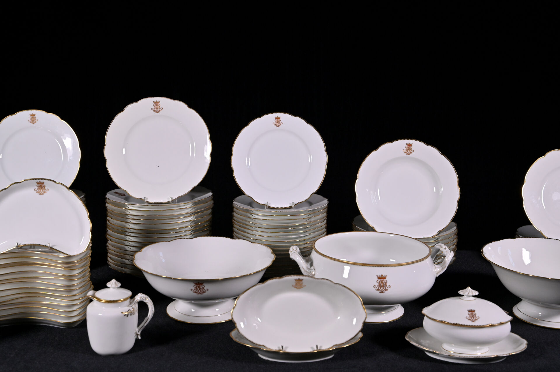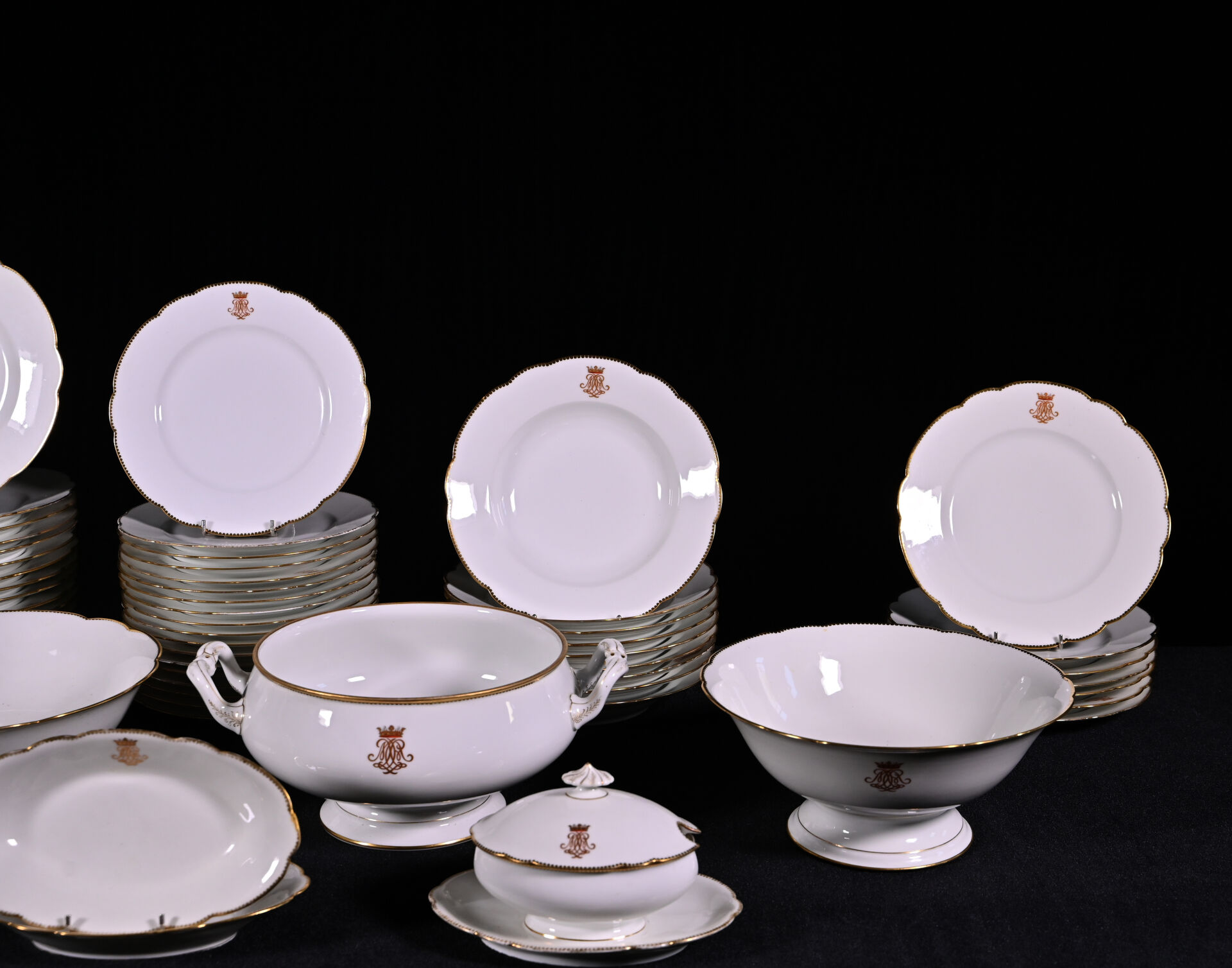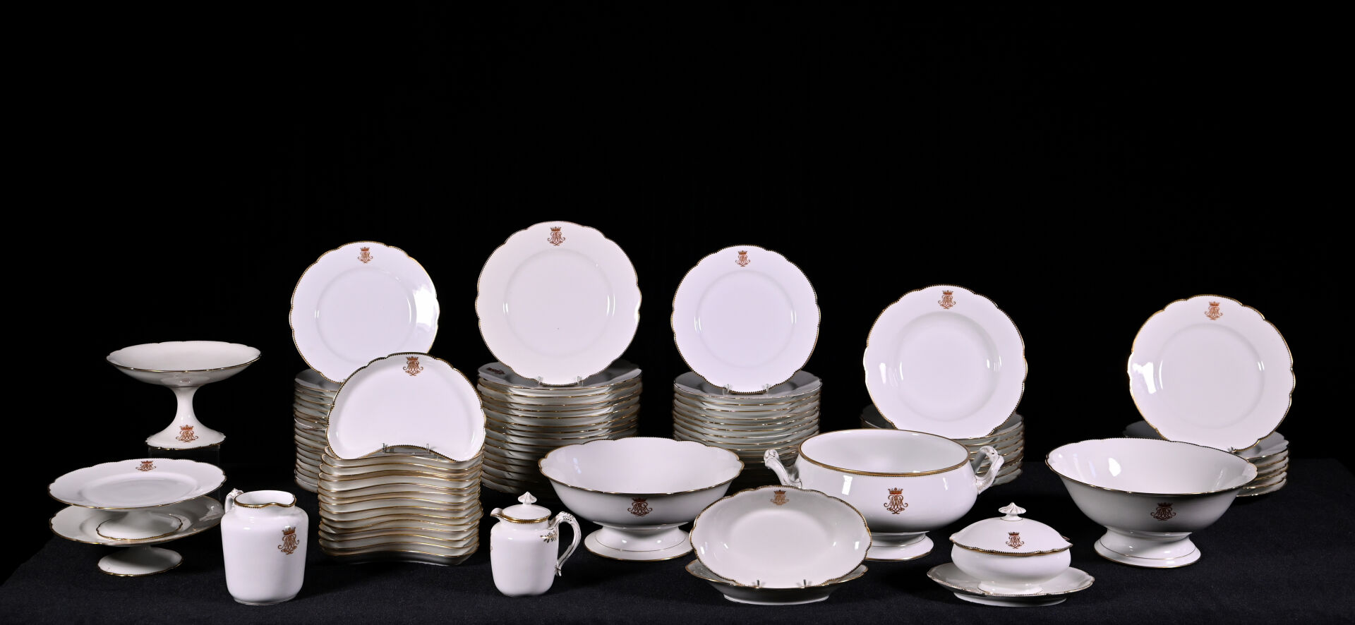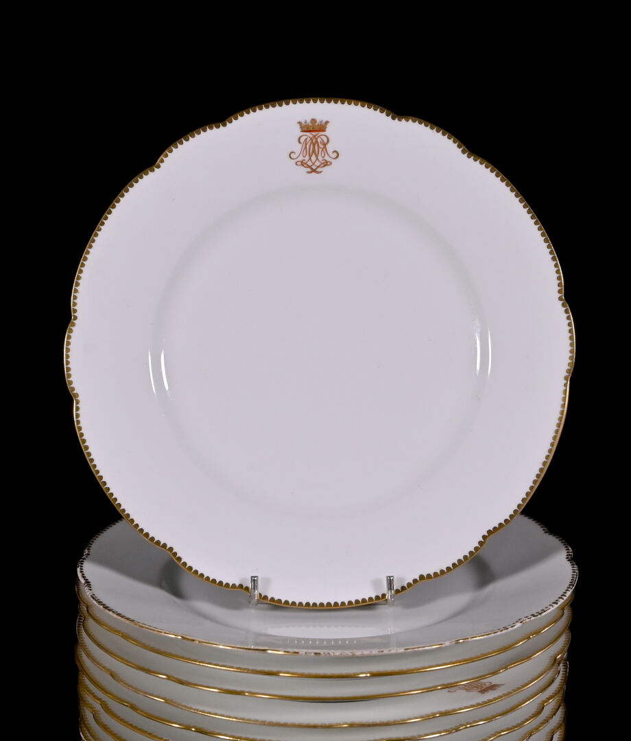 HAVILAND LIMOGES. Partie de service de table en porcelaine blanche à bordure dorée et chiffre sous une couronne de marquis comprenant : 24 assiettes plates, 9 assiettes creuses, 36 assiettes à entremets, 15 assiettes de côté, 1 soupière (sans couvercle), 2 jattes sur pied, 2 plats à tarte, 1 compotier, 2 raviers, 1 saucière à fonds solidaire, 1 pot à lait (sans couvercle) et 1 pot à crème (avec un couvercle) (usures d’usage). Marqué au dessous.