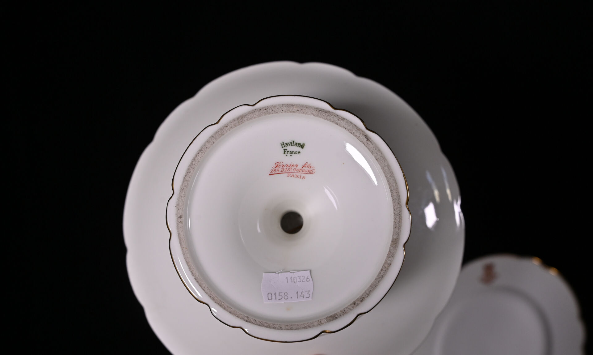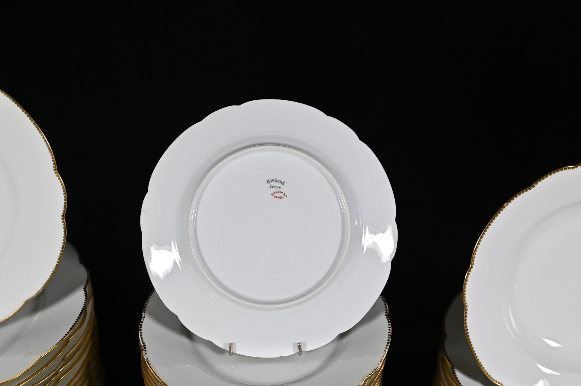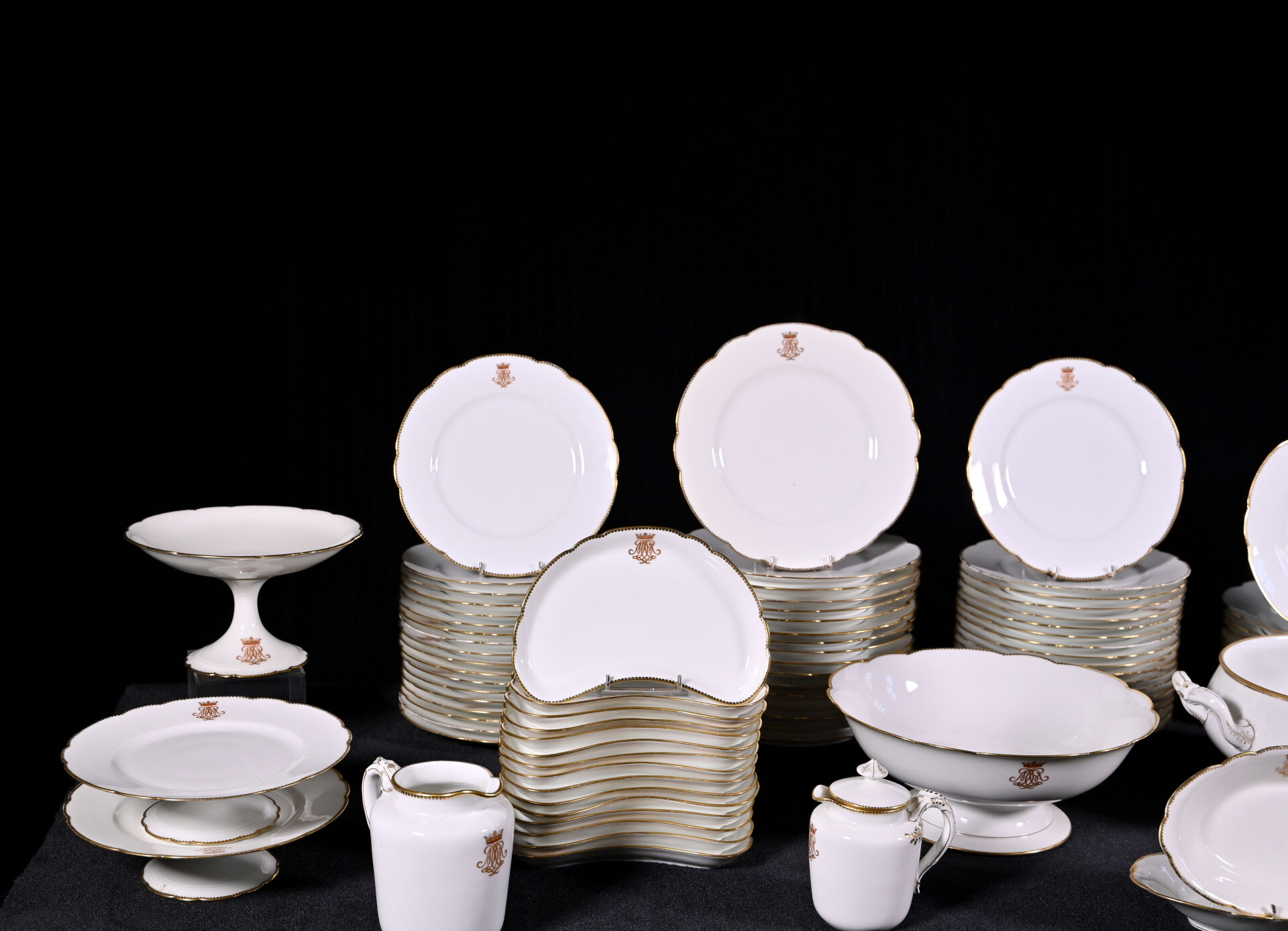 HAVILAND LIMOGES. Partie de service de table en porcelaine blanche à bordure dorée et chiffre sous une couronne de marquis comprenant : 24 assiettes plates, 9 assiettes creuses, 36 assiettes à entremets, 15 assiettes de côté, 1 soupière (sans couvercle), 2 jattes sur pied, 2 plats à tarte, 1 compotier, 2 raviers, 1 saucière à fonds solidaire, 1 pot à lait (sans couvercle) et 1 pot à crème (avec un couvercle) (usures d’usage). Marqué au dessous.