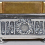 HENIN et COMPAGNIE. Jardinière oblongue en argent 800/1000e à décor travaillé au repoussé de larges cannelures, couronne de laurier nouées. Petits pieds boule à gradins. Intérieur amovible en cuivre. Poids net : 701 g. Dimensions : 17,5 x 27,5 x 15,5 cm.