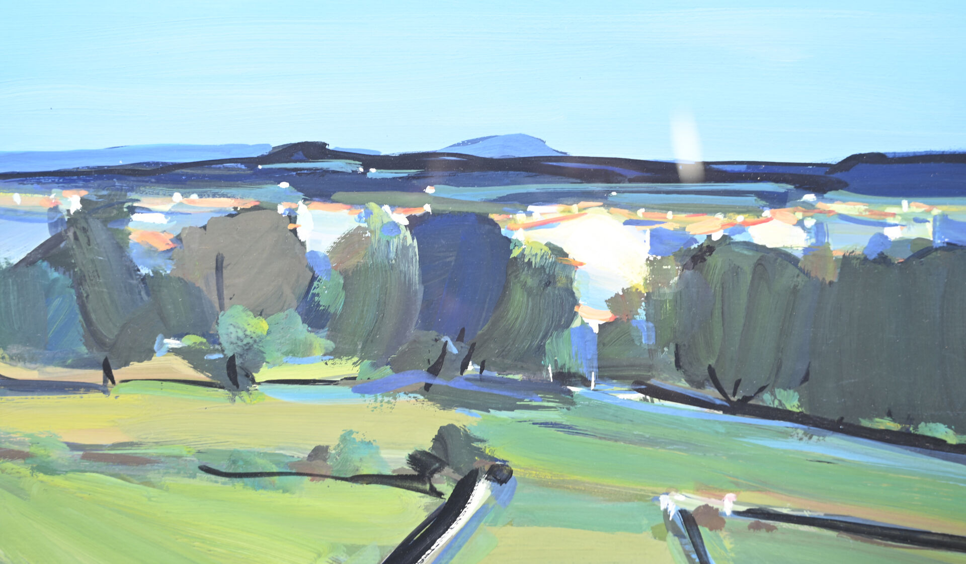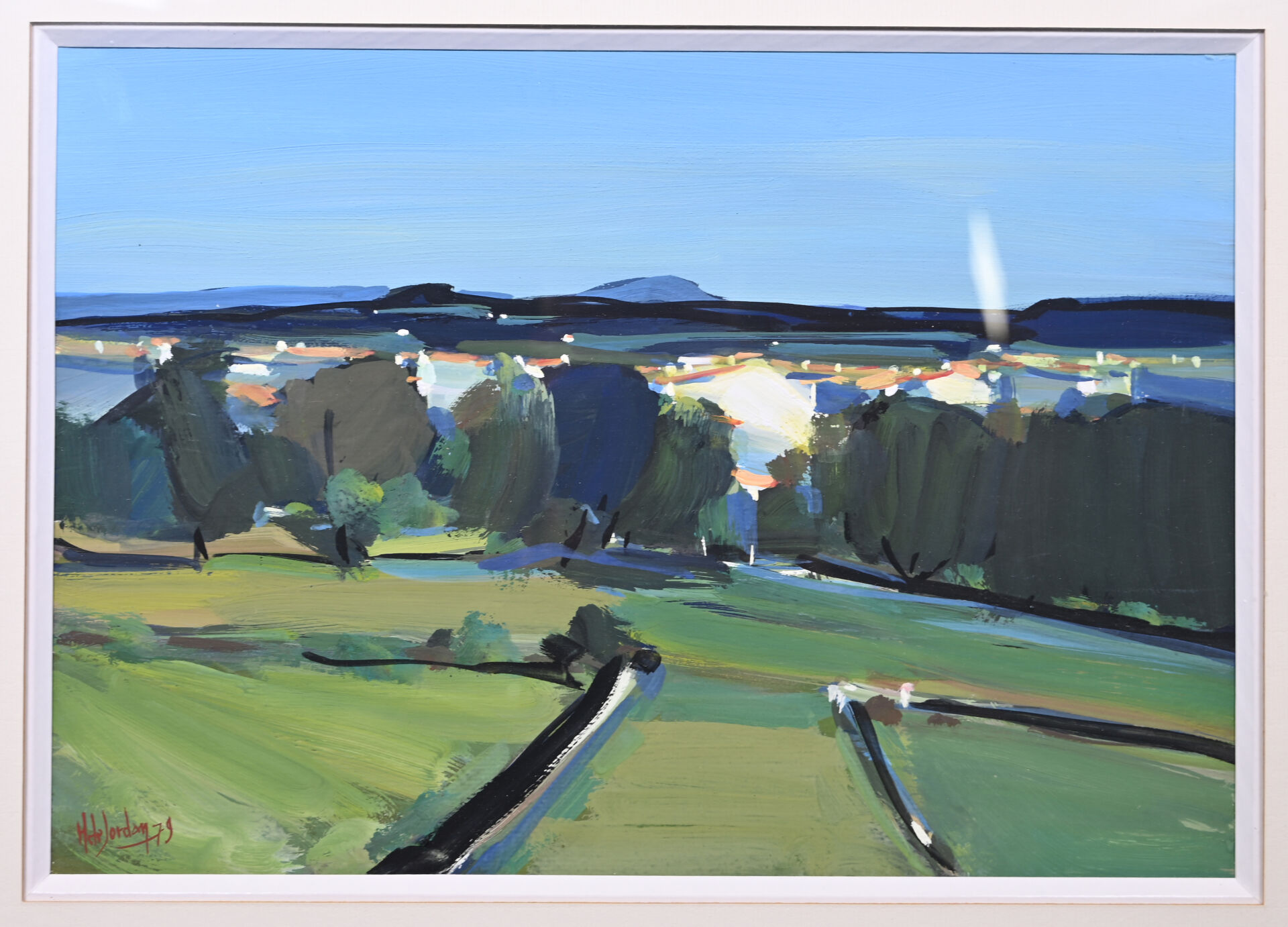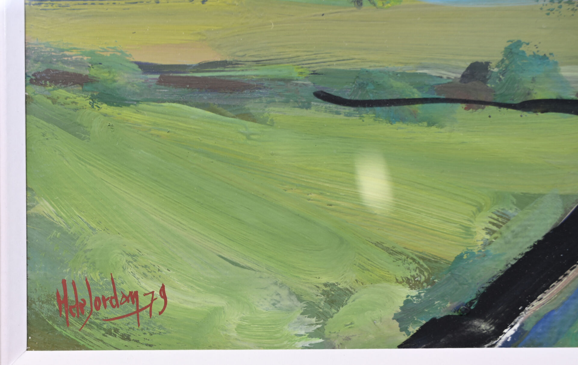 Henri de JORDAN (1944-1996). Paysage au village sous le soleil. Acrylique sur papier signée et datée 1979 en bas à gauche. 24 x 34 cm à vue.