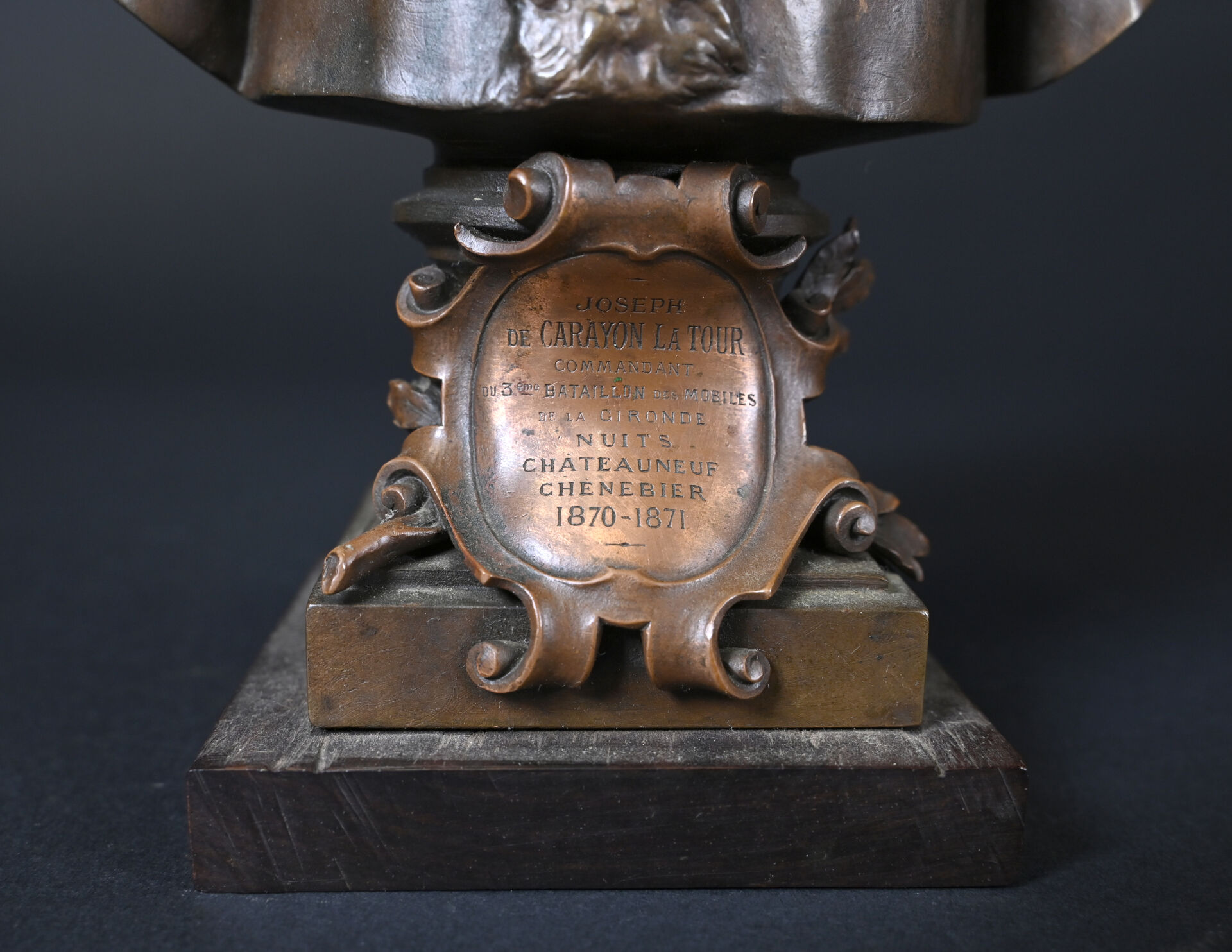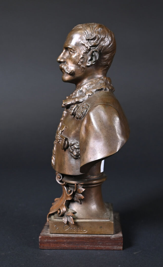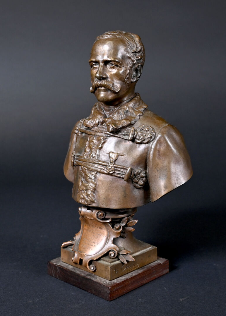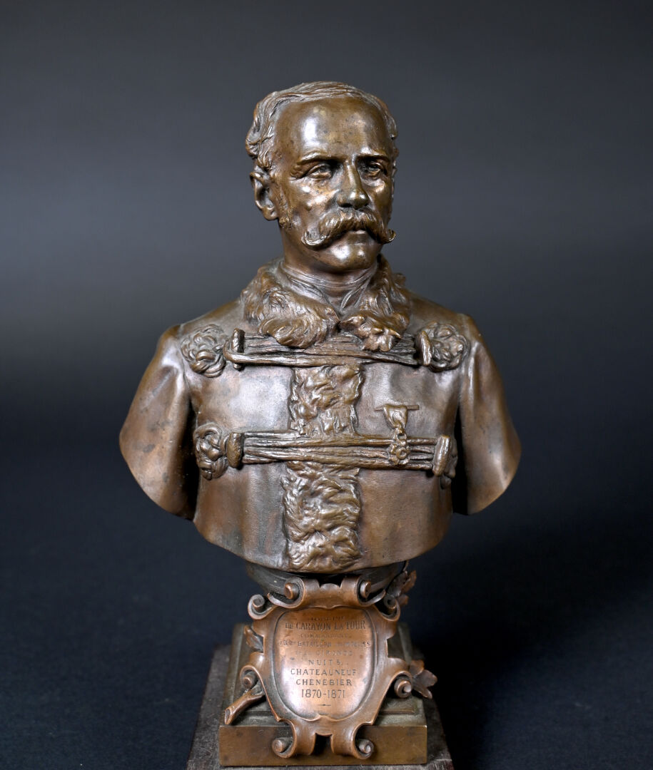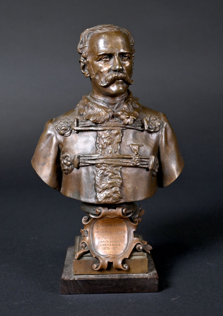 Henri Michel Antoine CHAPU (1833-1891). Buste de Joseph de CARAYON LA TOUR (ancien Maire de Bordeaux, commandant du 3e bataillon des mobiles de la Gironde). Bronze patiné brun médaille, E. COLIN & Cie fondeur. Signé sur la terrasse, avec cartouche devant. Socle de bois. Haut. : 26,5 cm.