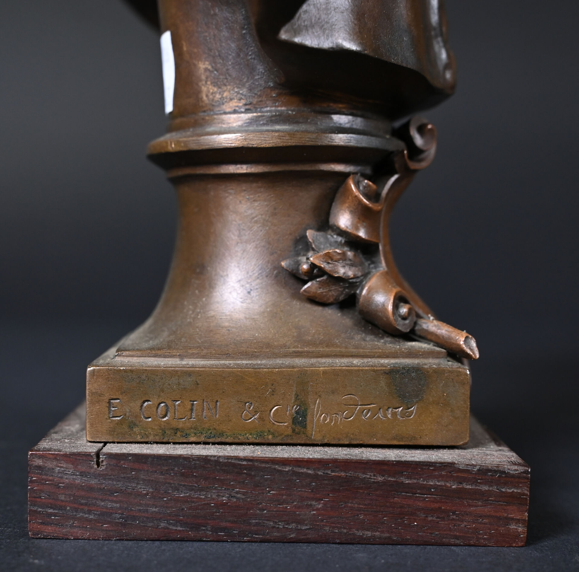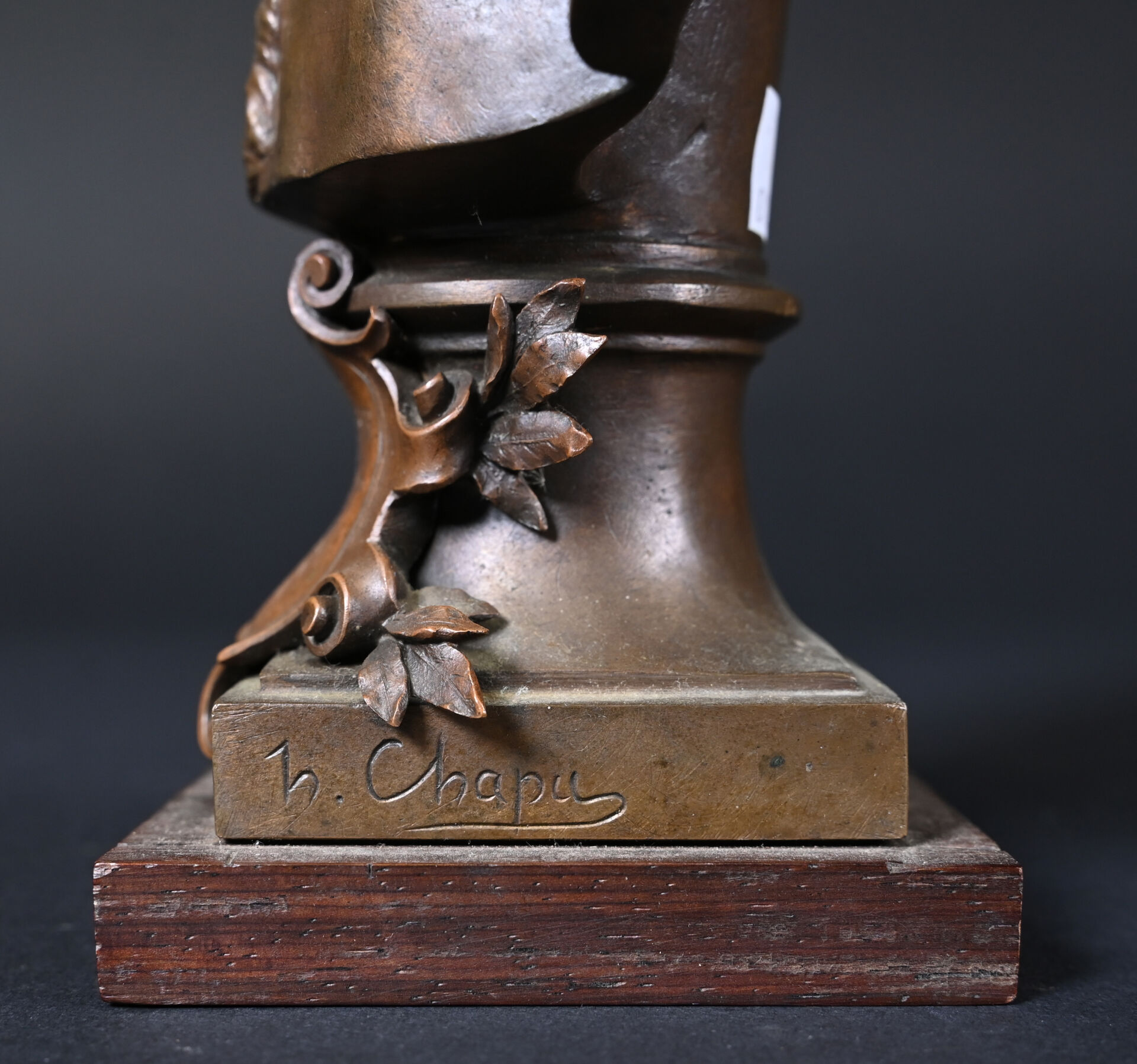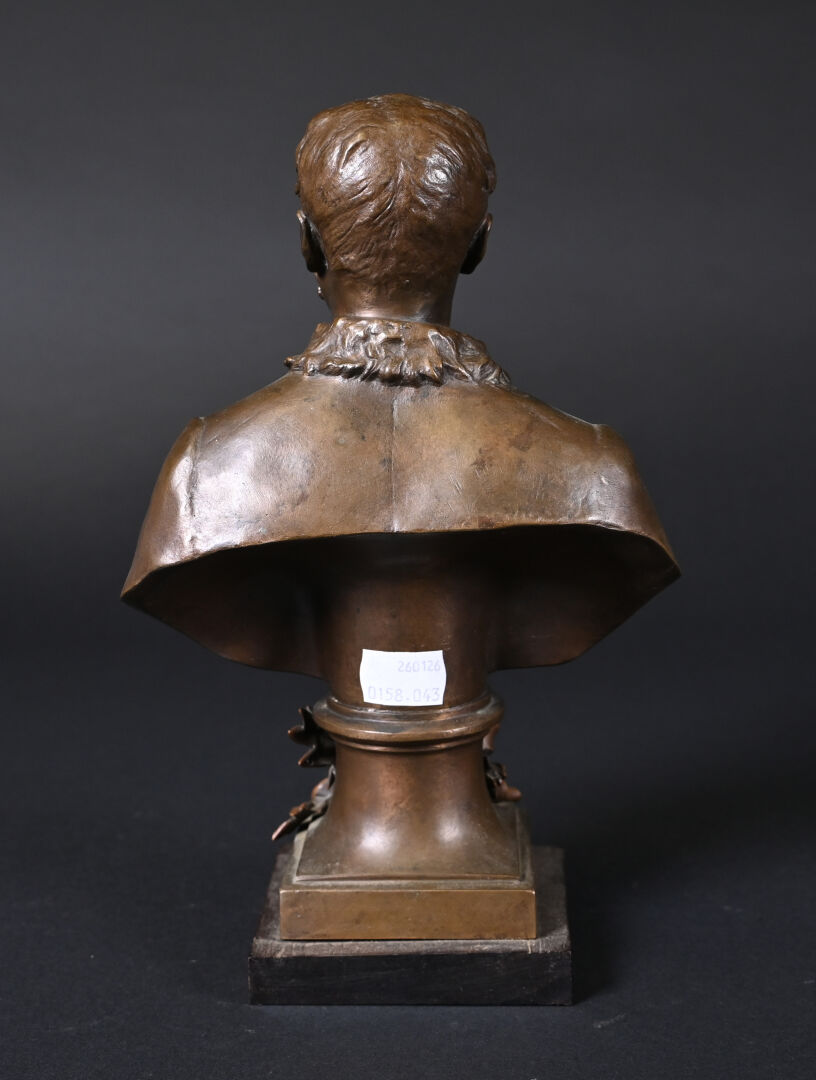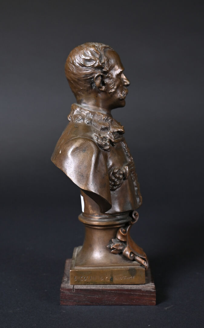 Henri Michel Antoine CHAPU (1833-1891). Buste de Joseph de CARAYON LA TOUR (ancien Maire de Bordeaux, commandant du 3e bataillon des mobiles de la Gironde). Bronze patiné brun médaille, E. COLIN & Cie fondeur. Signé sur la terrasse, avec cartouche devant. Socle de bois. Haut. : 26,5 cm.