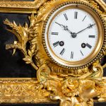 Henri PICARD Bronzier (actif entre 1840-1890). Pendule en bronze à patine brun et or et pierre dure noire. Cadran émaillé à chiffres romains pour les heures, chemin de fer. Elle est ornée d’une figure de Molière en bronze patiné brun, la plume à la main. Riche ornementation de bronze ciselé doré, gerbes de blé, acanthes et coquilles. Signée. Fin du XIXe siècle. Haut. : 61 cm – Larg. : 46 cm – Prof. : 20 cm.