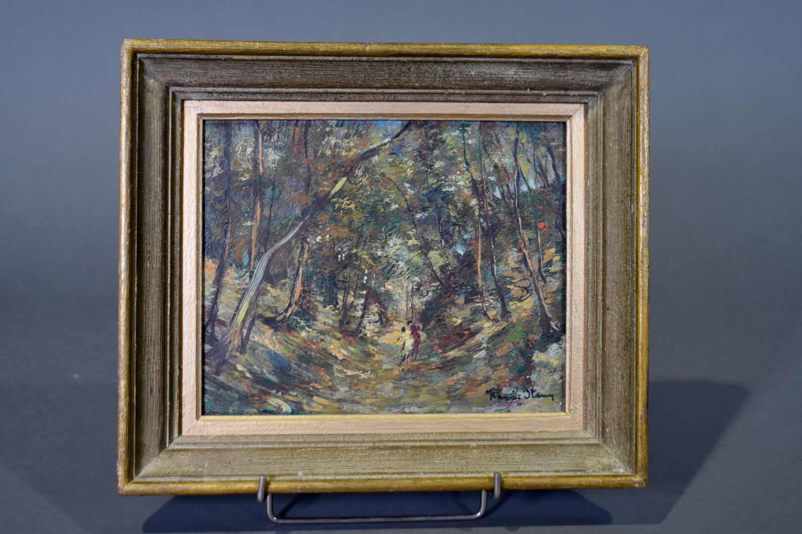 Henri STENN (1903-1993). Promeneurs dans une allée du Parc de Saint Cloud. Huile sur panneau d’Isorel signé en bas à gauche. 21 x 27 cm.