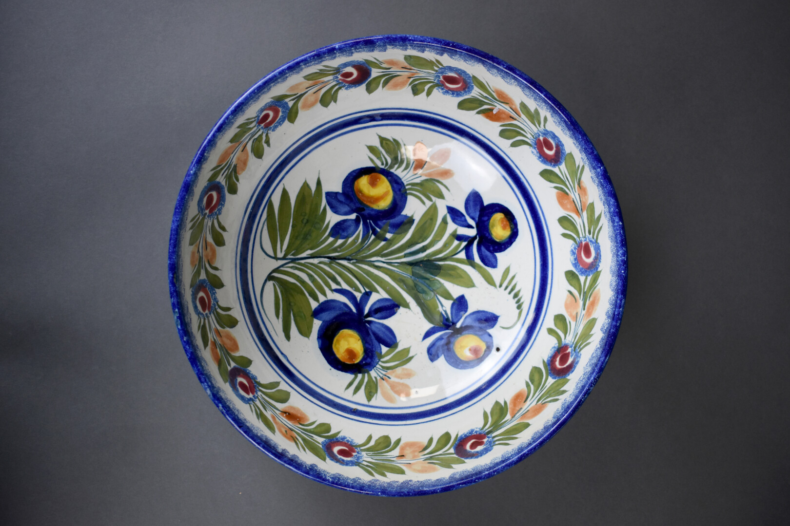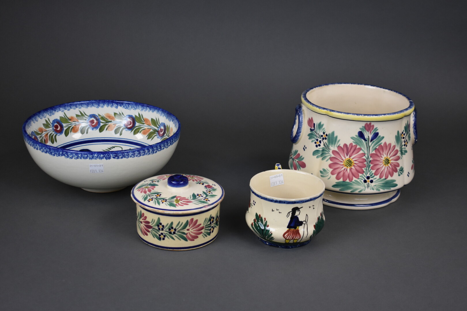 Henriot QUIMPER. Ensemble en faïence à décor de fleurs soit un rafraîchissoir, une tasse à chocolat, un pot couvert, un saladier. Marqués.