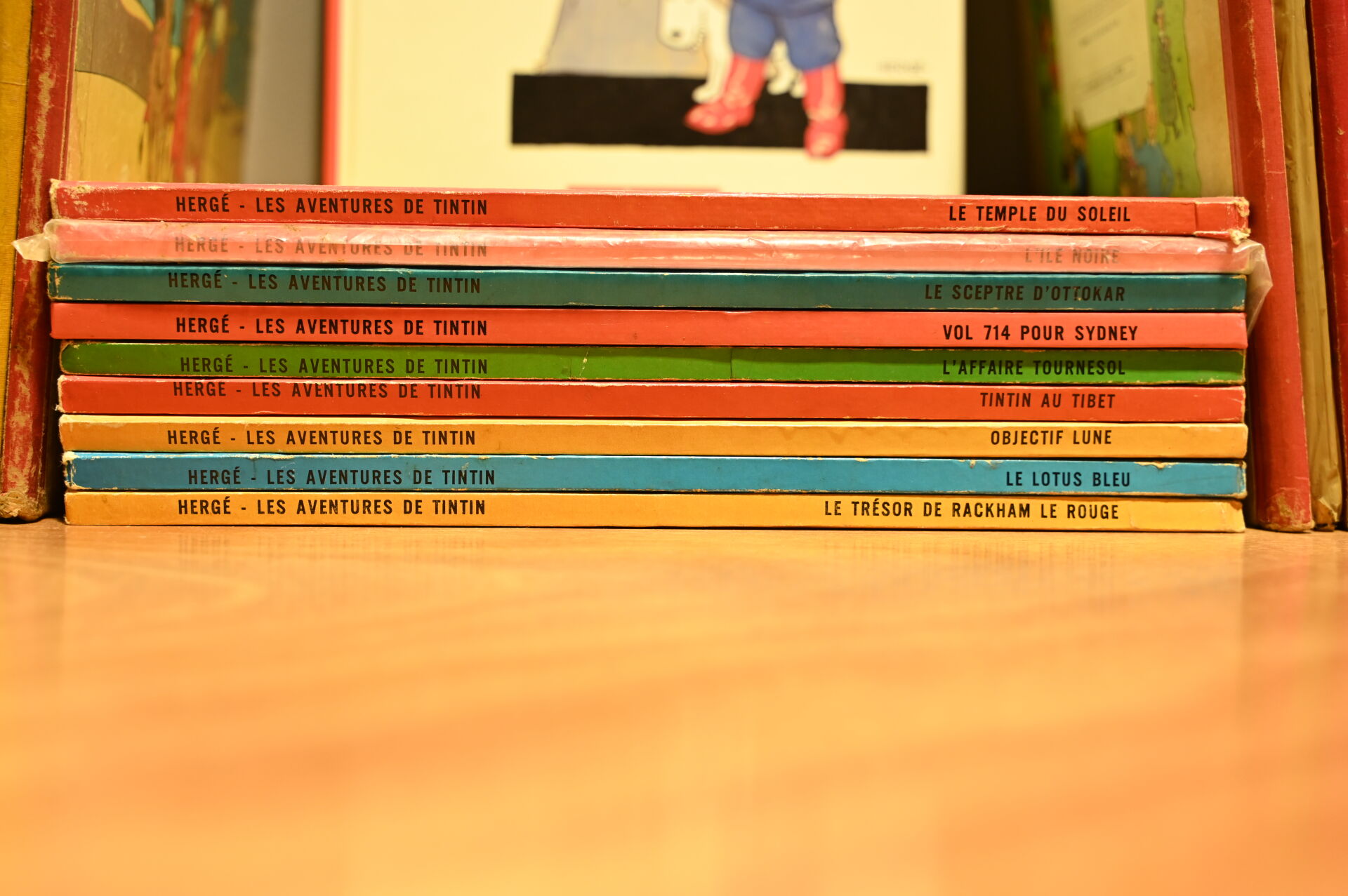 HERGE – LES AVENTURES DE TINTIN. Ensemble de 25 dont OBJECTIF LUNE, TINTIN AU TIBET, TINTIN EN AMERIQUE, LE CRABE AUX PINCES D’OR etc. Intérieur galerie de portraits (années 40/50 en grande partie). On joint deux en très mauvais état sans couverture (TINTIN AU CONGO 1947 et VOL 714 POUR SIDNEY), deux albums JO, ZETTE et JOCKO et une réédition moderne (1999) de TINTIN au pays des Soviets. 1 carton.