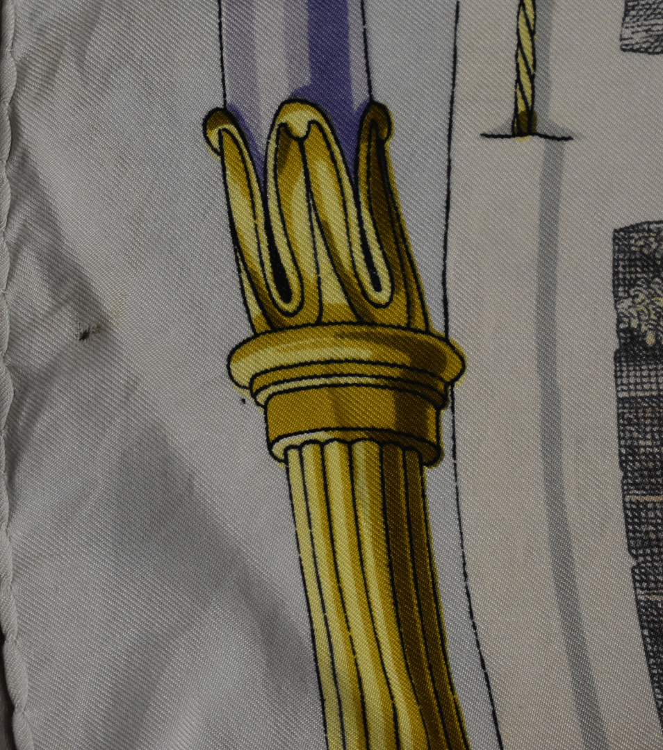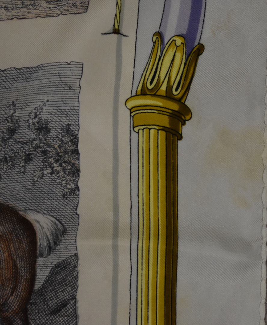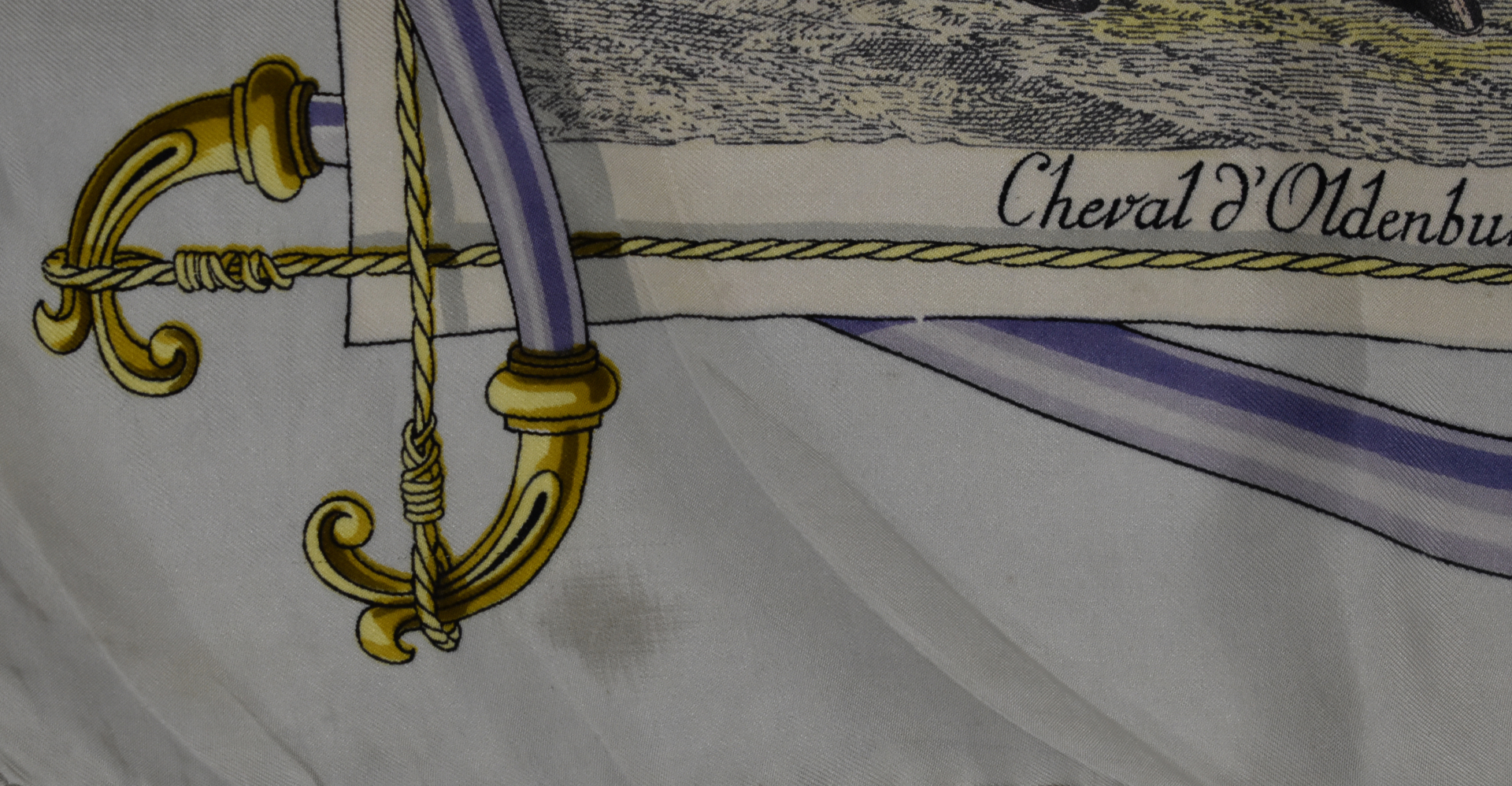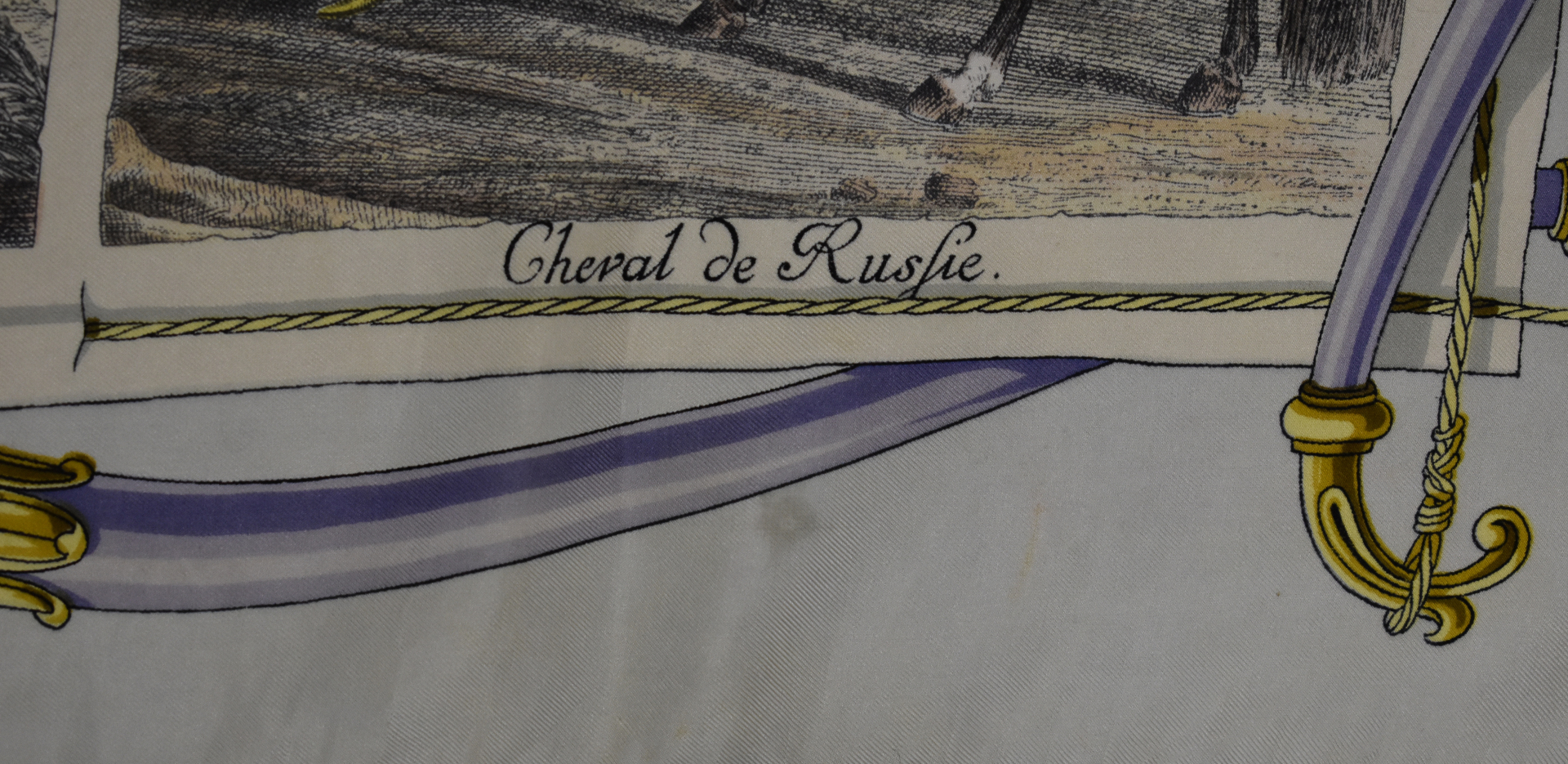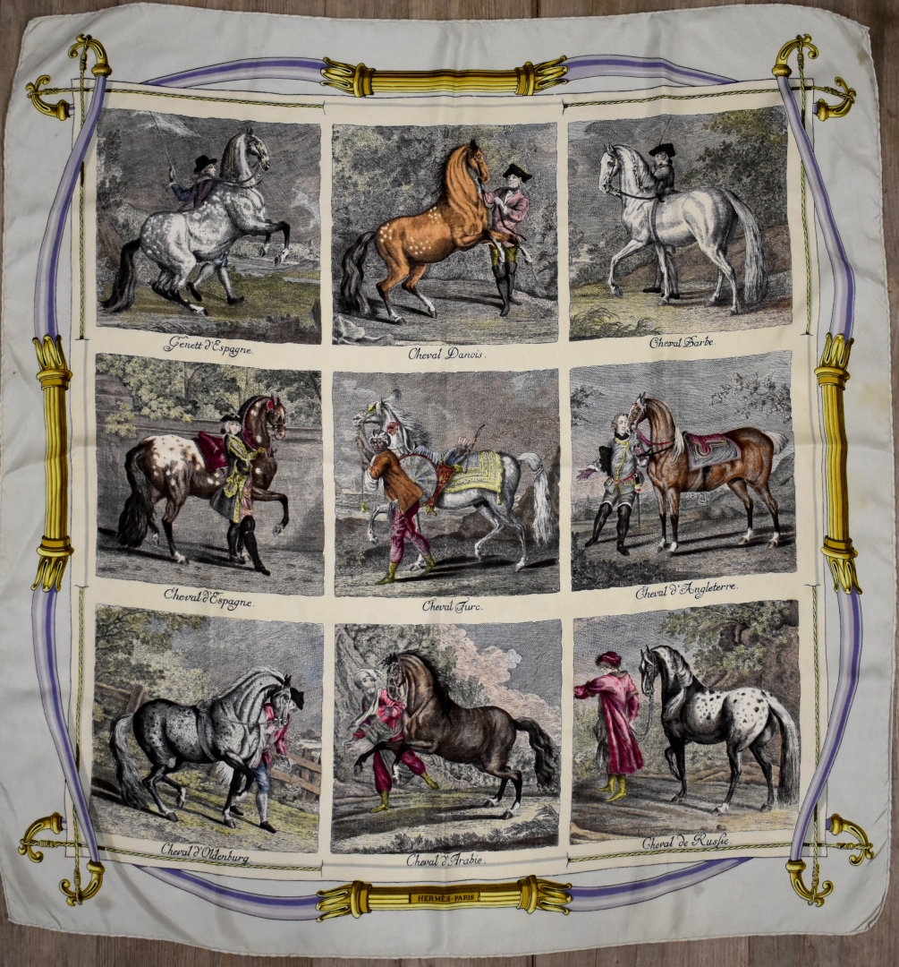HERMÈS PARIS. Carré de soie à décor polychrome de chevaux sur fond beige (tâches, percé). 90 x 90 cm.