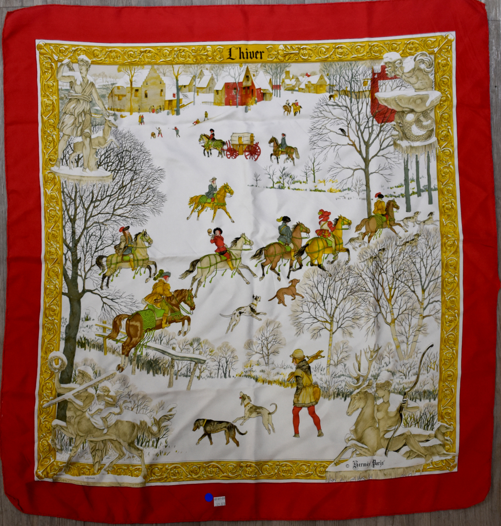 HERMES PARIS. Carré de soie « L’hiver » par Ledoux (usures). 90 x 90 cm.