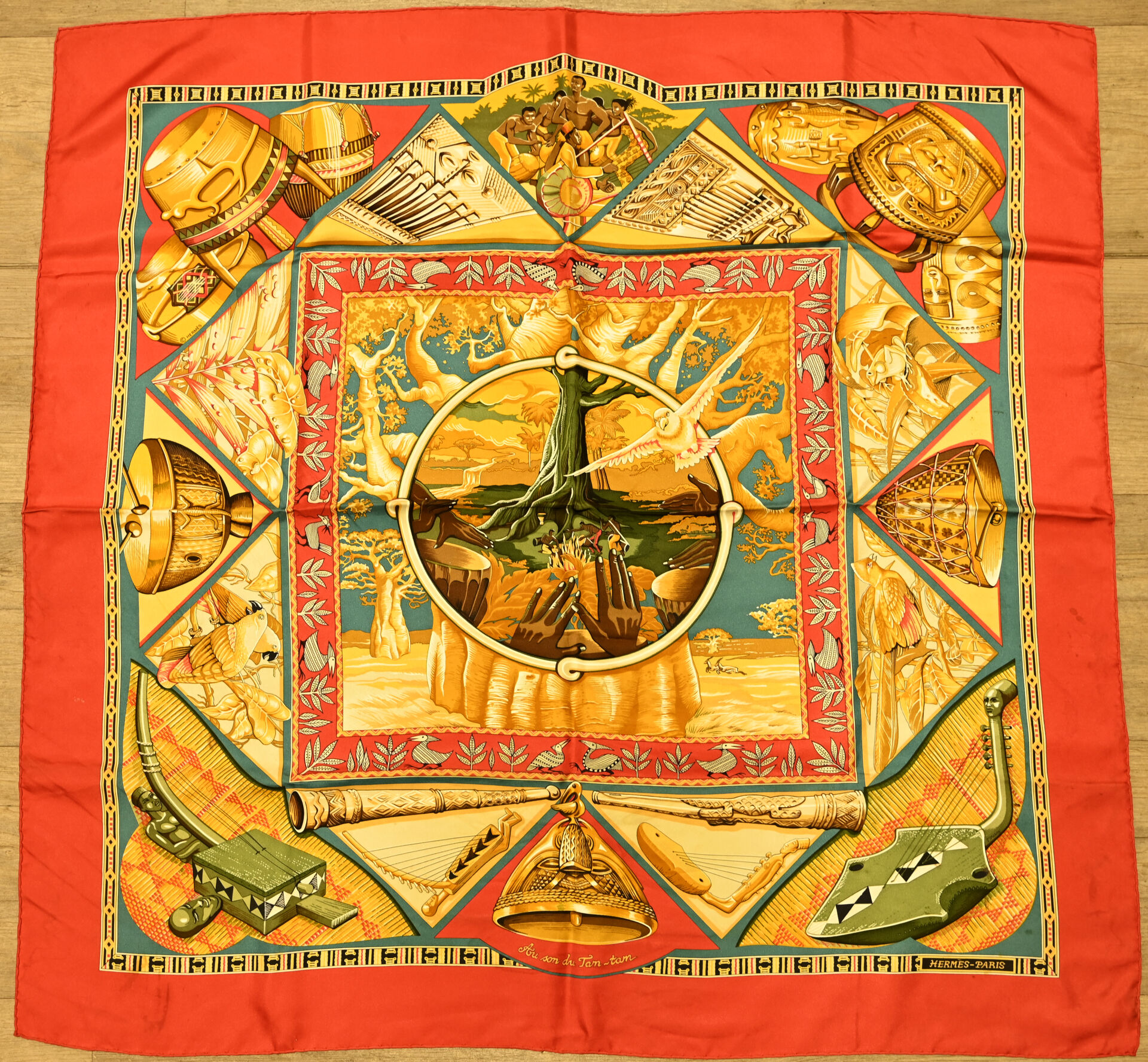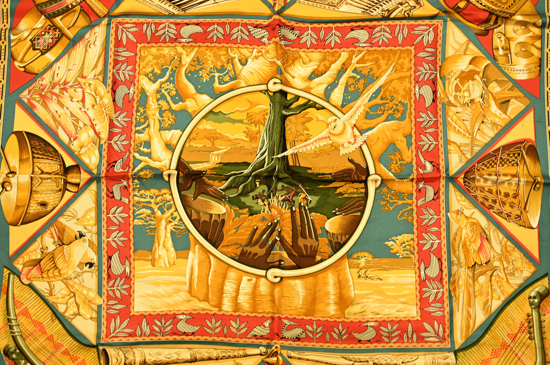 HERMES PARIS. Carré de soie modèle « Au son du tam-tam » d’après Bourthoumieux à décor polychrome sur bordure rouge (taches). 90 x 90 cm. Boite (déchirures).