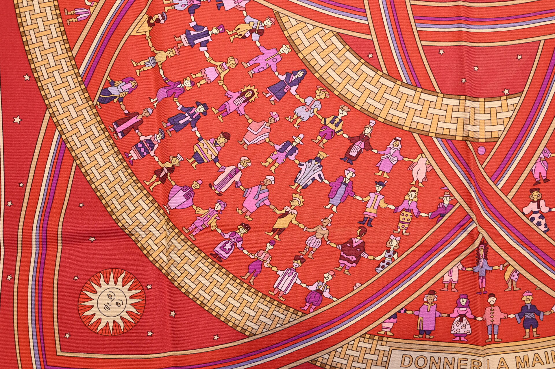 HERMES PARIS. Carré de soie modèle « Donner la main » d’après Karen Petrossian en 2002 à décor en rouge, or et violet sur fond rouge (petites taches, quelques fils tirés). Marqué. 90 x 90 cm. Boite.