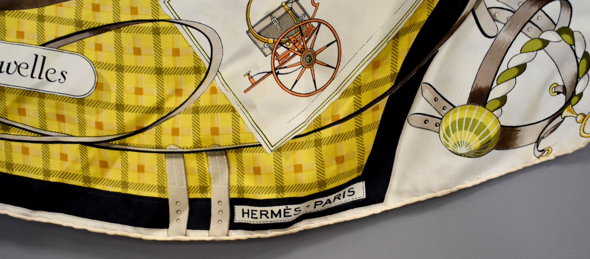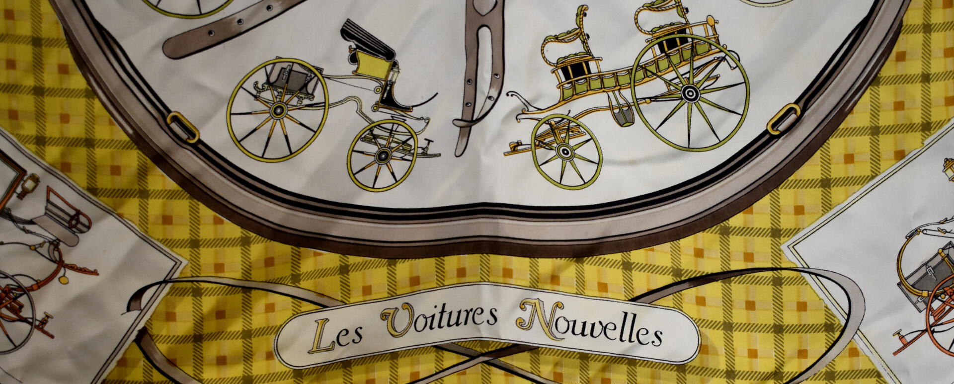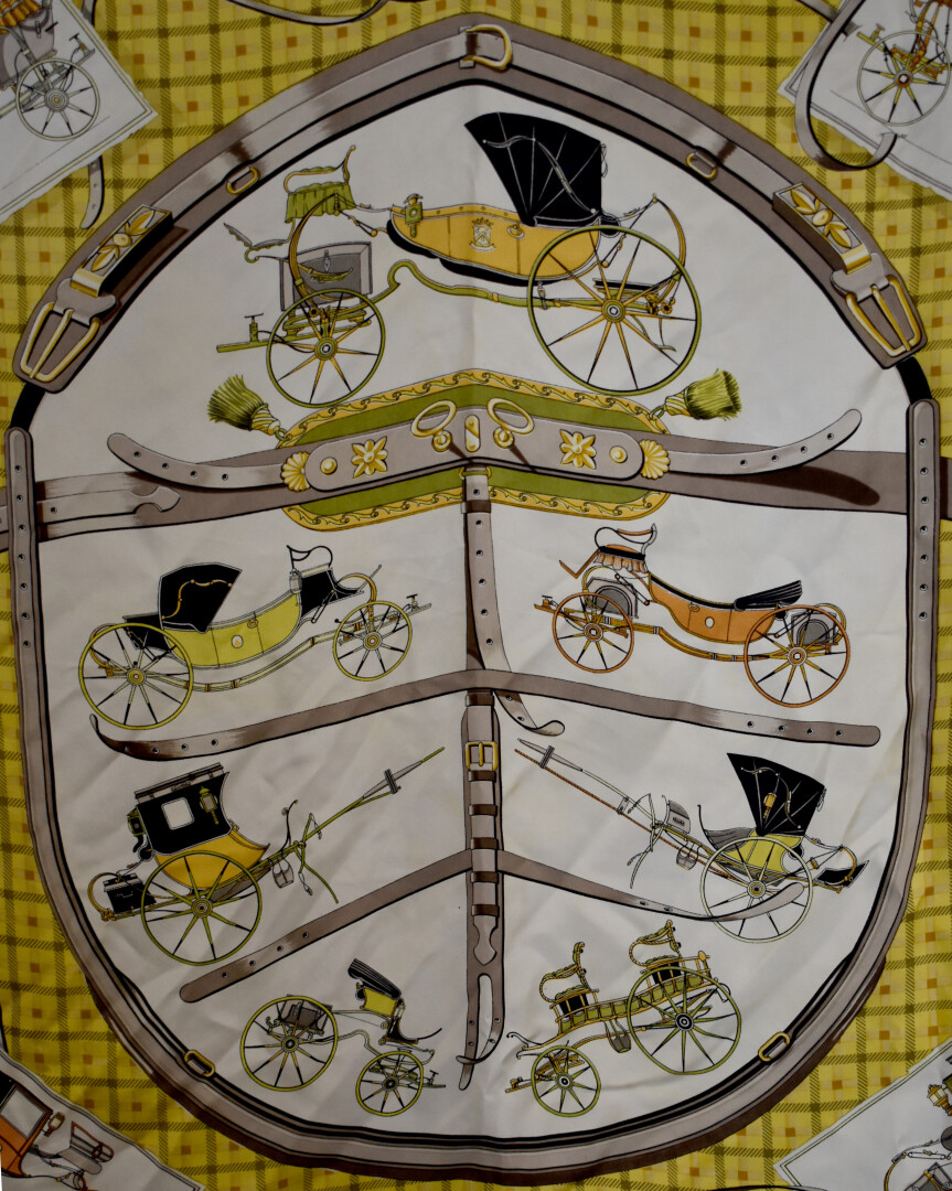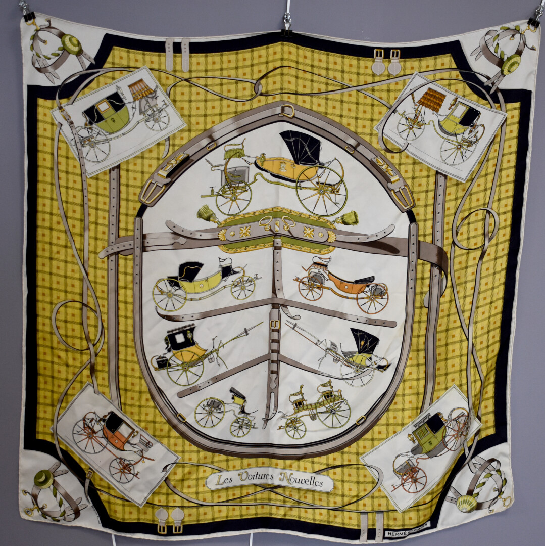 HERMÈS PARIS. Carré de soie modèle « Les voitures nouvelles » dans les tons ocre, jaune et noir (taches). 90 x 90 cm.