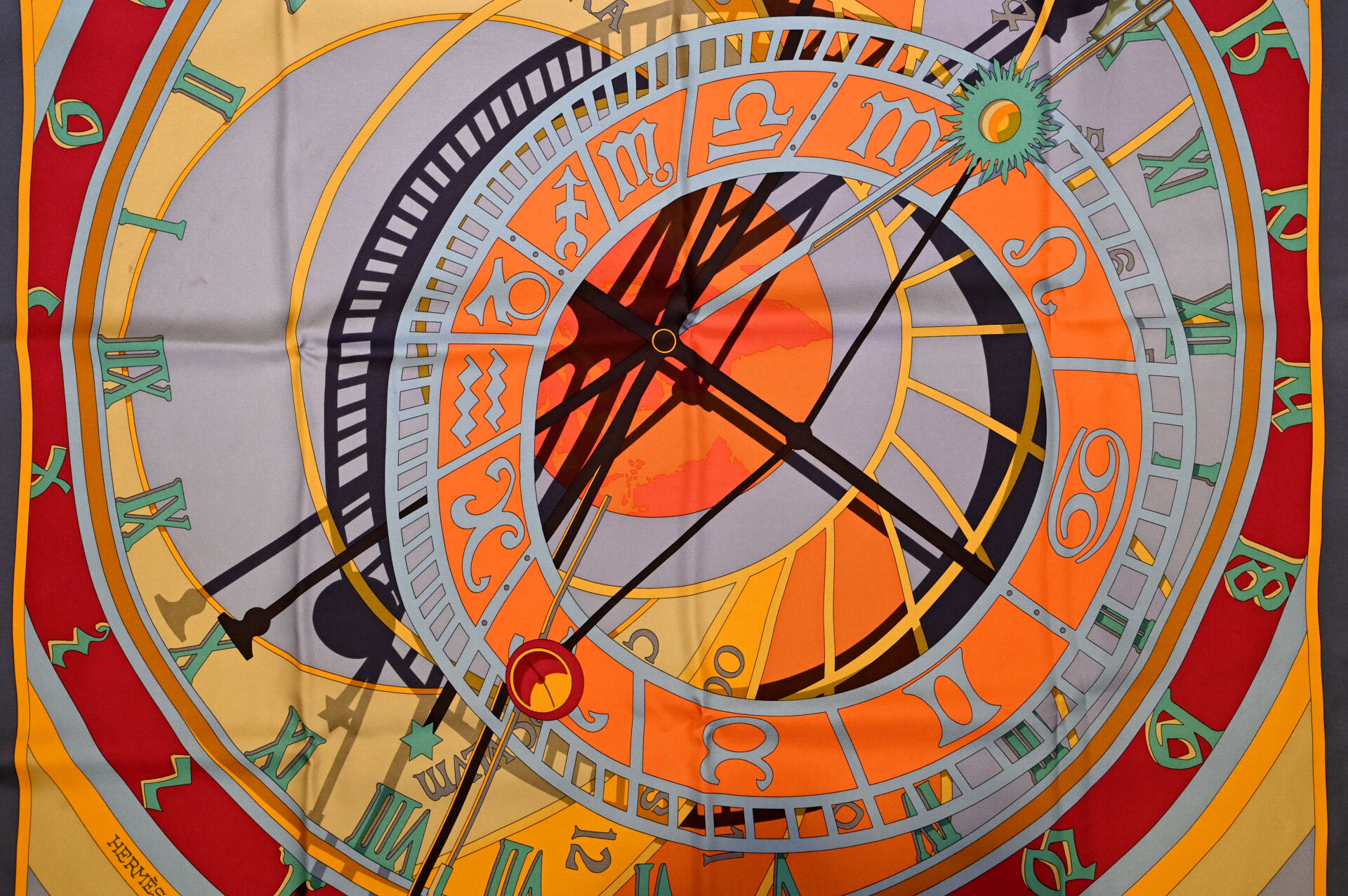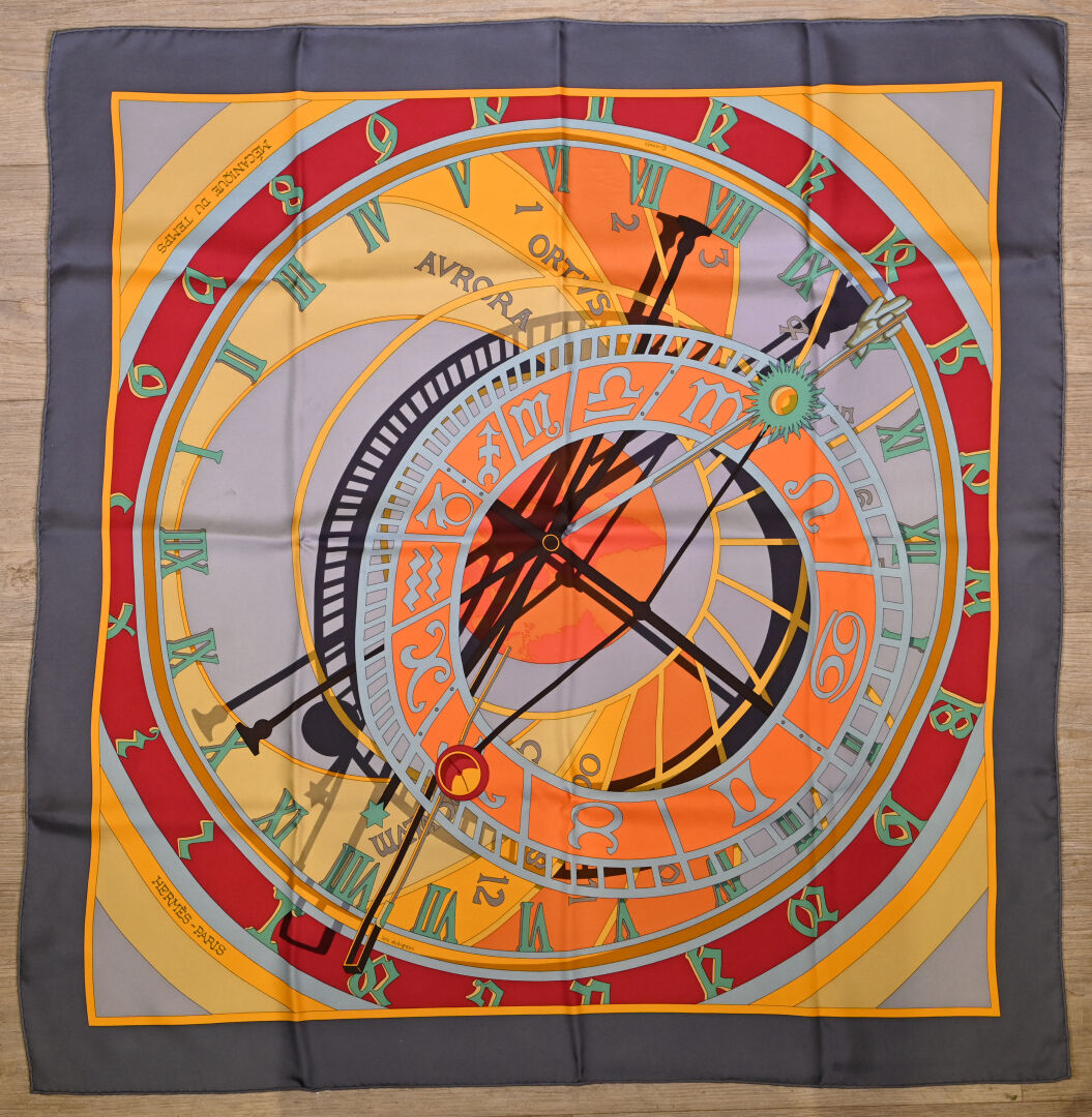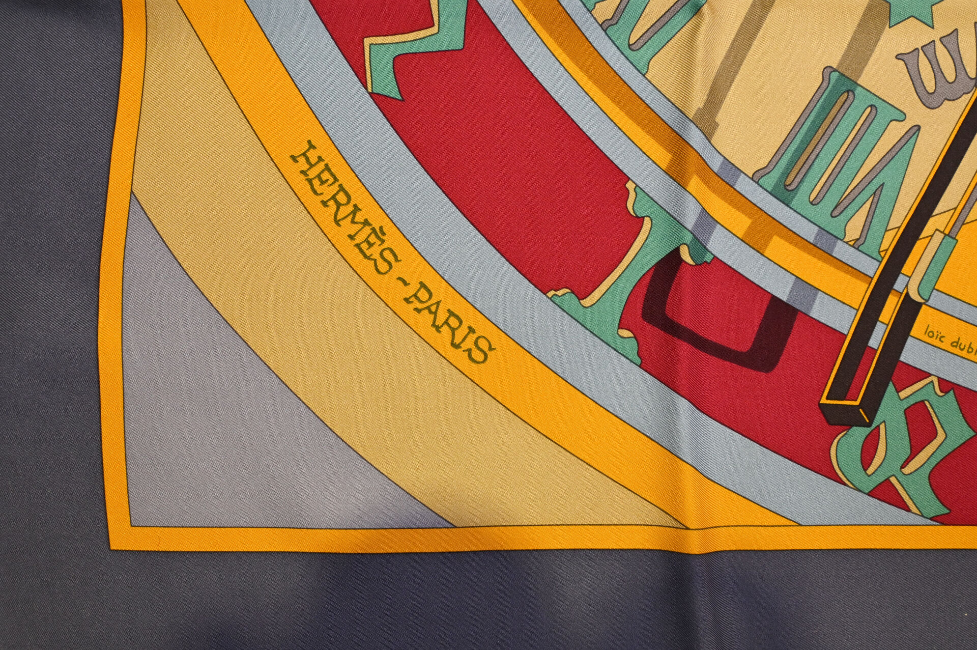 HERMES PARIS. Carré de soie modèle « Mécanique du temps » à décor en rouge, orange et noir sur fond gris (petites taches, quelques fils tirés). Marqué. 90 x 90 cm. Boite.