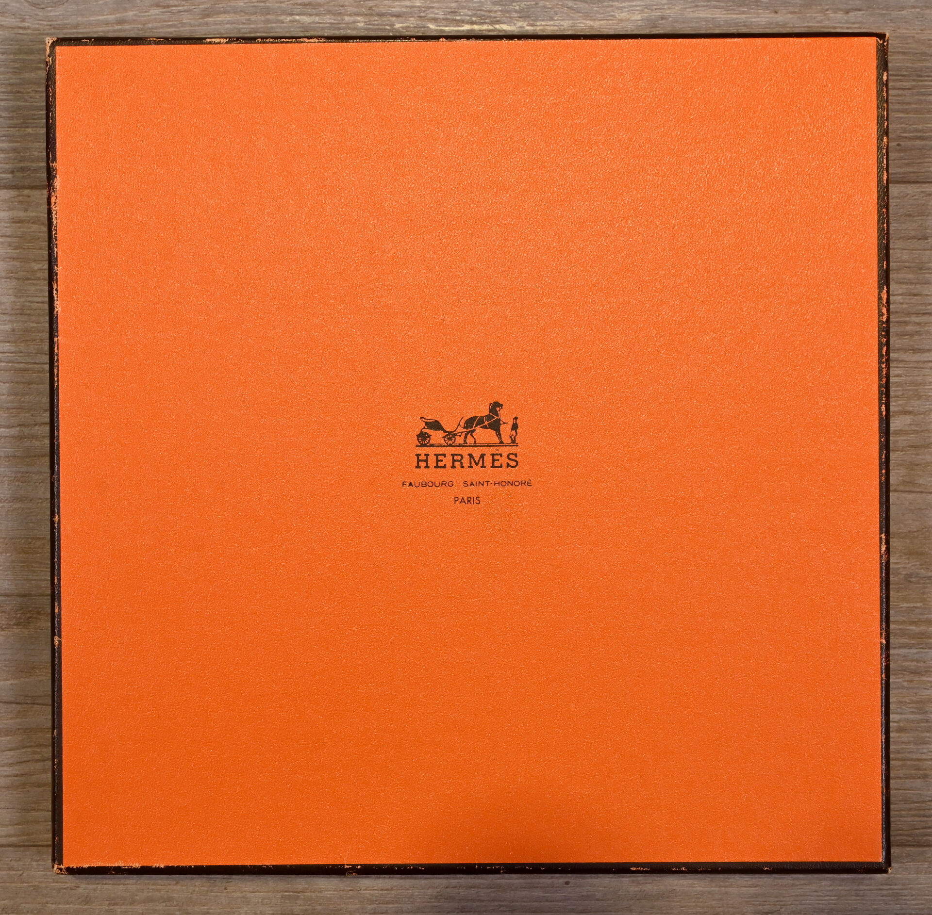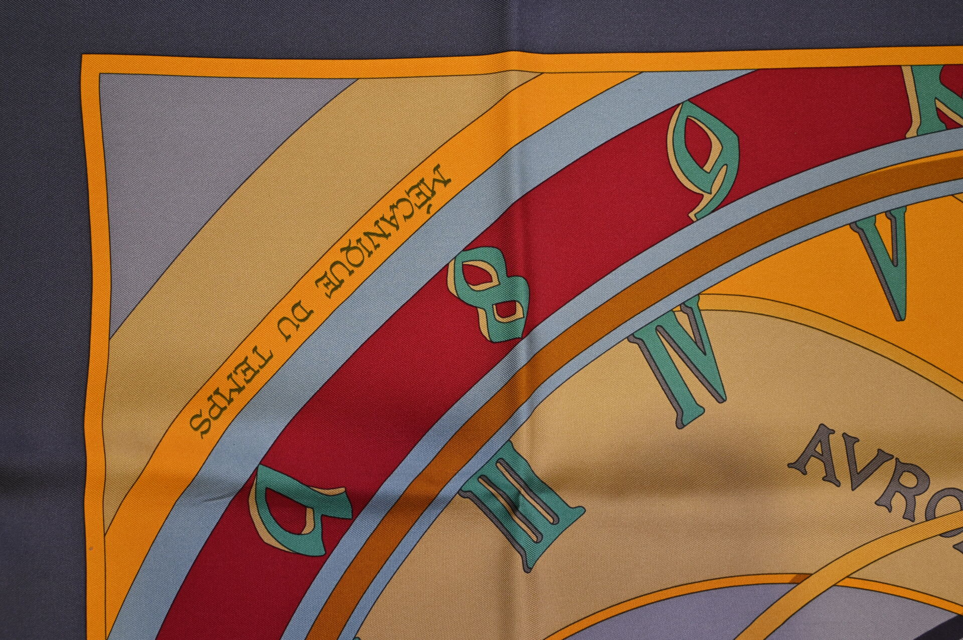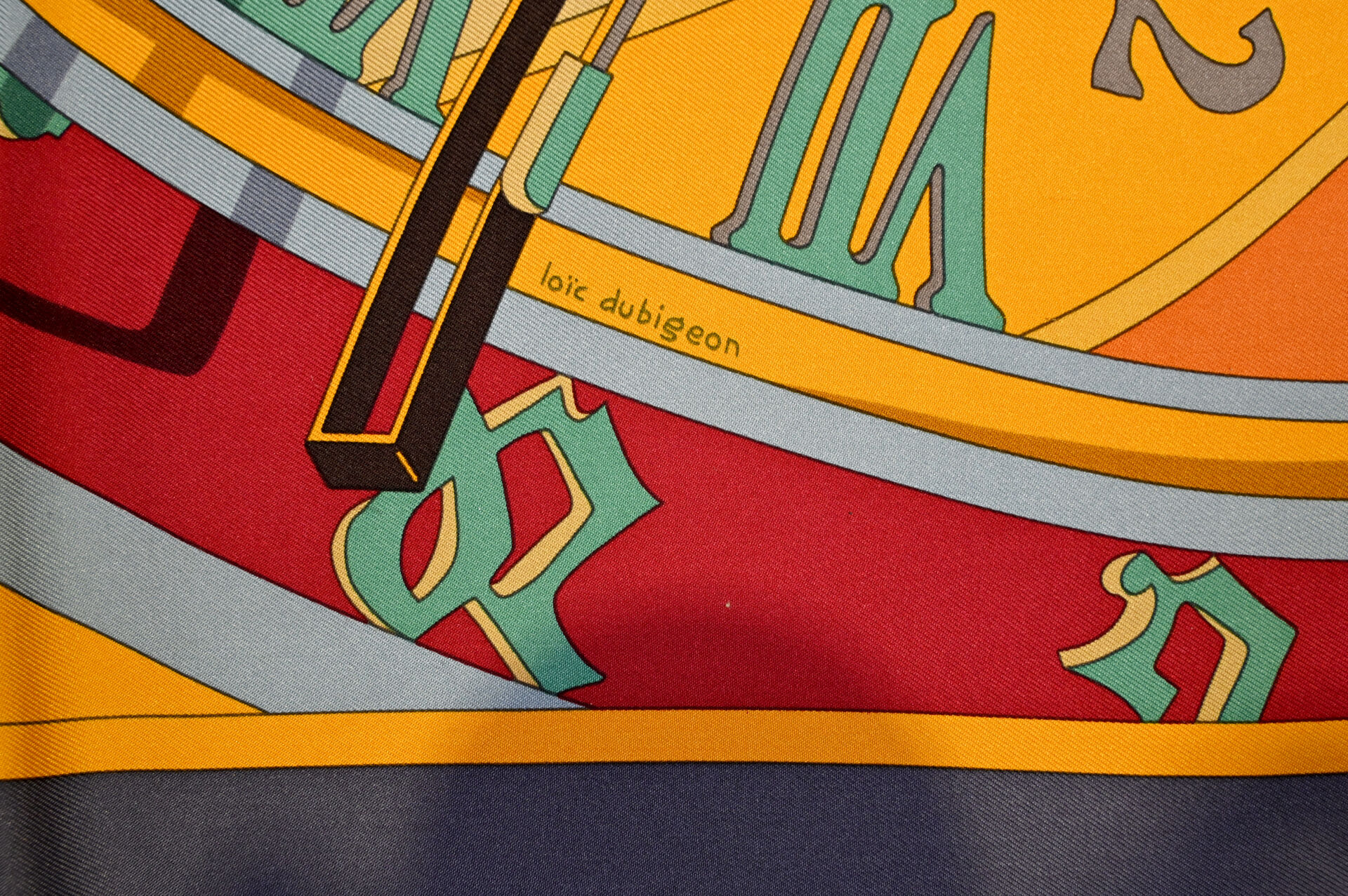 HERMES PARIS. Carré de soie modèle « Mécanique du temps » à décor en rouge, orange et noir sur fond gris (petites taches, quelques fils tirés). Marqué. 90 x 90 cm. Boite.