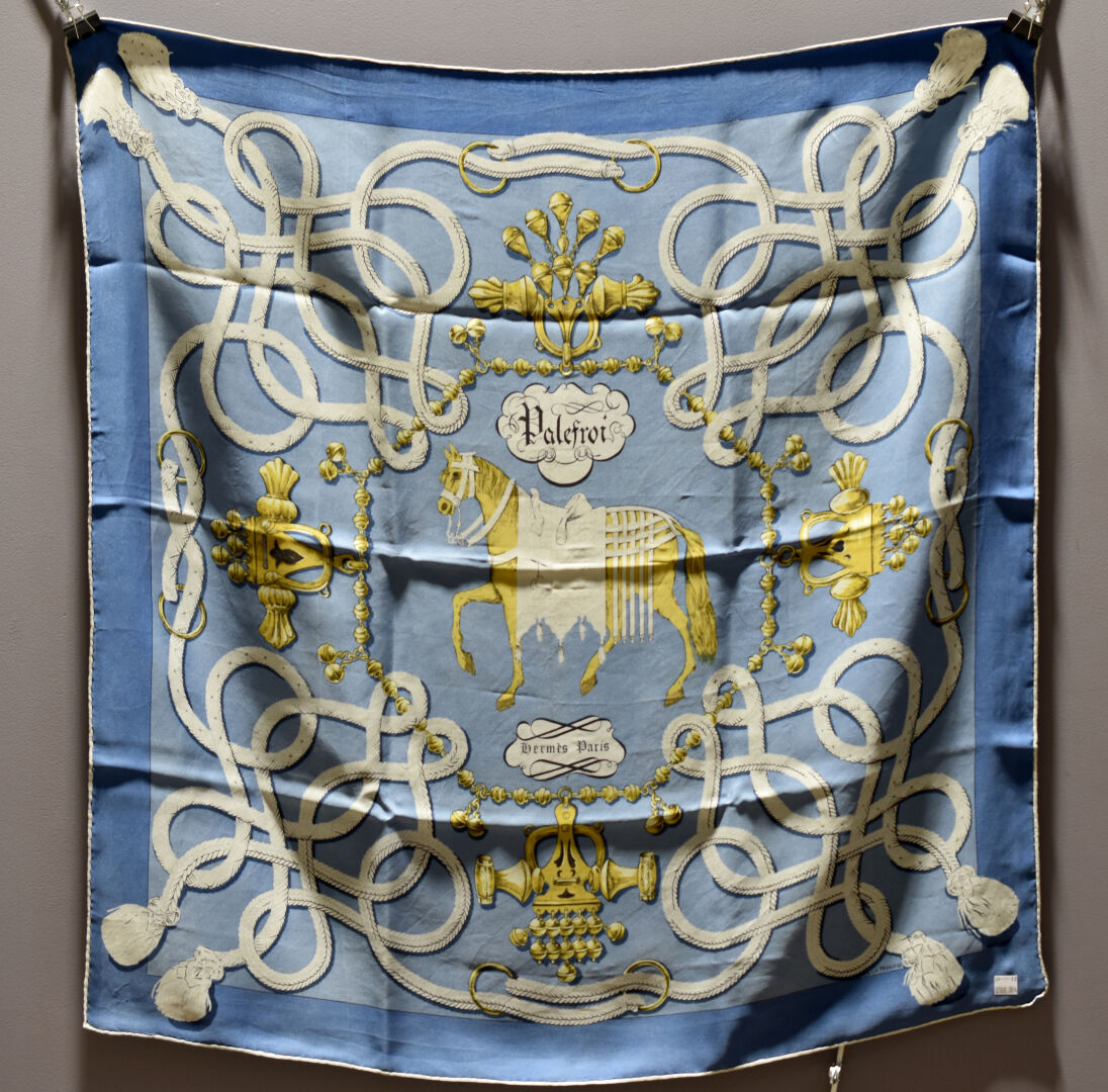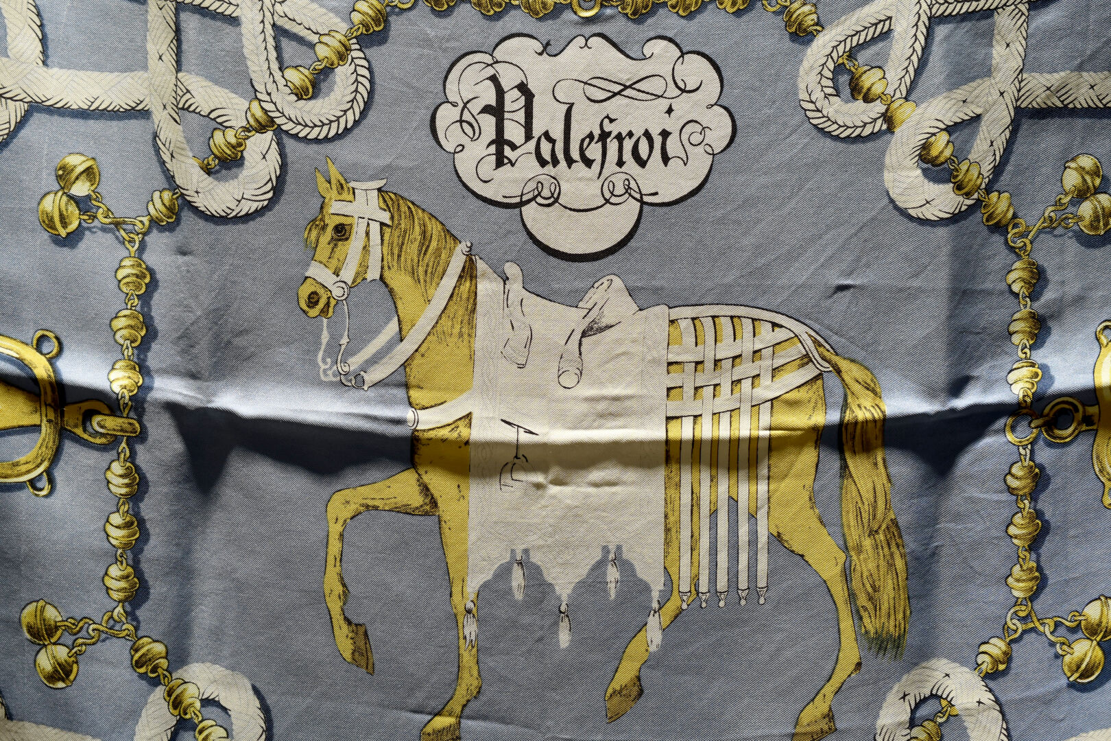 HERMES PARIS. Carré de soie modèle « Palefroi » (légères usures) à décor en blanc et or sur fond bleu. 90 x 90 cm.
