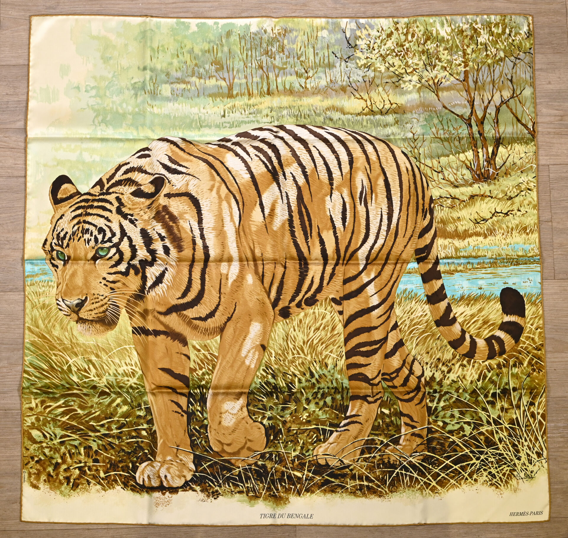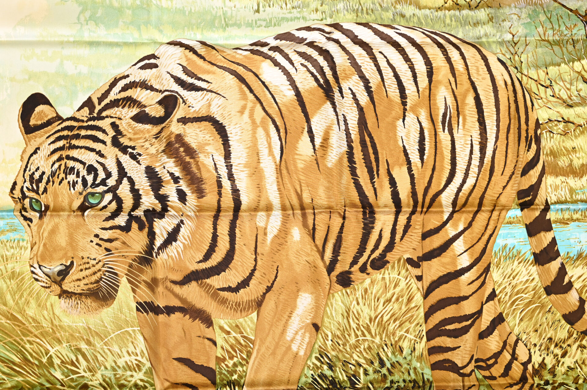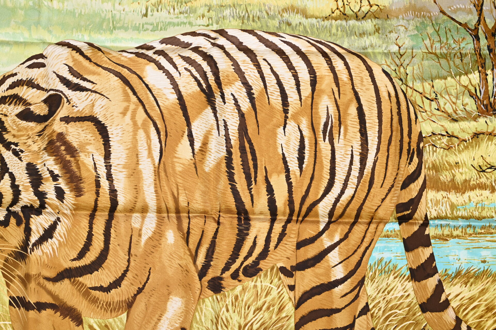 HERMES PARIS. Carré de soie modèle « Tigre de Bengale » à décor polychrome. Marqué. 90 x 90 cm. Boite.