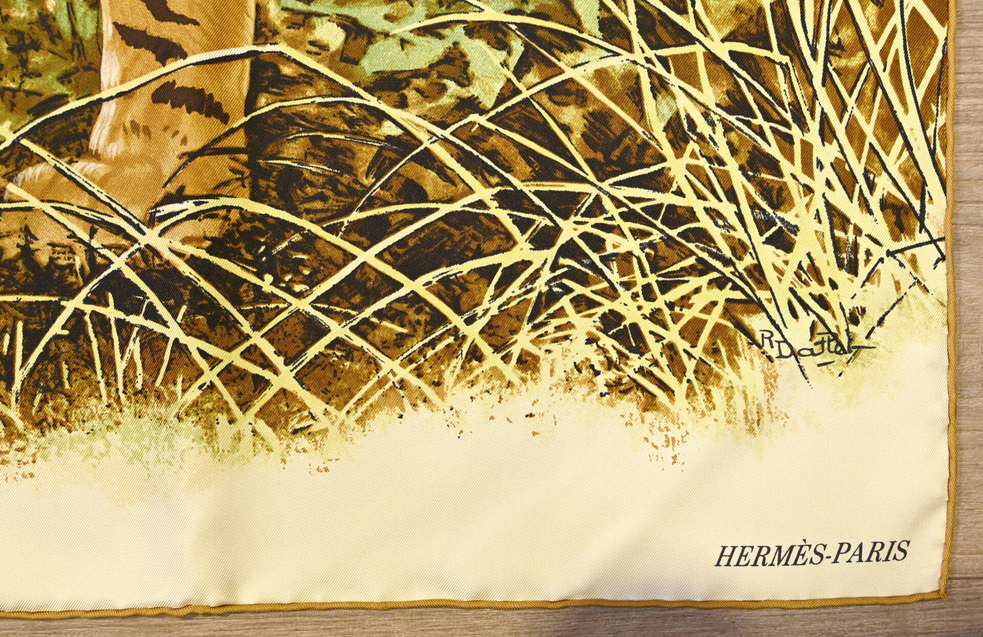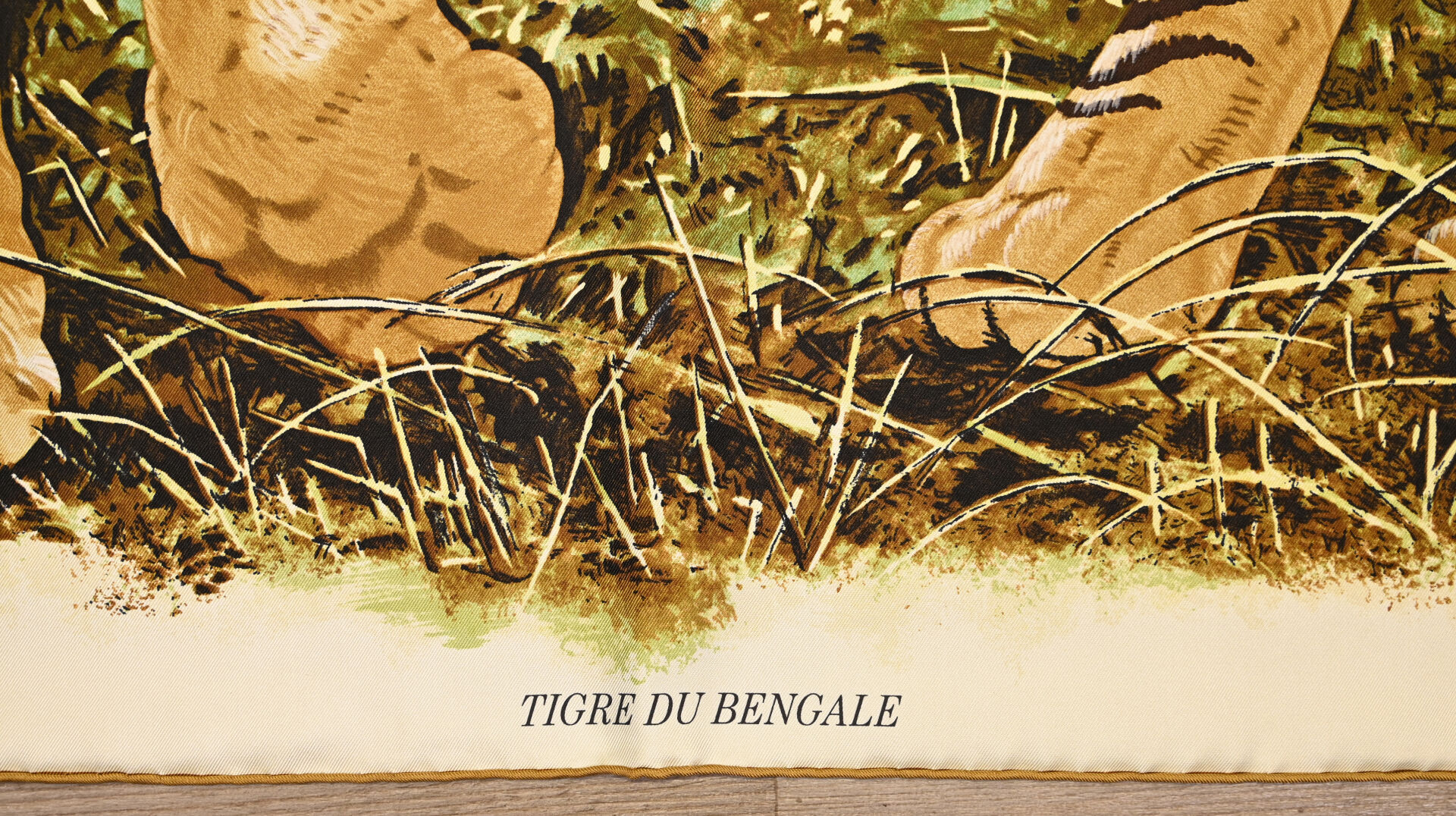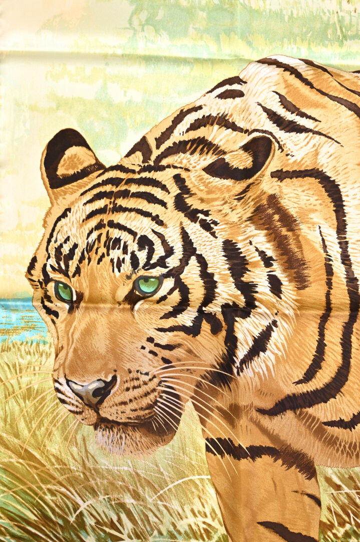 HERMES PARIS. Carré de soie modèle « Tigre de Bengale » à décor polychrome. Marqué. 90 x 90 cm. Boite.