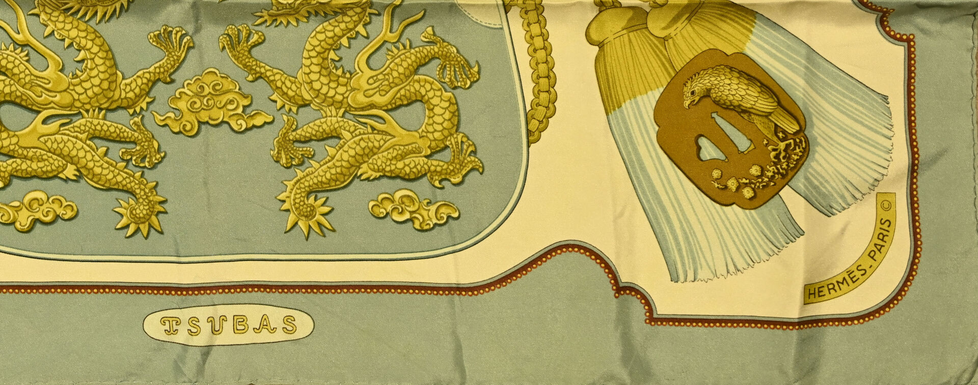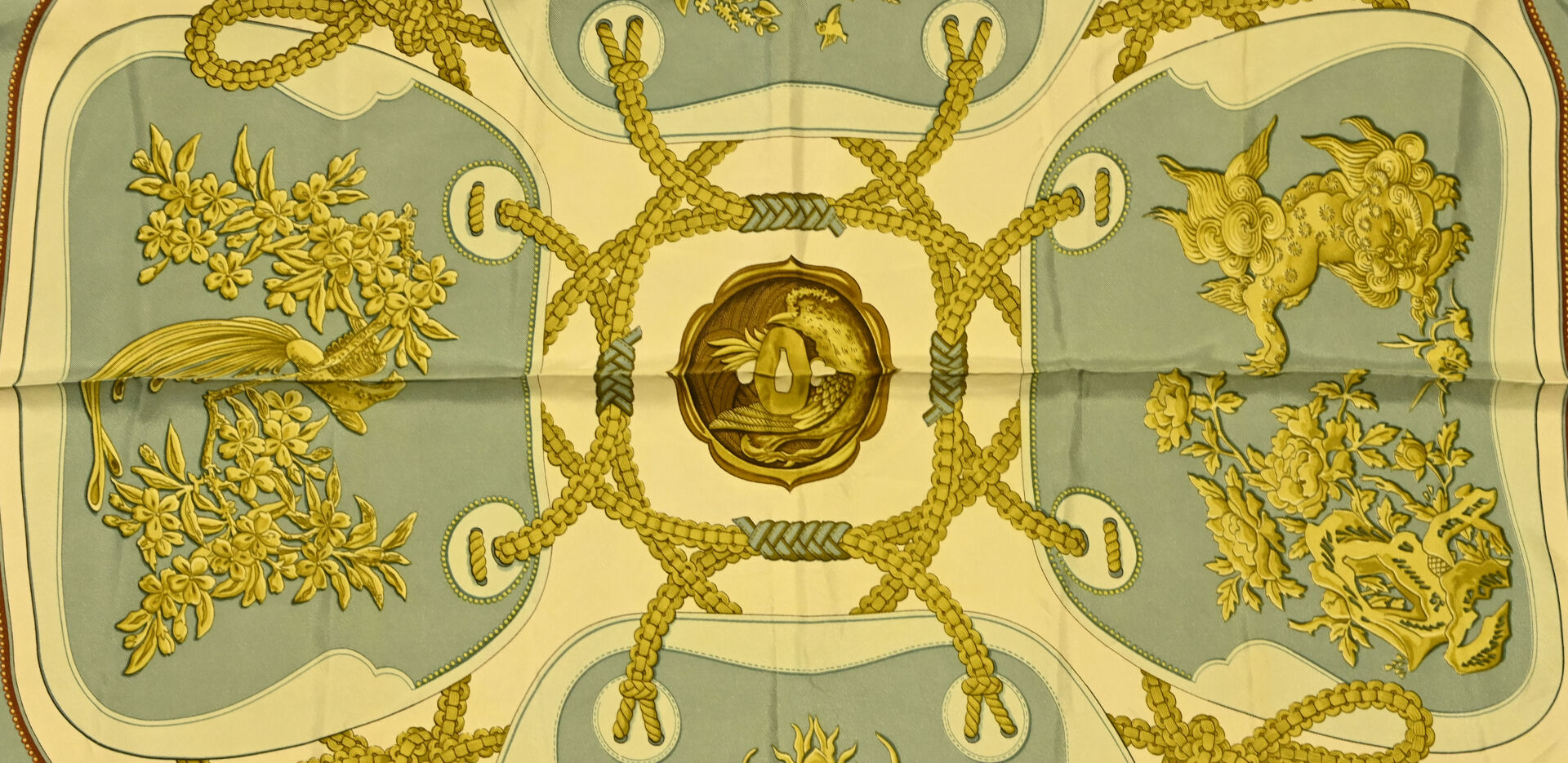 HERMES PARIS. Carré de soie modèle « Tsubas » à décor en camaïeu ocre et beige, la bordure bleu ciel (légèrement jauni, petites usures). 90 x 90 cm.