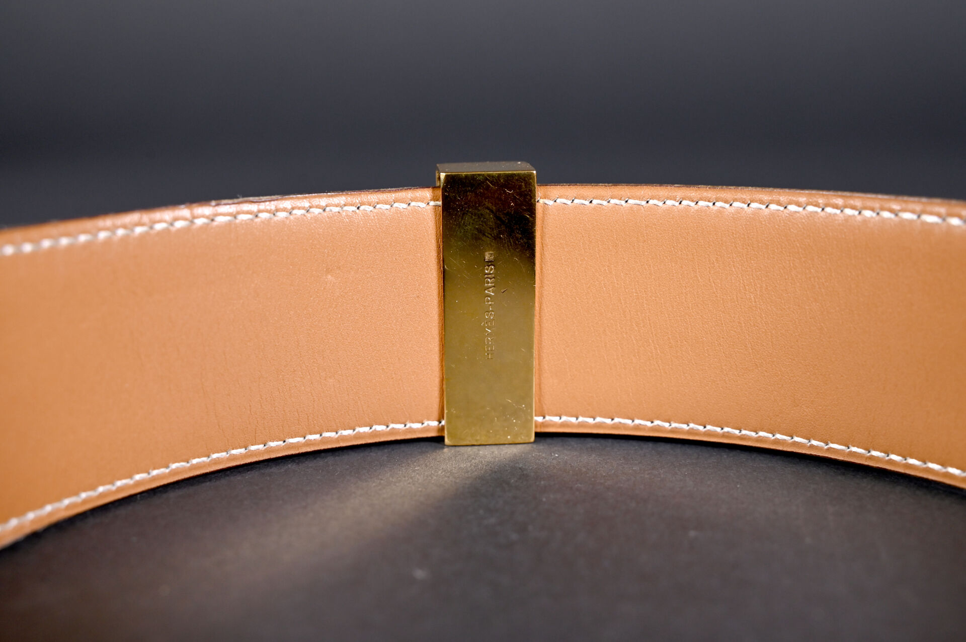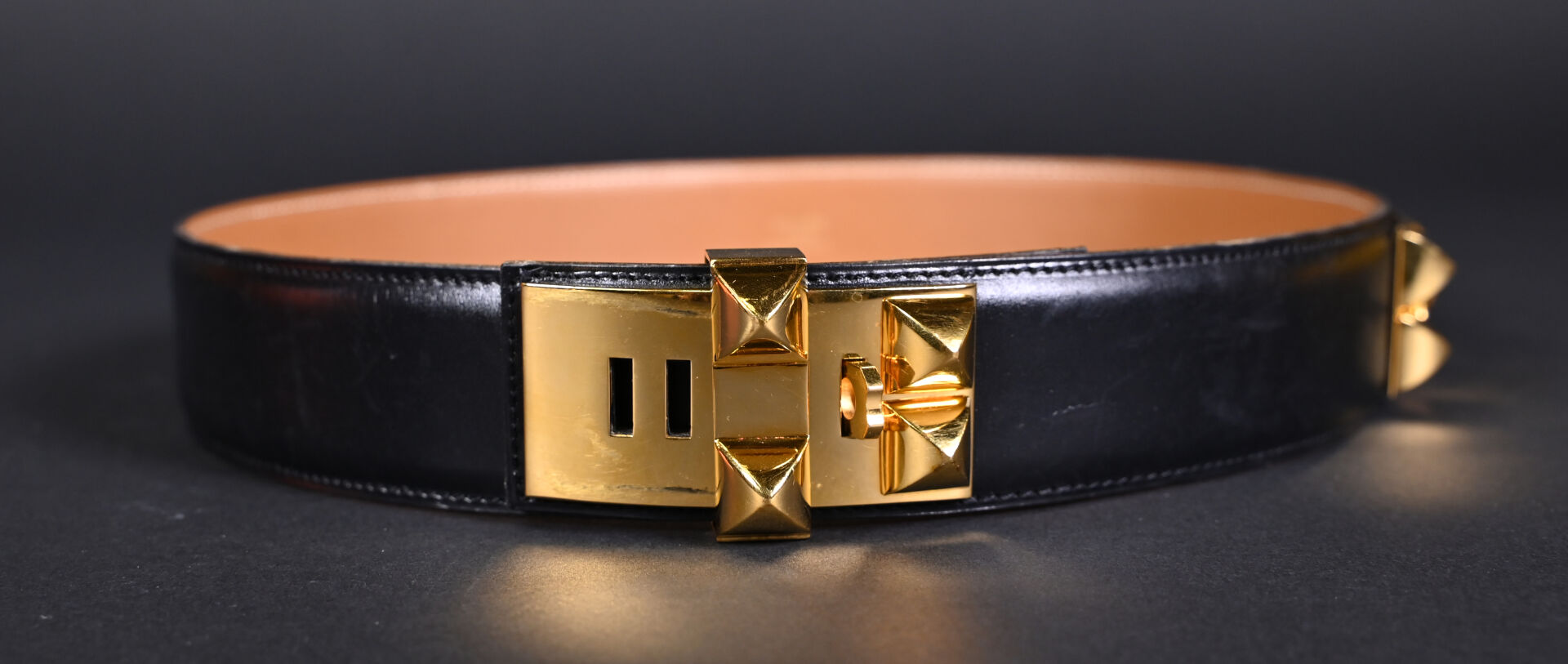 HERMES PARIS. Ceinture modèle Médor en noir et or (quelques usures, frottements sur la boucle) taille 78, numérotée U+. Long. : 83 cm. Boîte.