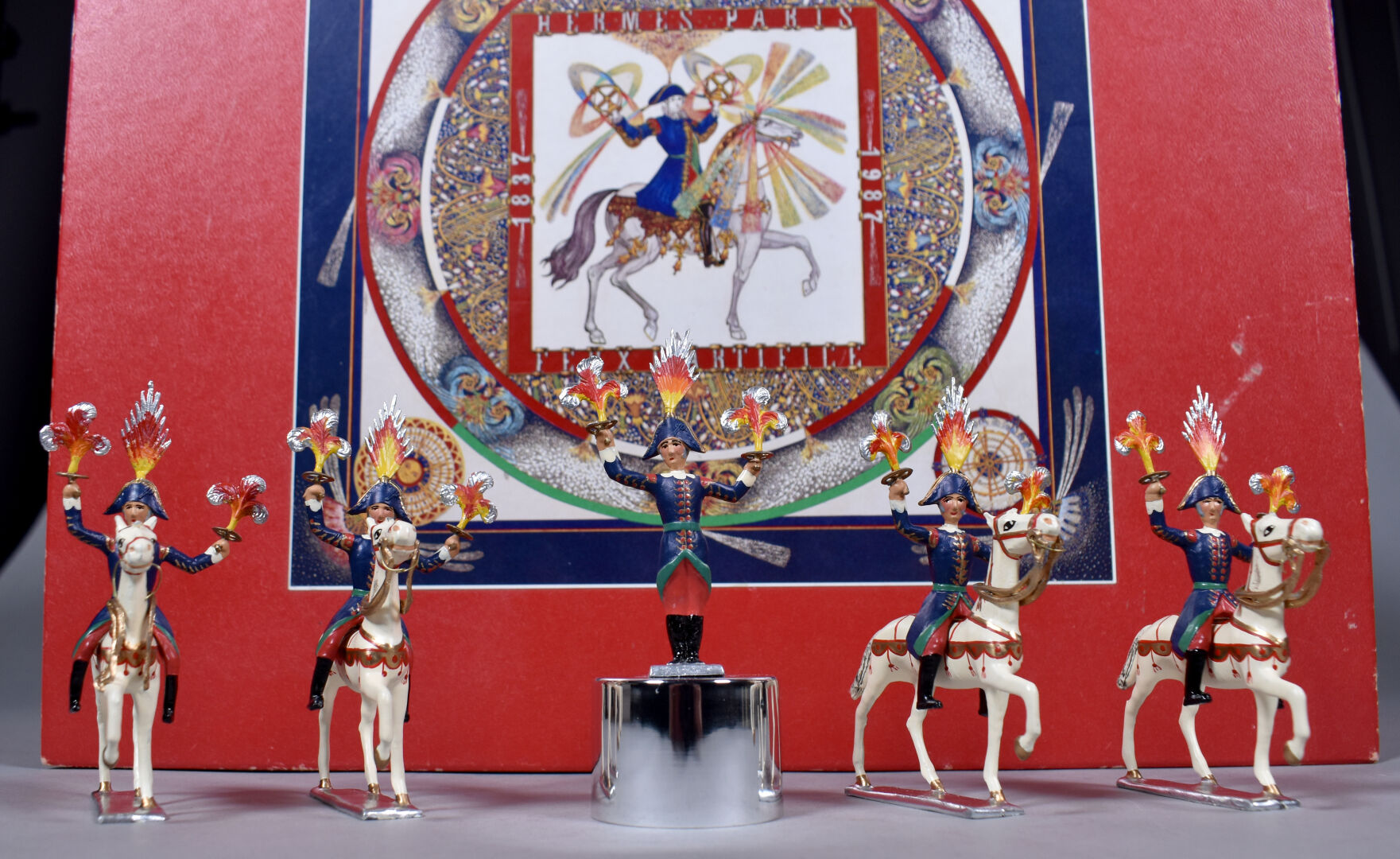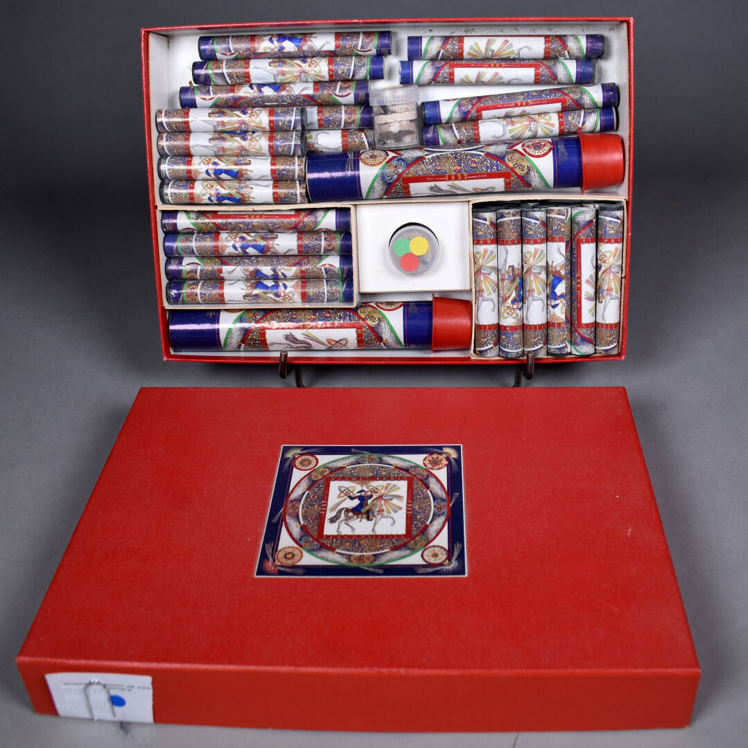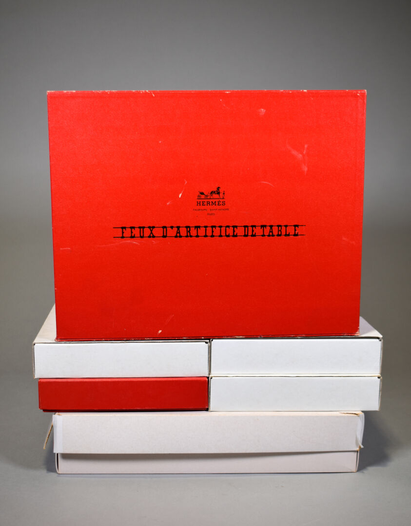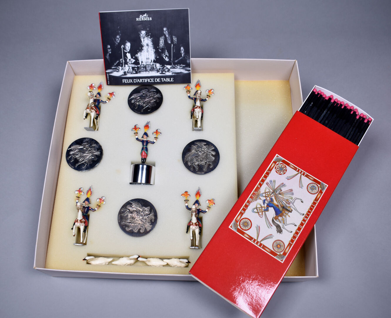 HERMES PARIS. Centre de table « Feux d’Artifice » avec différents éléments de décor à poser, quatre artificiers en plomb, un artificier sur un socle, quatre cygnes, quatre coupelles en métal chromé sur une base centrale en carton recouvert de papier argenté miroir et doré. Les colonnes sont constituées de fontaines scintillantes. 2 Boîtes d’origines et 3 boîtes de recharges et 1 boîte entamée.