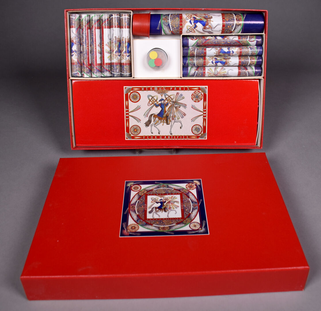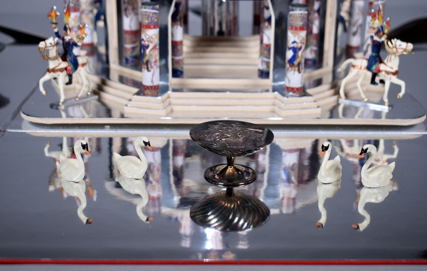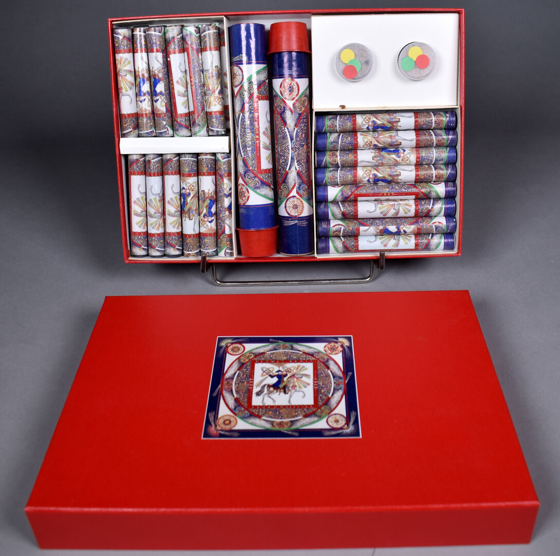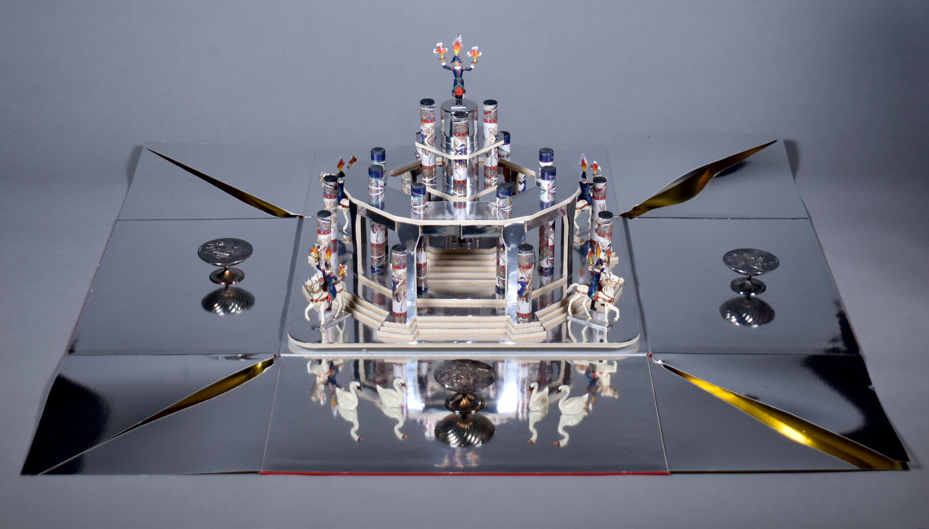 HERMES PARIS. Centre de table « Feux d’Artifice » avec différents éléments de décor à poser, quatre artificiers en plomb, un artificier sur un socle, quatre cygnes, quatre coupelles en métal chromé sur une base centrale en carton recouvert de papier argenté miroir et doré. Les colonnes sont constituées de fontaines scintillantes. 2 Boîtes d’origines et 3 boîtes de recharges et 1 boîte entamée.
