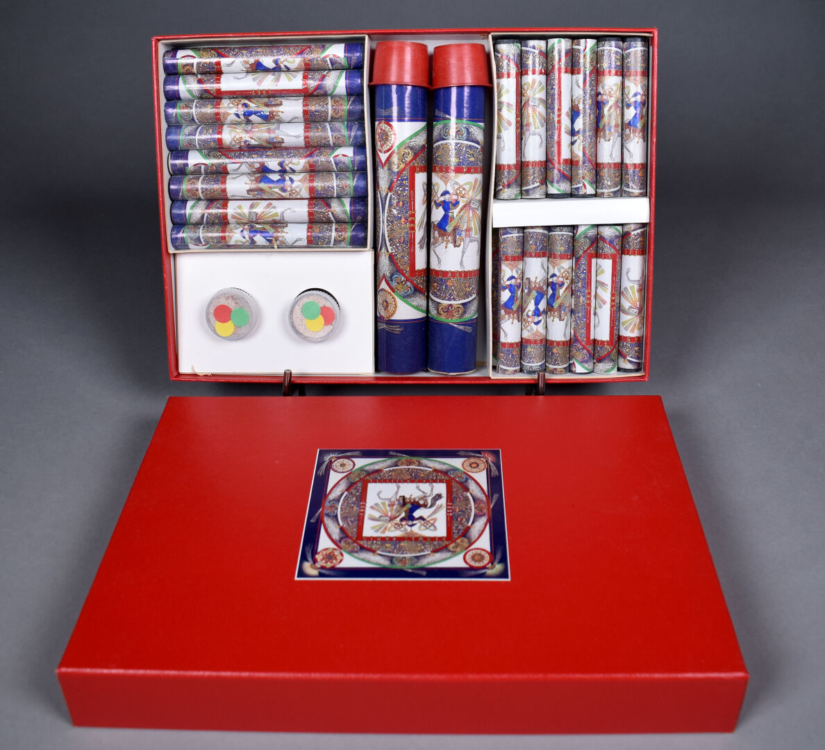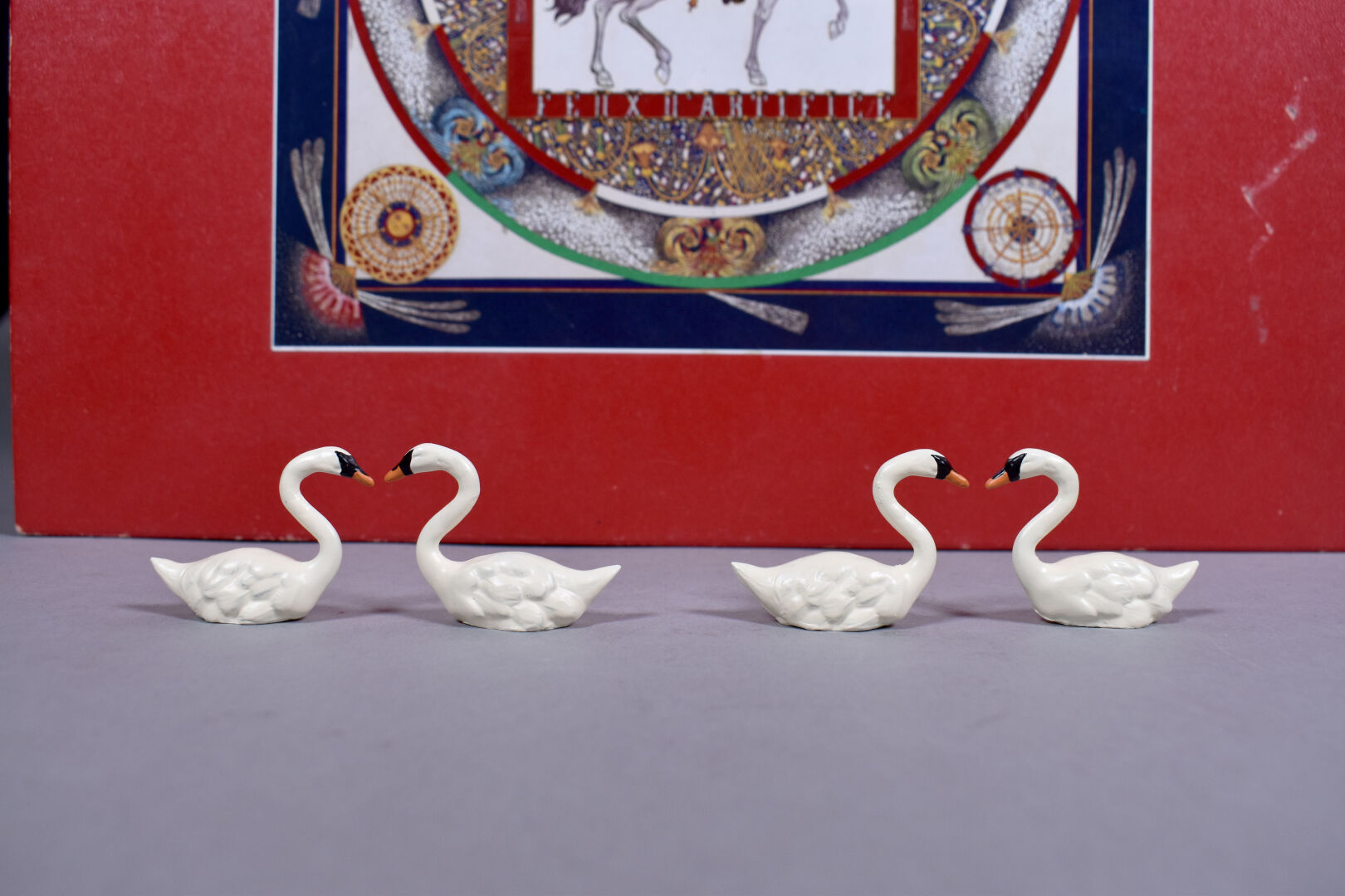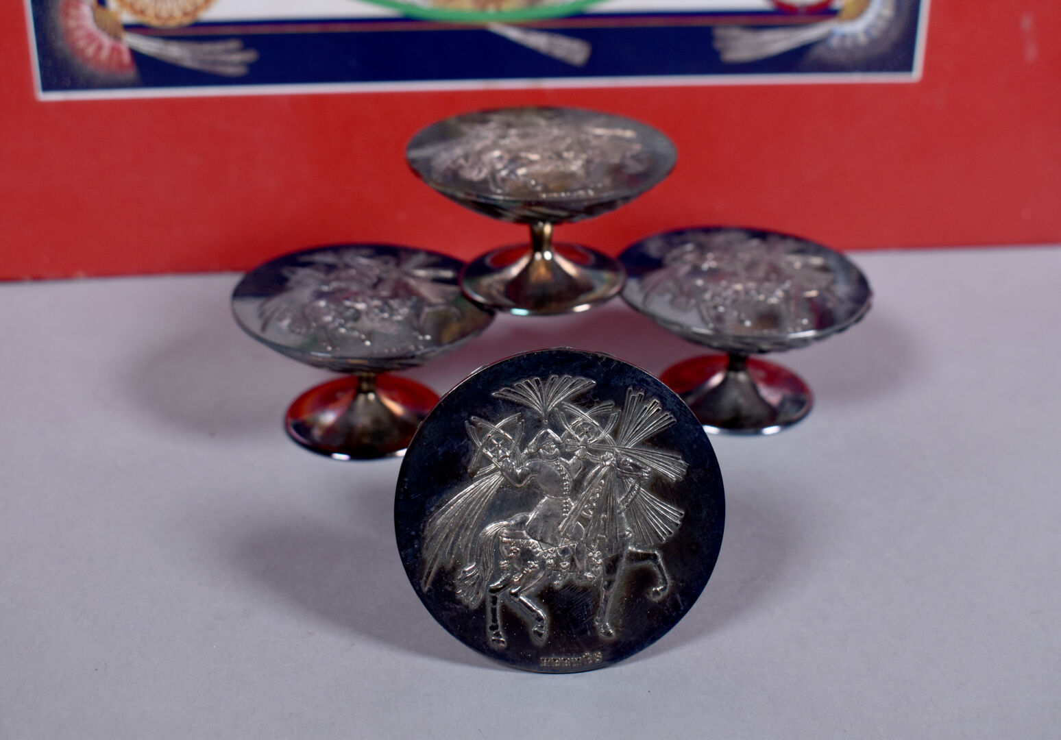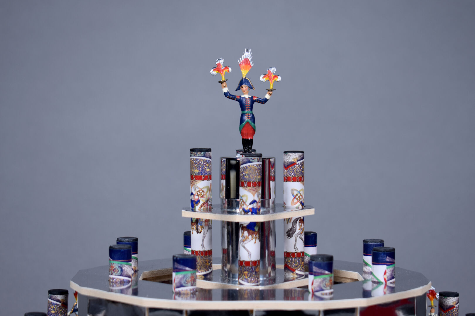 HERMES PARIS. Centre de table « Feux d’Artifice » avec différents éléments de décor à poser, quatre artificiers en plomb, un artificier sur un socle, quatre cygnes, quatre coupelles en métal chromé sur une base centrale en carton recouvert de papier argenté miroir et doré. Les colonnes sont constituées de fontaines scintillantes. 2 Boîtes d’origines et 3 boîtes de recharges et 1 boîte entamée.