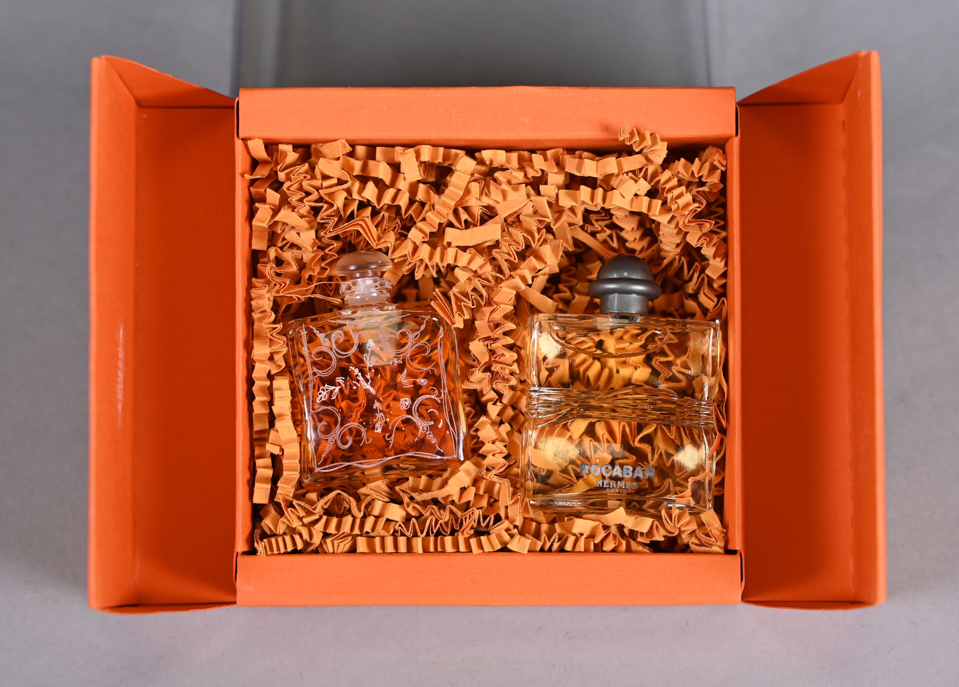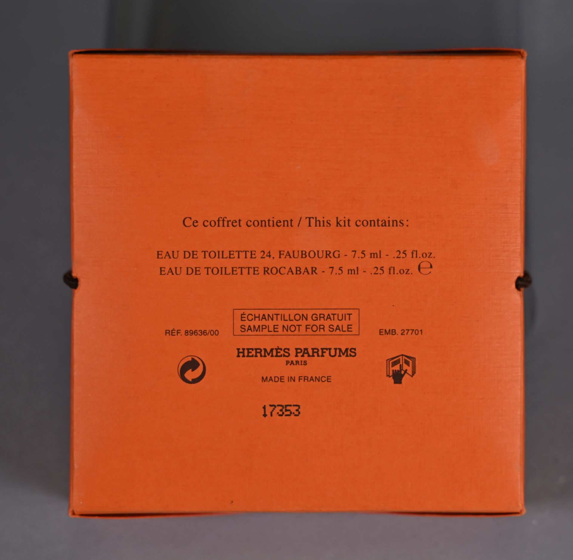HERMES Paris. Deux flacons miniature dans un coffret en carton orange soit ROCABAR et FAUBOURG (7,5ml chaque).
