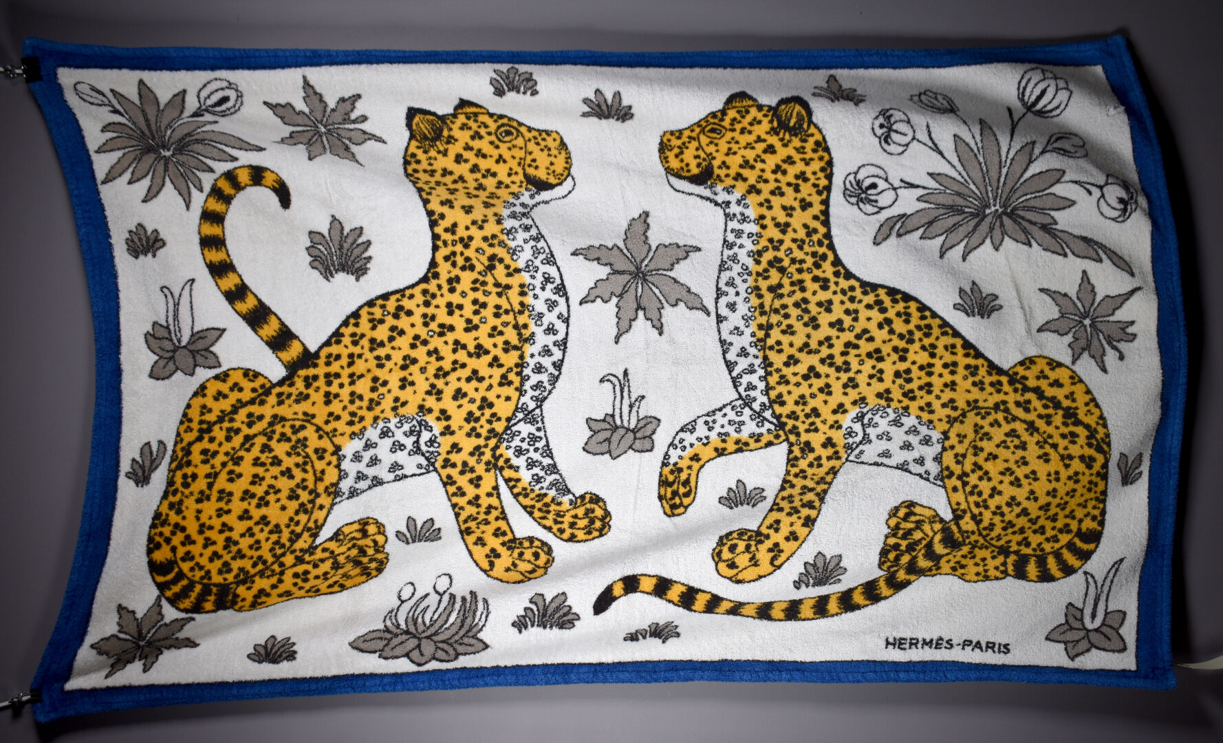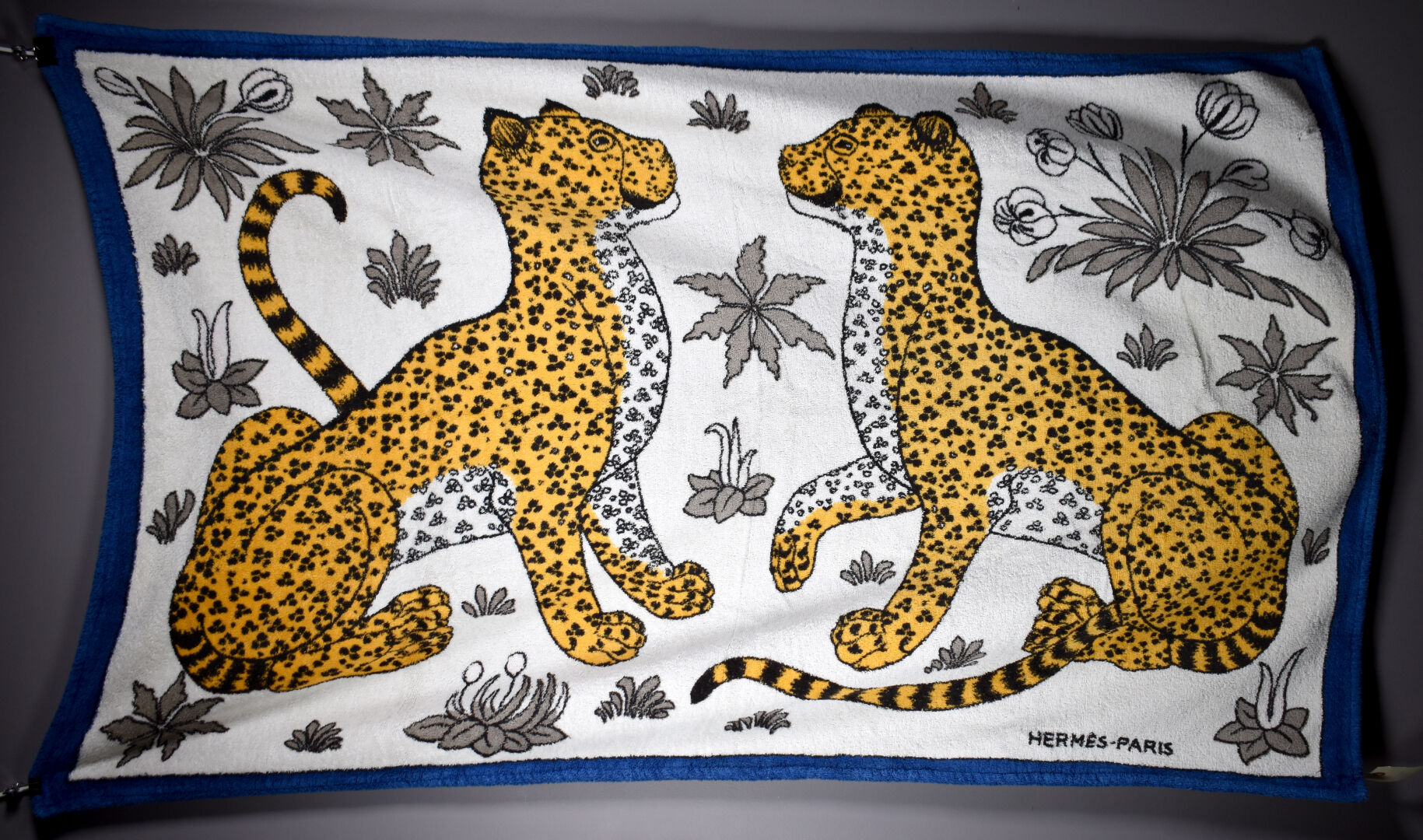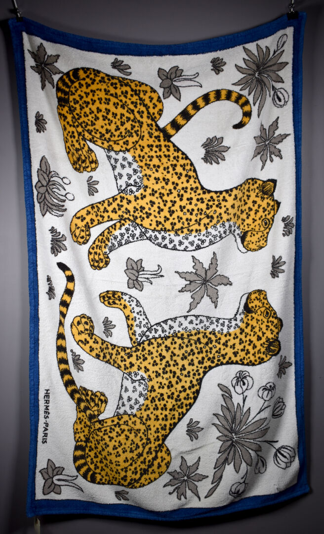 HERMES PARIS. Drap de bain en coton à décor de deux panthères, la bordure en bleu (un trou). 140 x 90 cm.