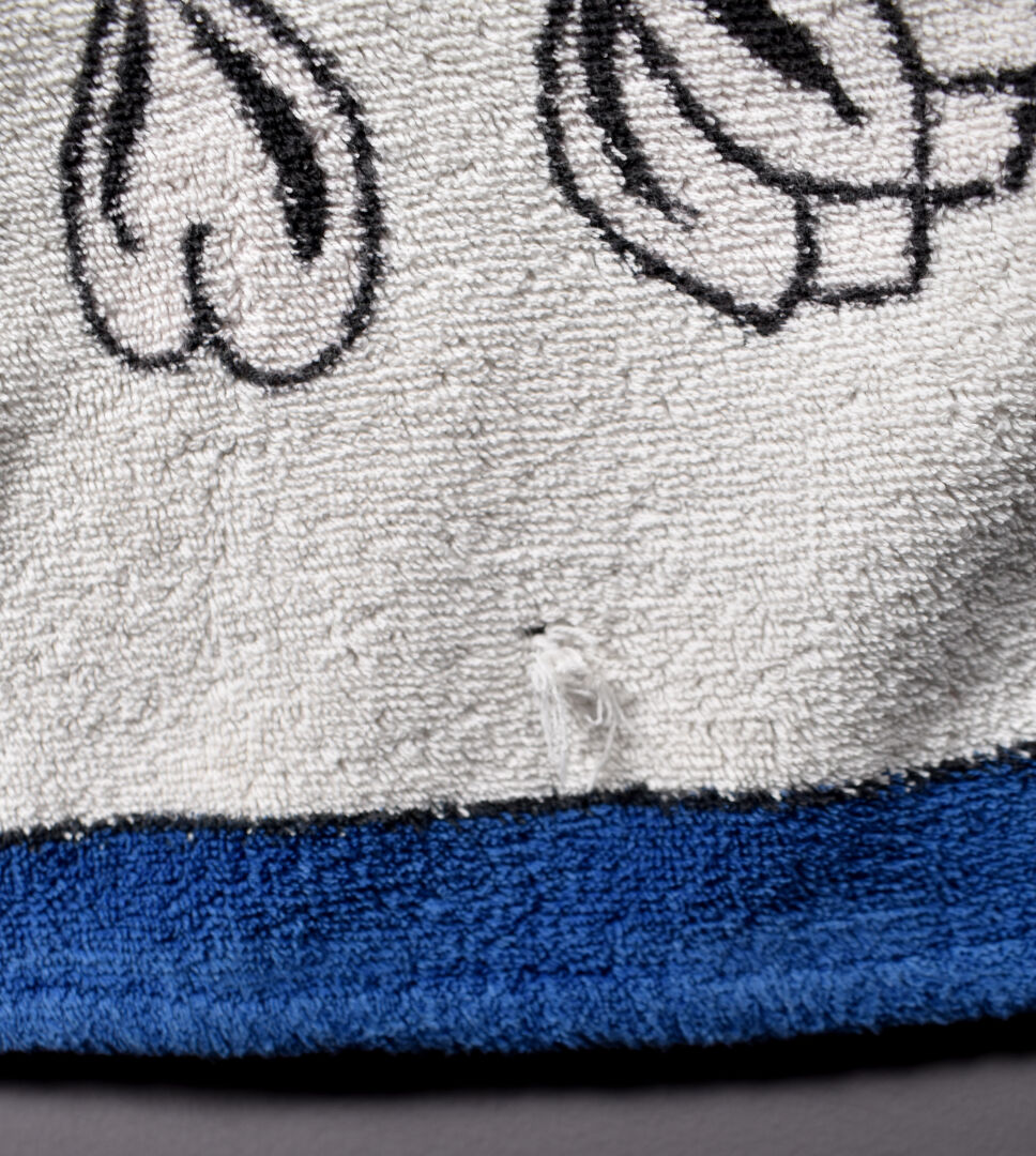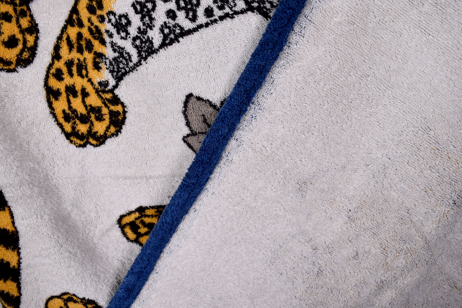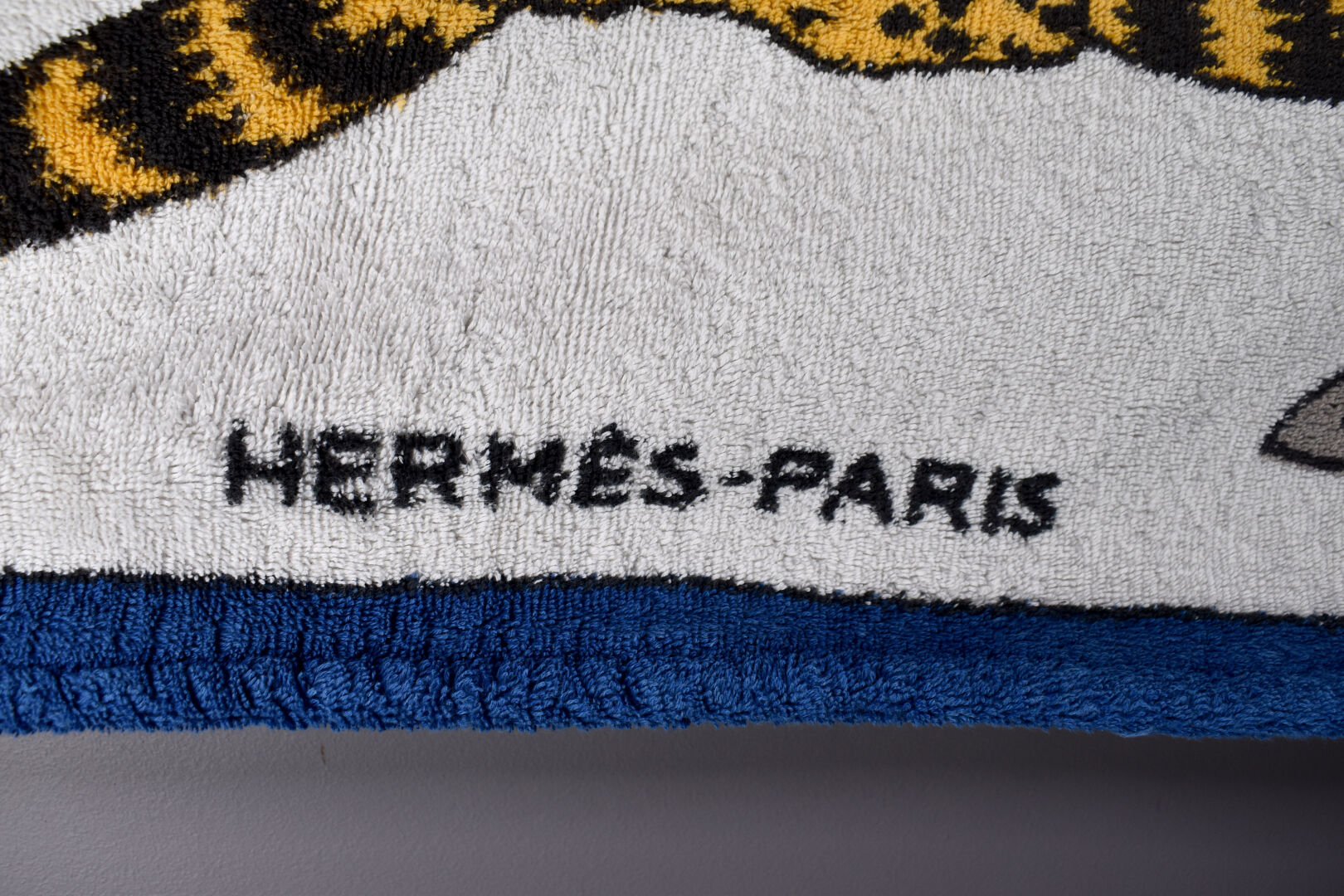 HERMES PARIS. Drap de bain en coton à décor de deux panthères, la bordure en bleu (un trou). 140 x 90 cm.