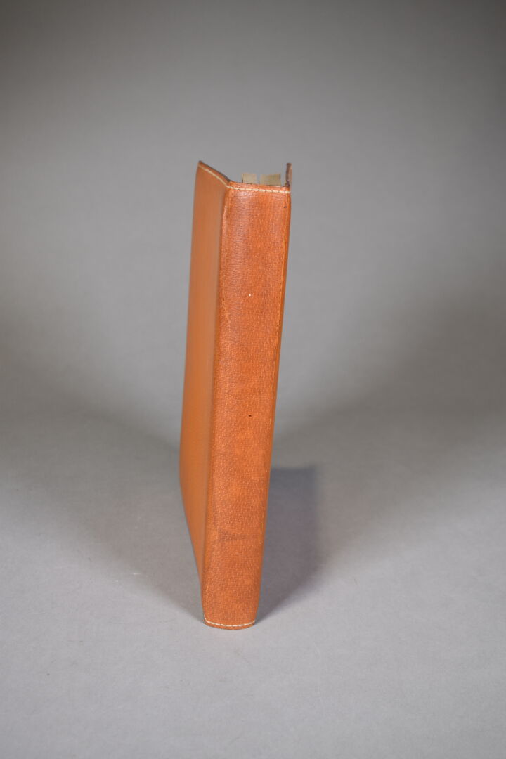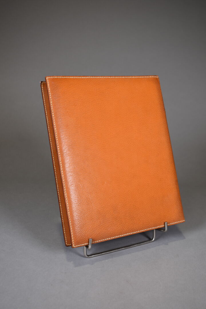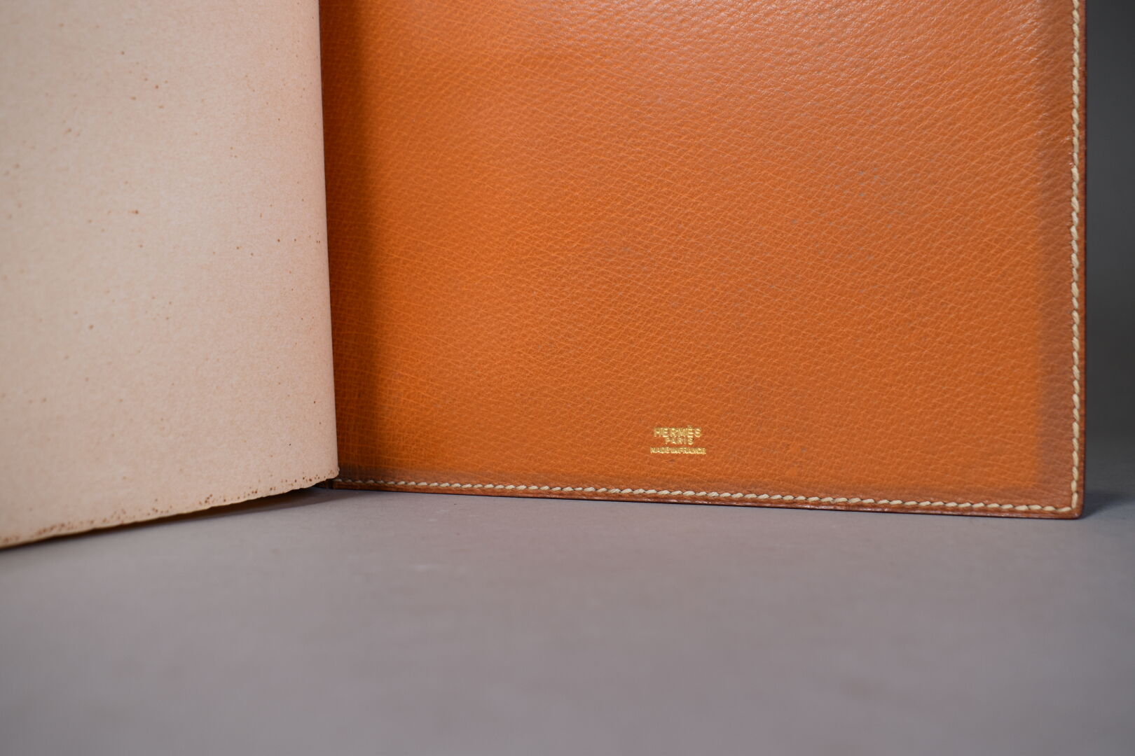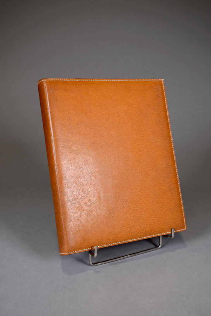 HERMES PARIS. Livre d’or à reliure en cuir tabac surpiqué (quelques usures, déchirure). Marqué. 29,5 x 24,5 cm.