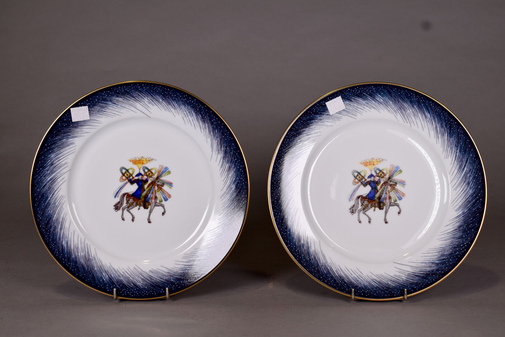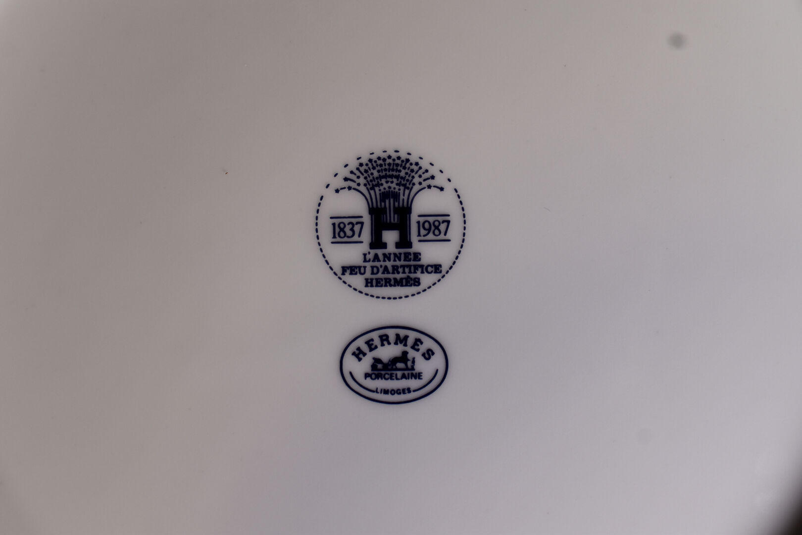 HERMES PARIS. Paire d’assiettes en porcelaine »L’année feu d’artifice Hermès 1837-1987″. Diam. : 25,5 cm.
