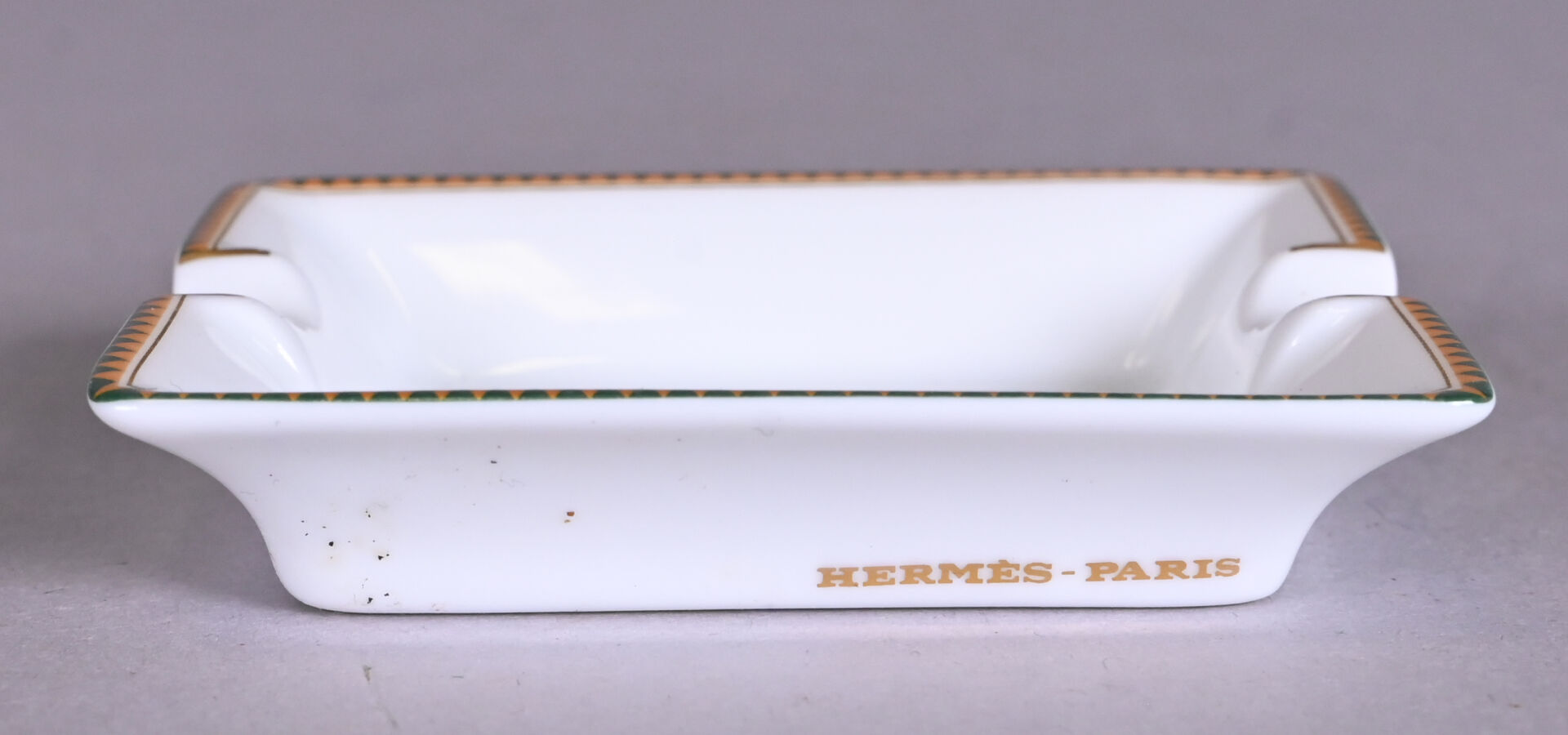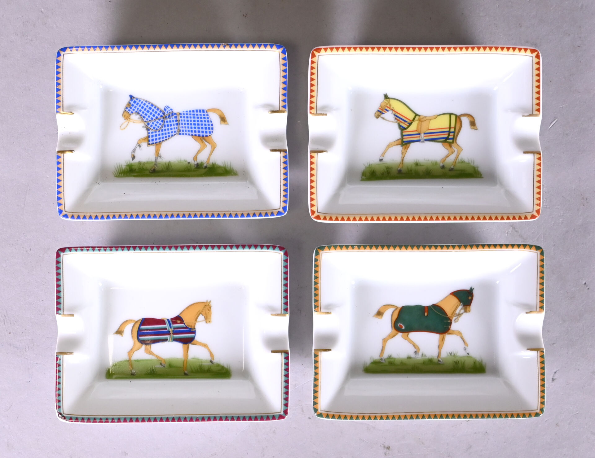 HERMES PARIS. Suite de 4 mini cendriers en porcelaine à décor de chevaux. Marqués au dessous. DIm. d’un : Haut. : 1,5 cm – Larg. : 8 cm – Prof. : 6 cm.