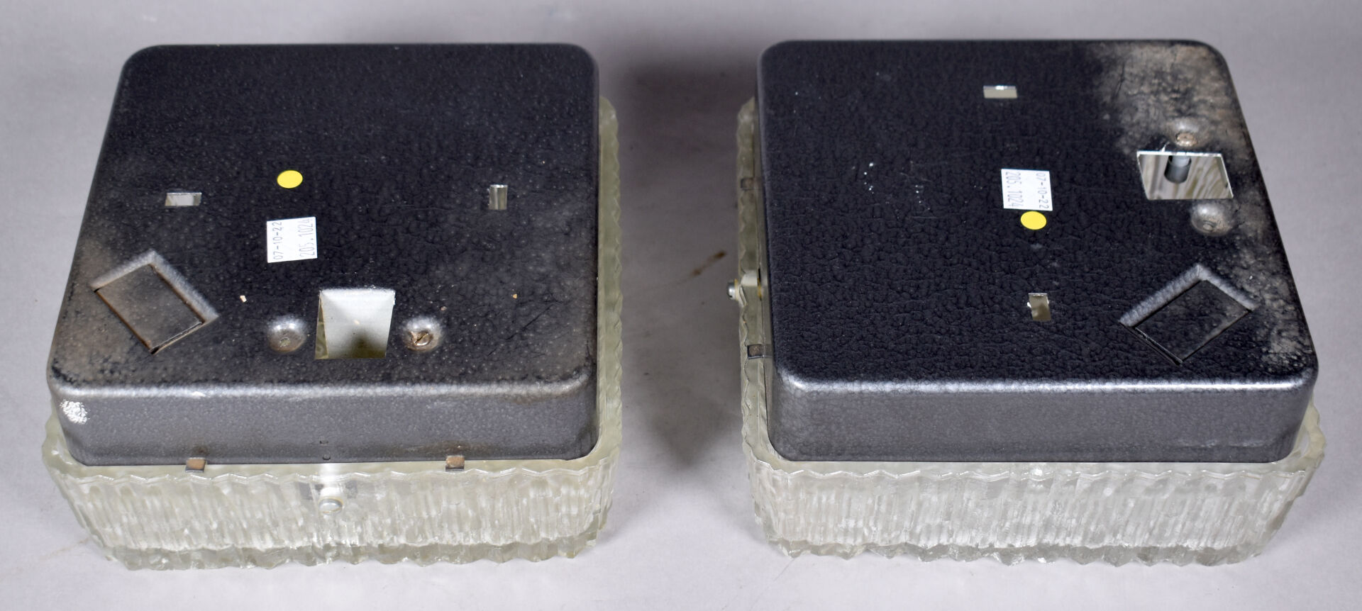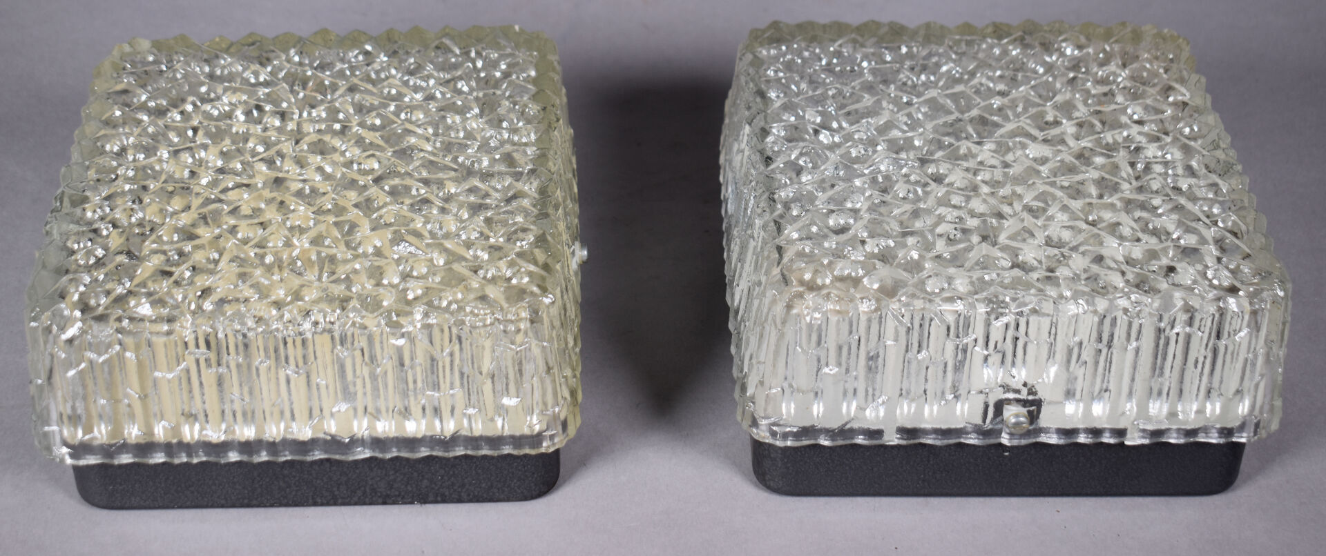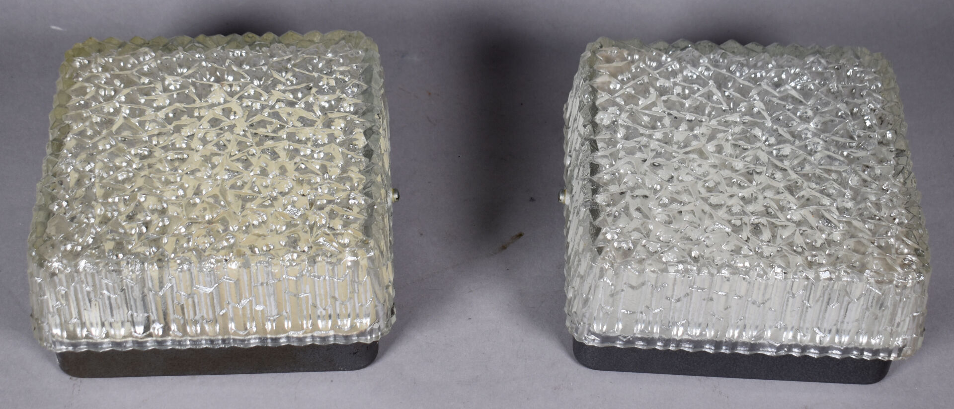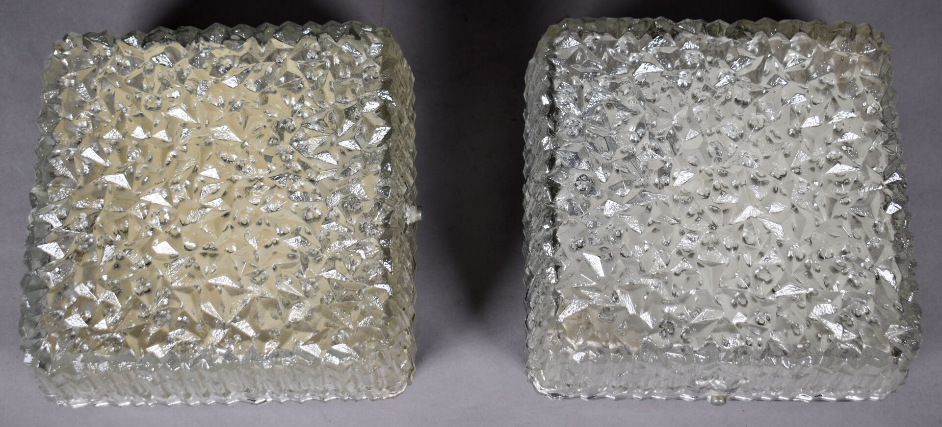 HOLOPHANE. Paire d’appliques carrées en verre moulé à l’imitation du minéral. 10 x 18 x 18 cm.