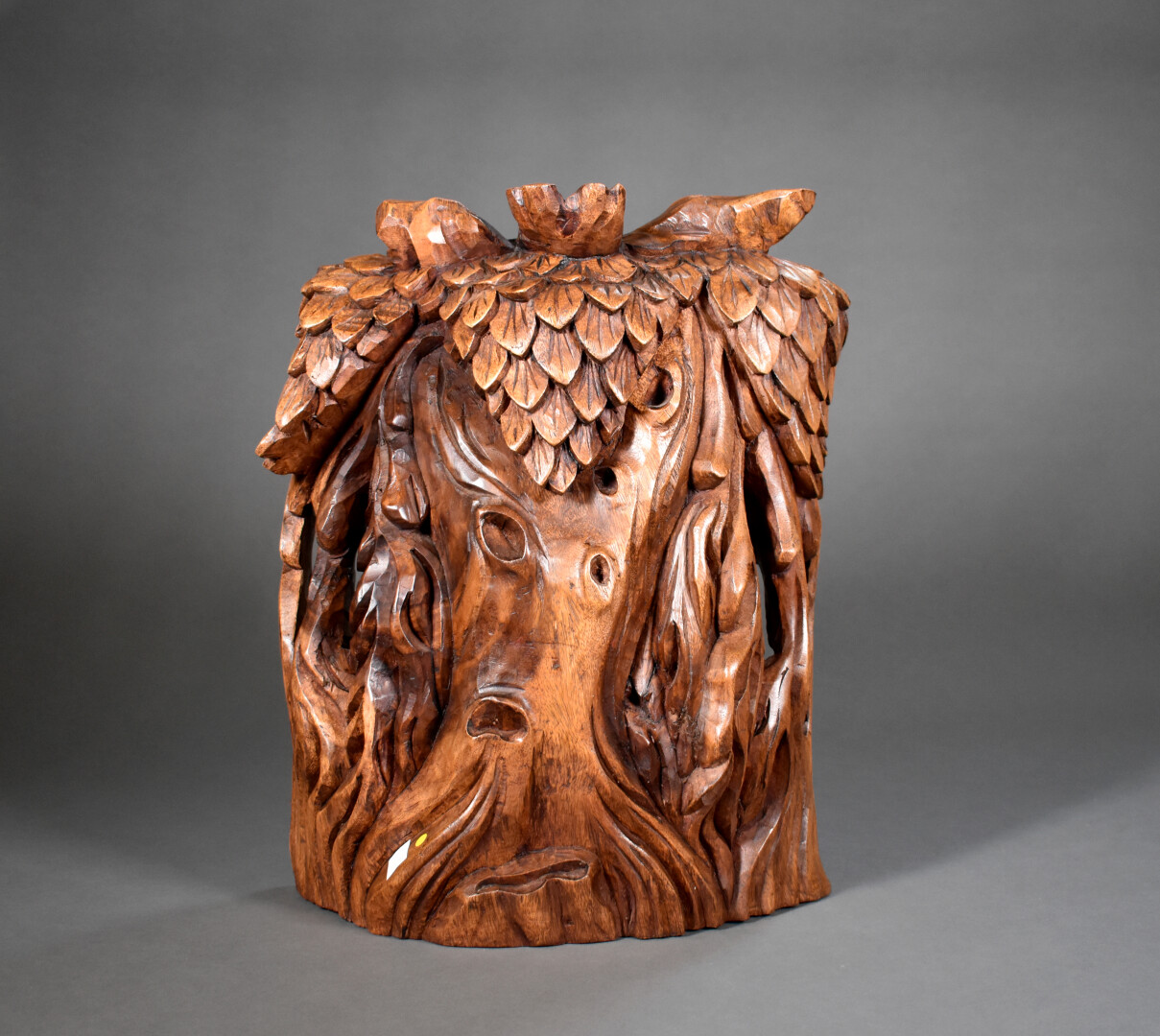Hôtel miniature en noyer sculpté figurant un Bouddha assis en méditation dans la végétation. Asie du sud-est ? XXe siècle. Haut. : 41 cm – Larg. : 33 cm – Prof. : 13,5 cm.