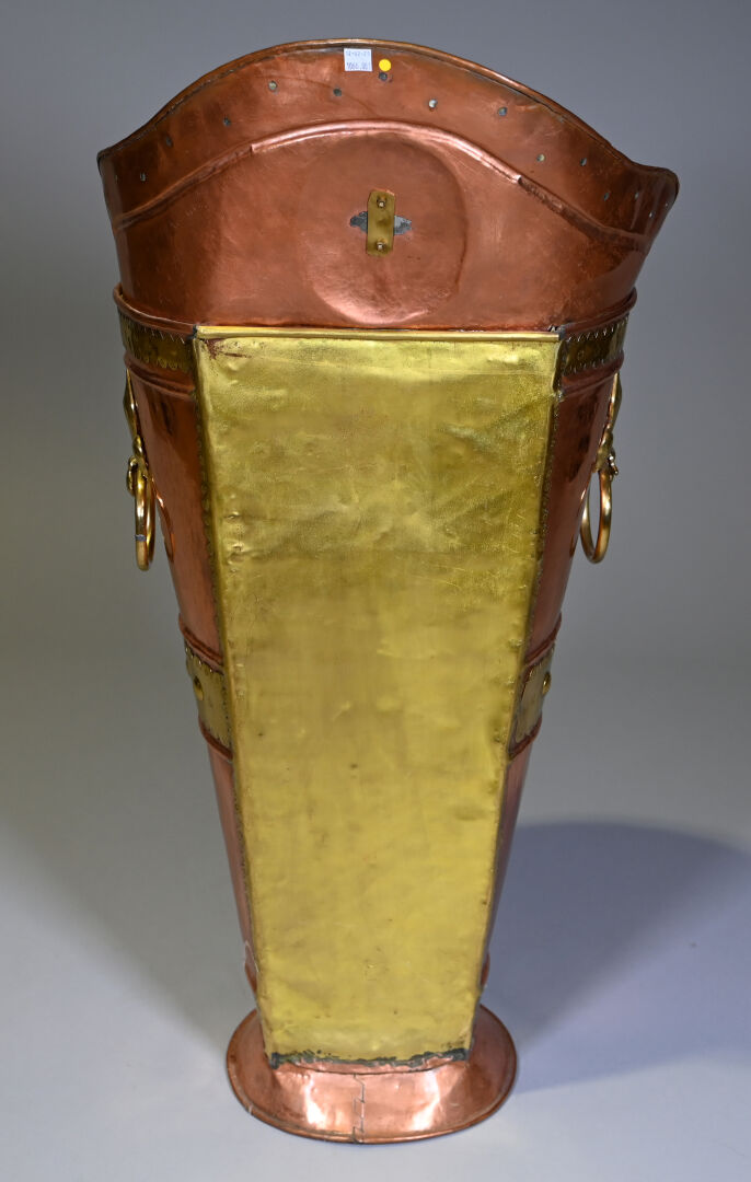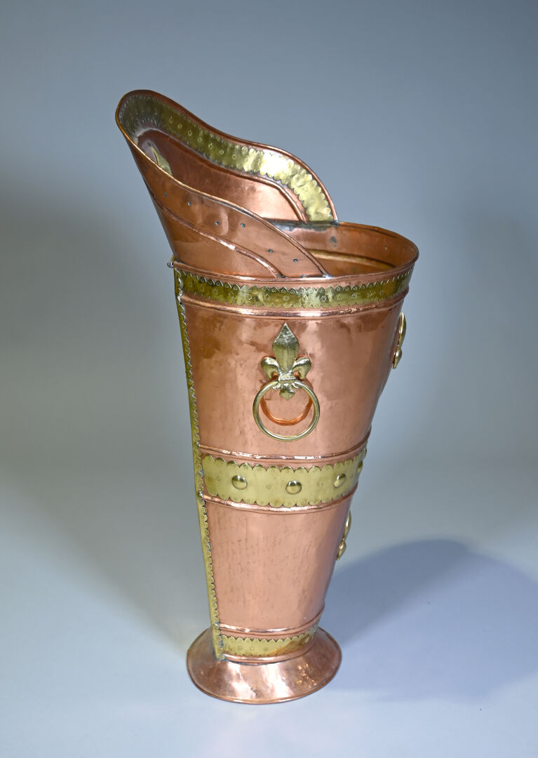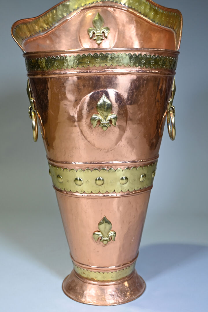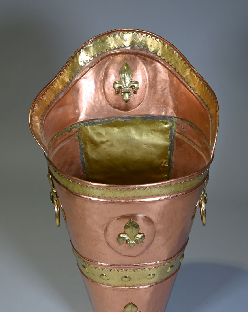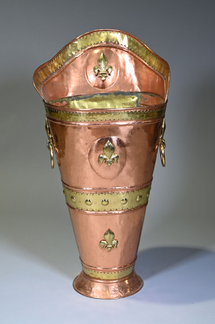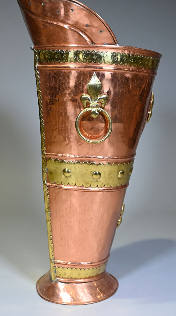 Hotte à raisin en cuivre et laiton à décor de fleurs de lys, probablement début du XXe siècle. Haut. : 102 cm.