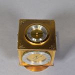 HOUR LAVIGNE. Pendule baromètre, hygromètre et thermomètre de table en métal doré. Haut. : 12 cm.