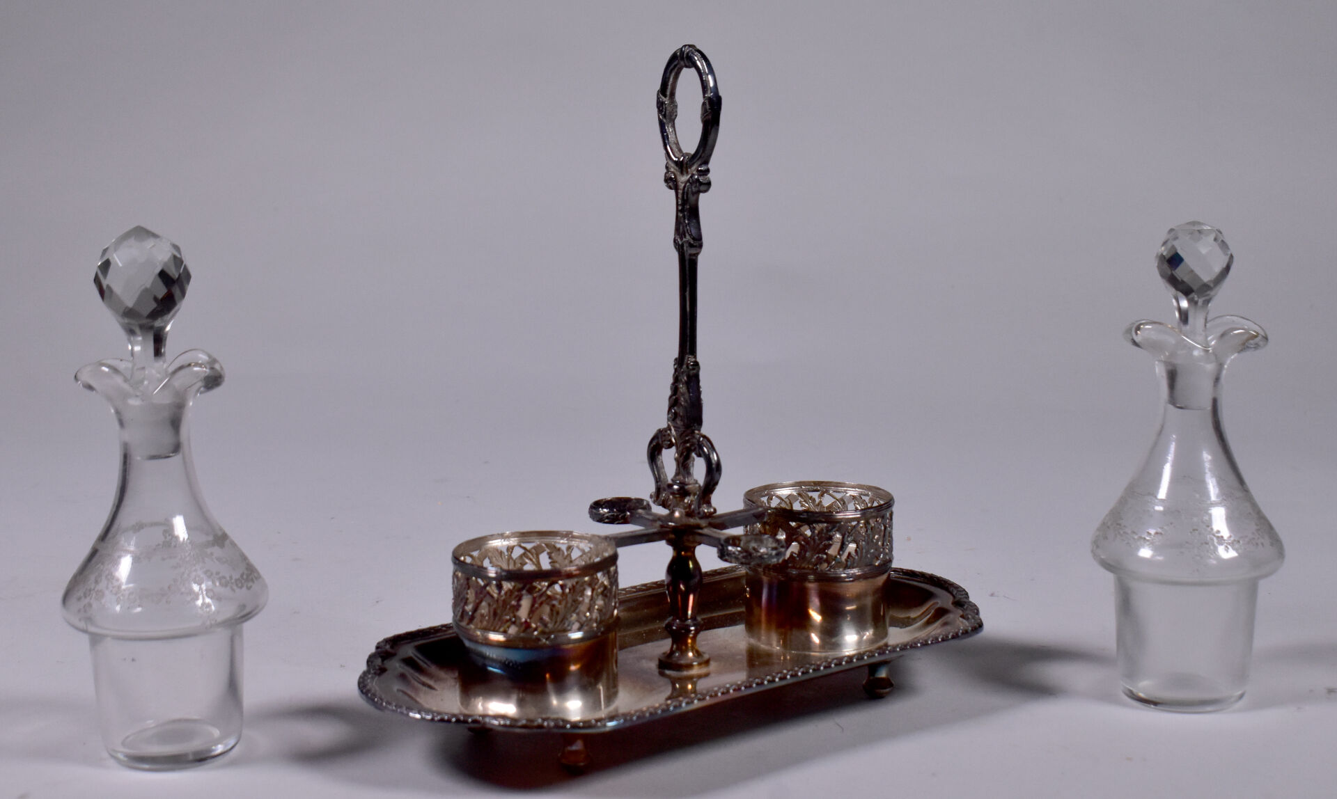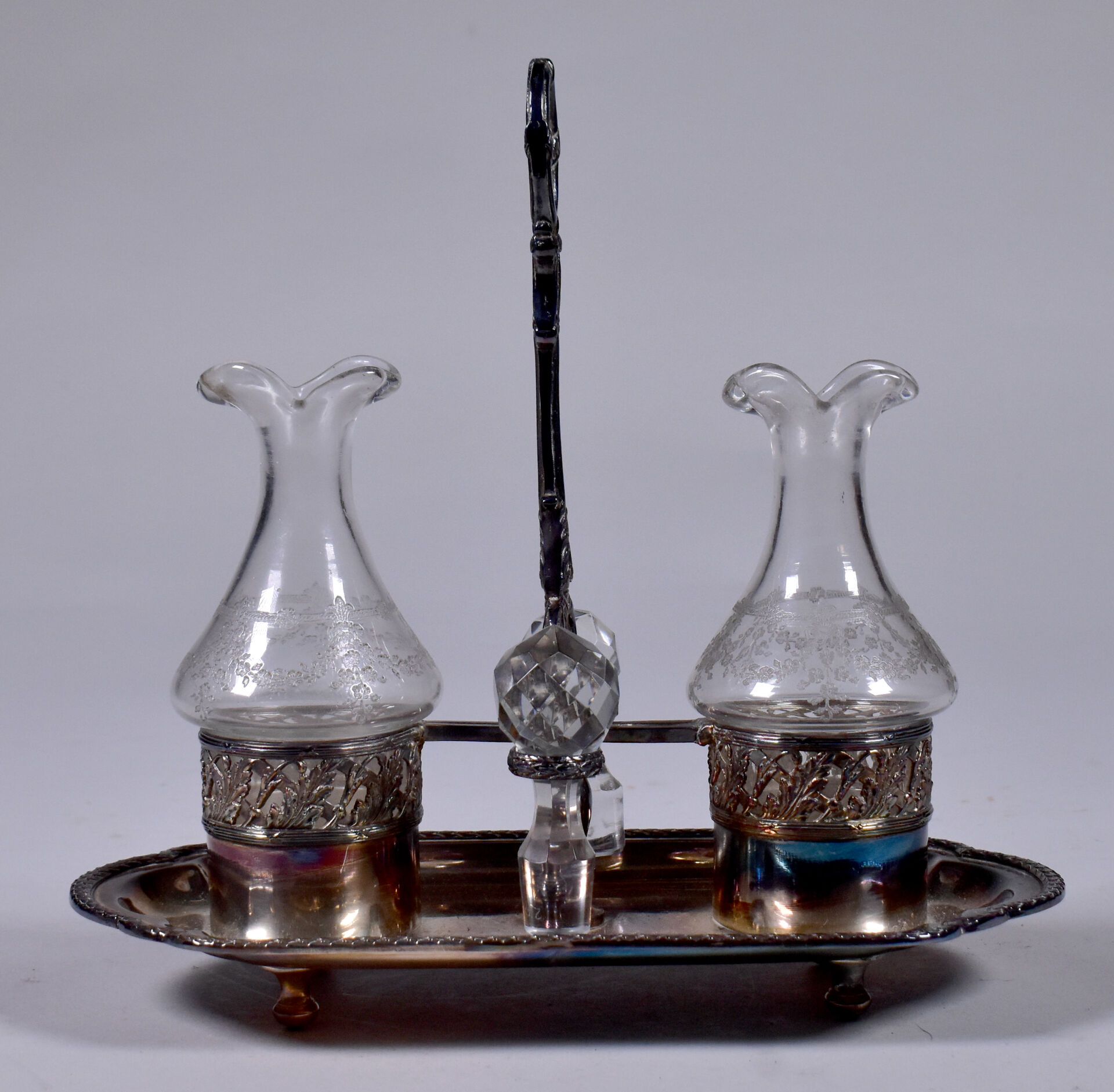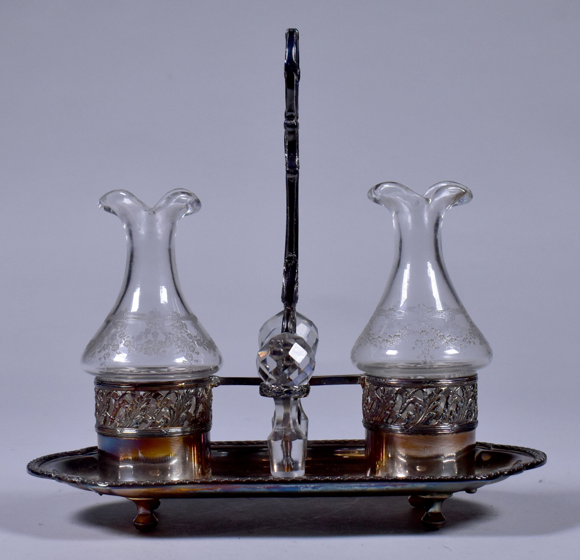 Huilier-vinaigrier en métal argenté avec les carafons et leurs bouchons en cristal. Haut. : 23 cm.