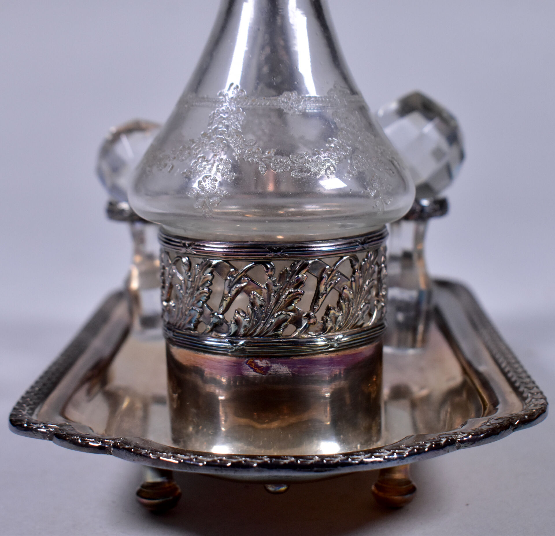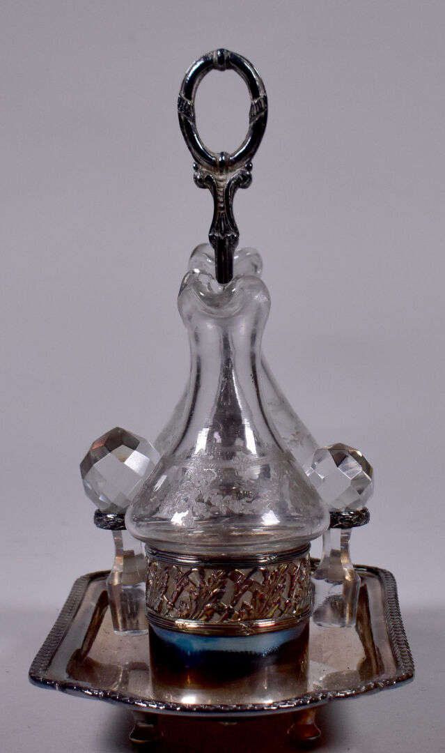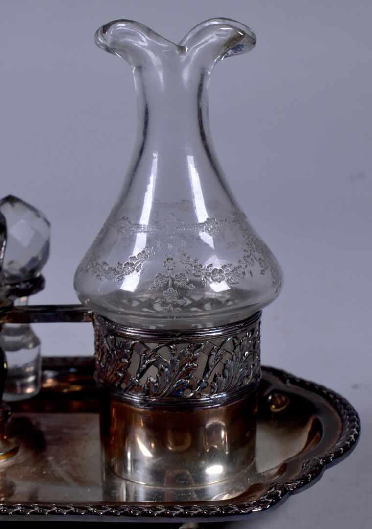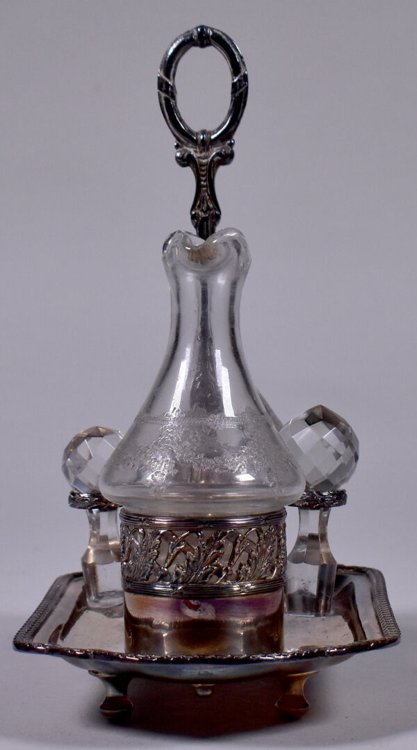 Huilier-vinaigrier en métal argenté avec les carafons et leurs bouchons en cristal. Haut. : 23 cm.