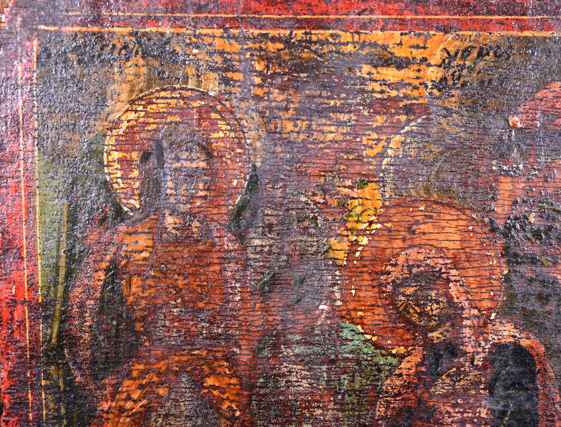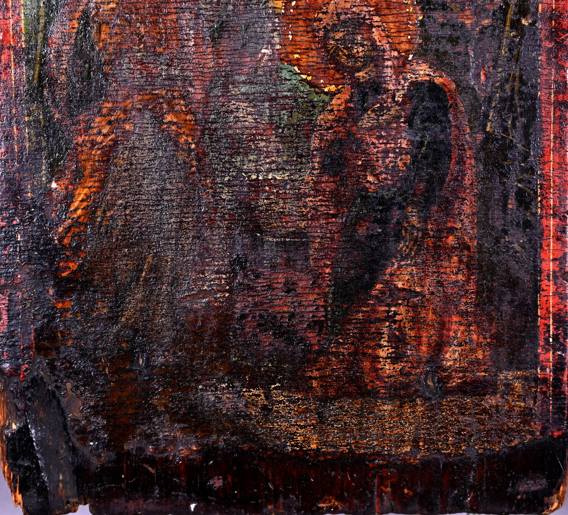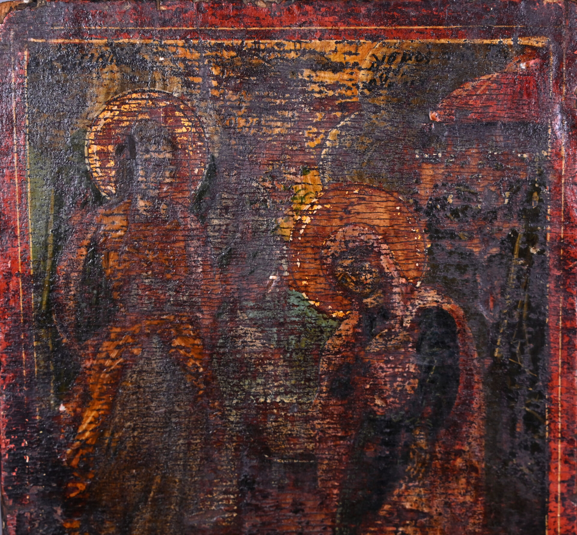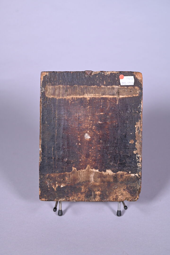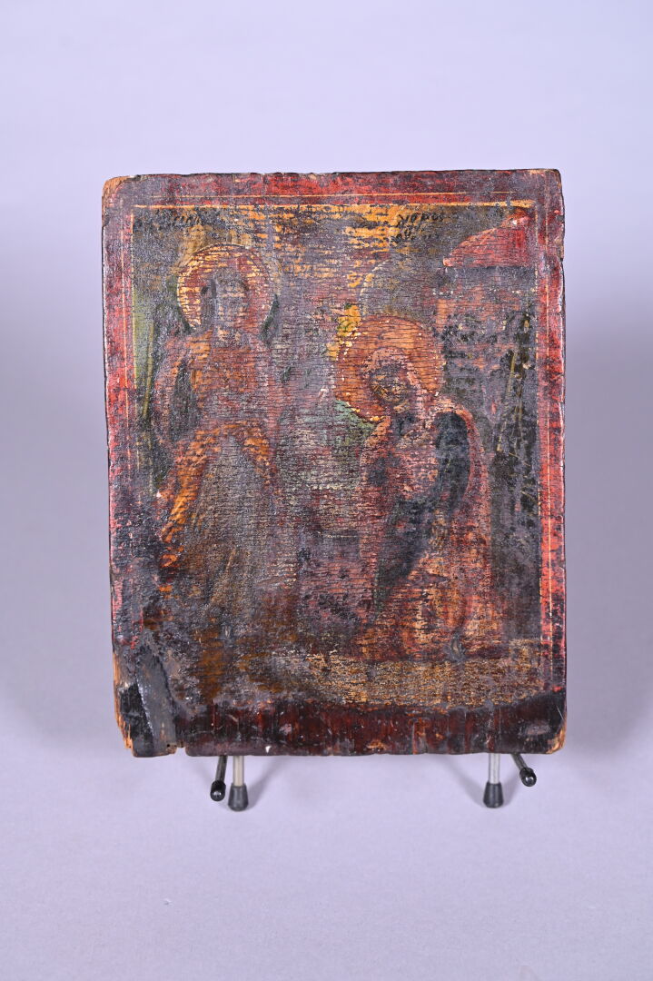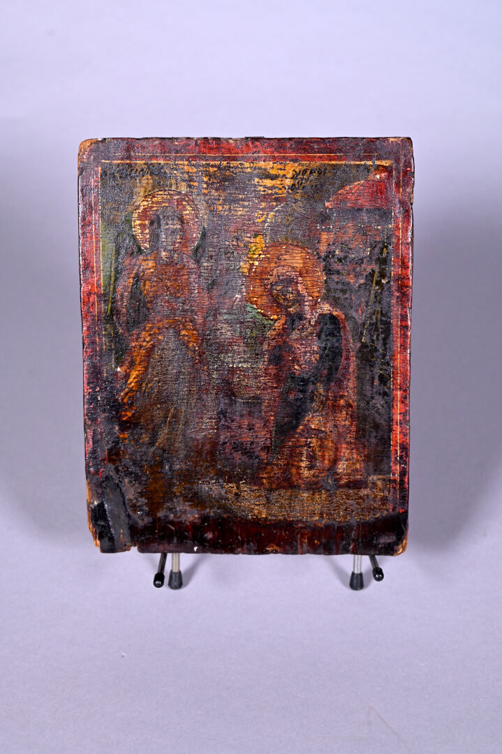Icône de l’Annonciation. Tempera sur bois (usures et manques). Grèce, XVII-XVIIIe siècles. H. 24 x L. 18,5 cm.