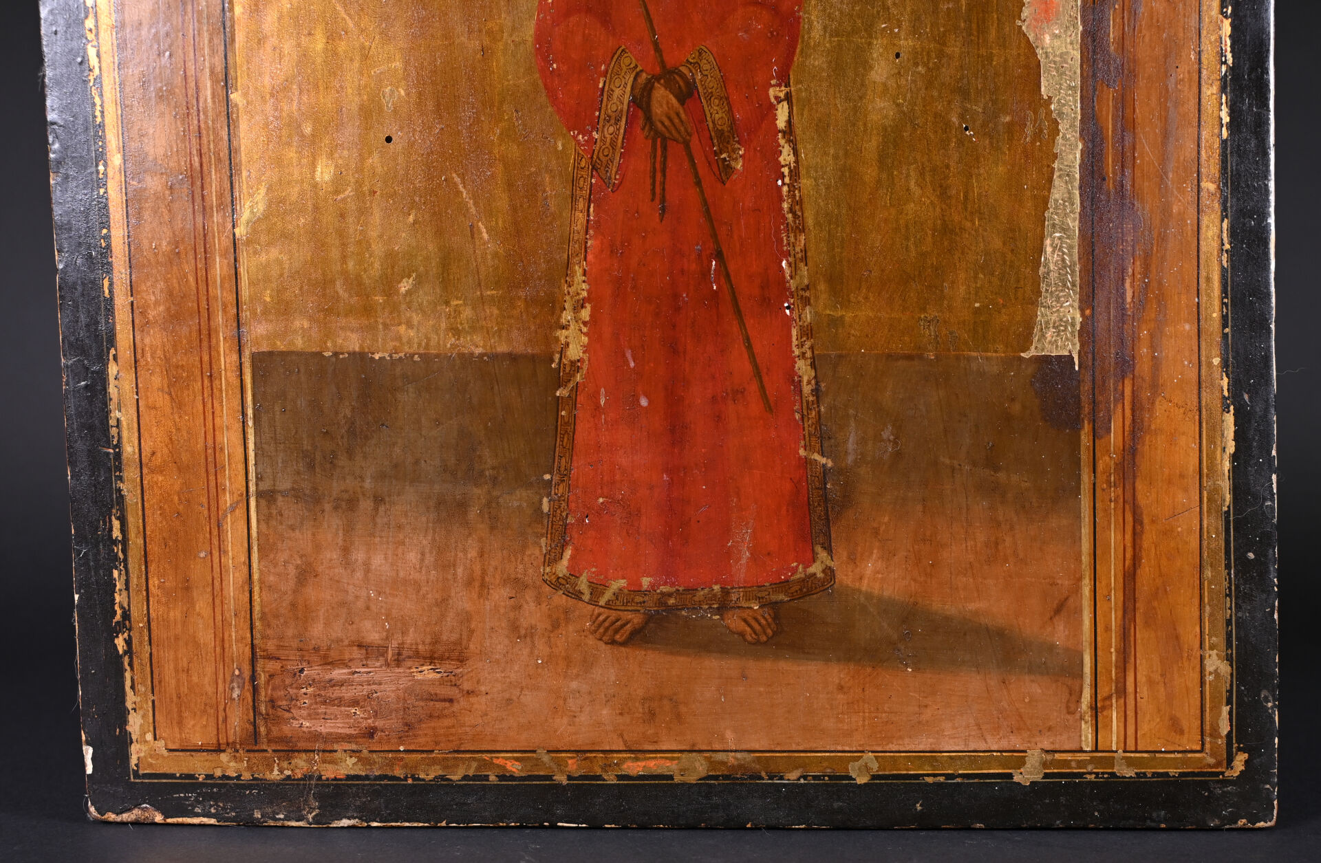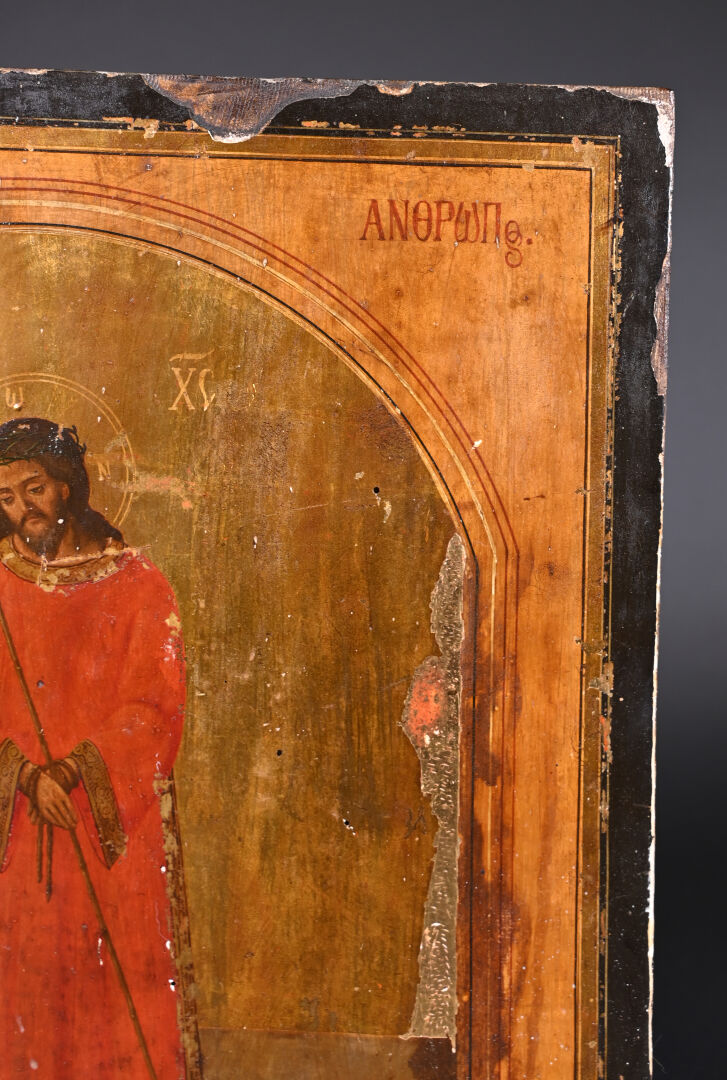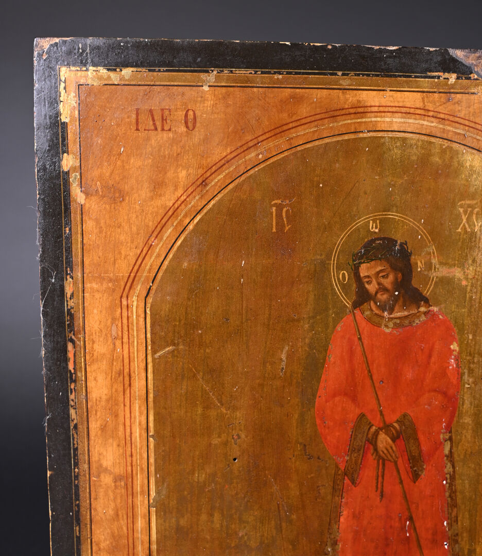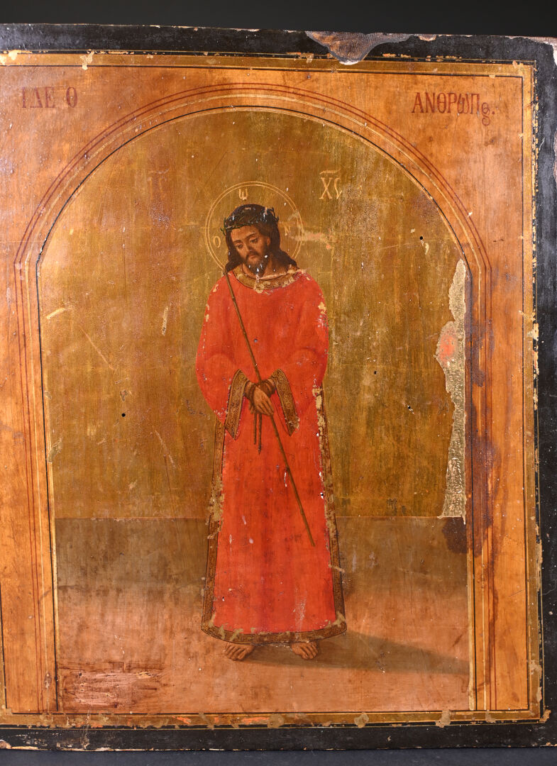 Icône « Ide o anthropos » (« Ecce homo ») figurant le Christ présenté en pied, les mains liées. Tempera sur bois. Petits manques et usures. Grèce, XIXe siècle. 40 x 34 cm.