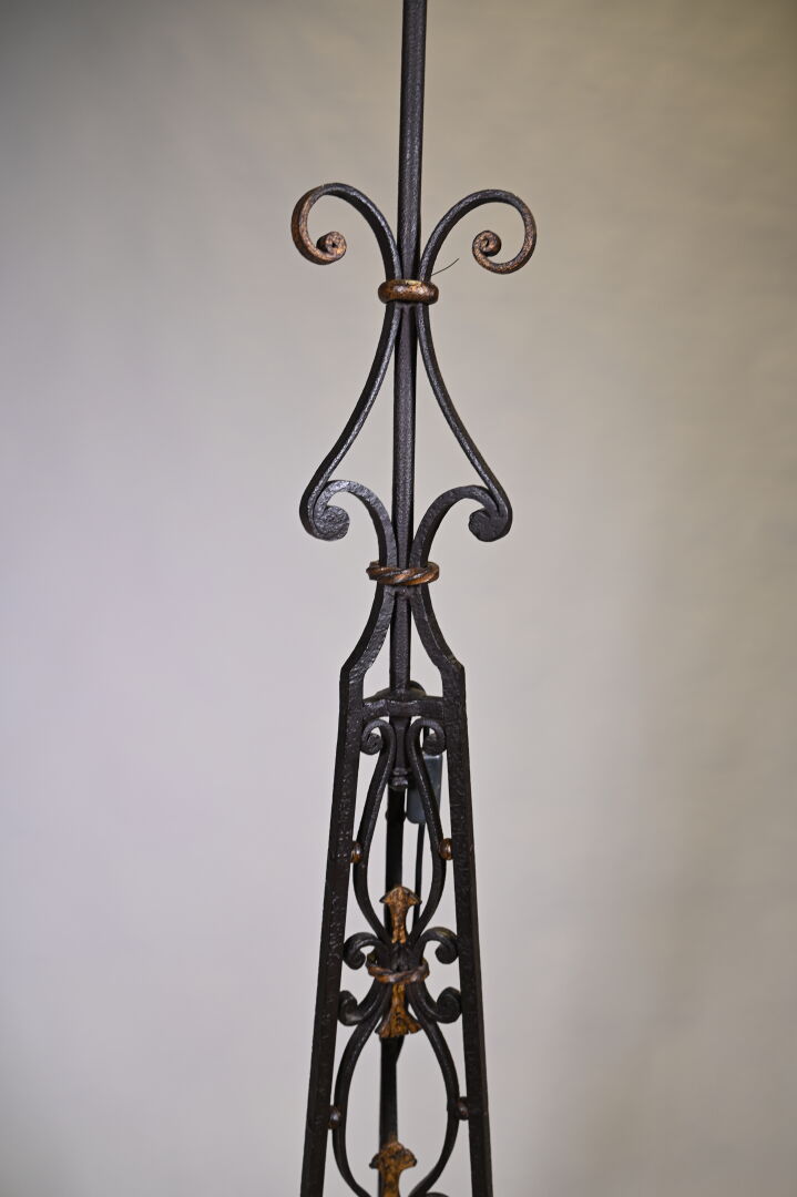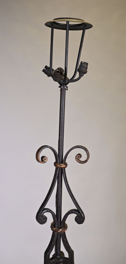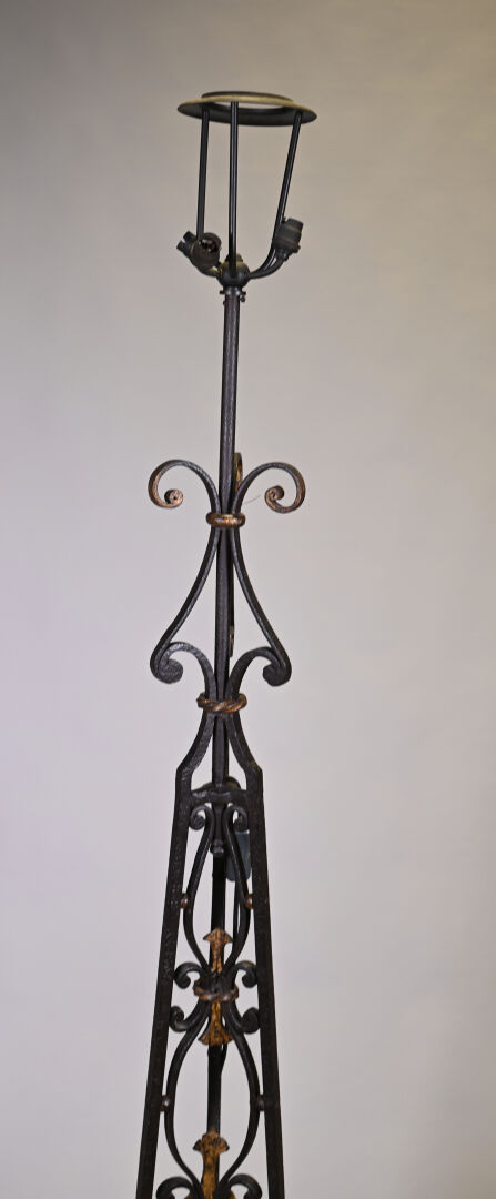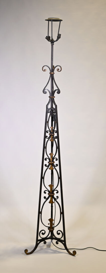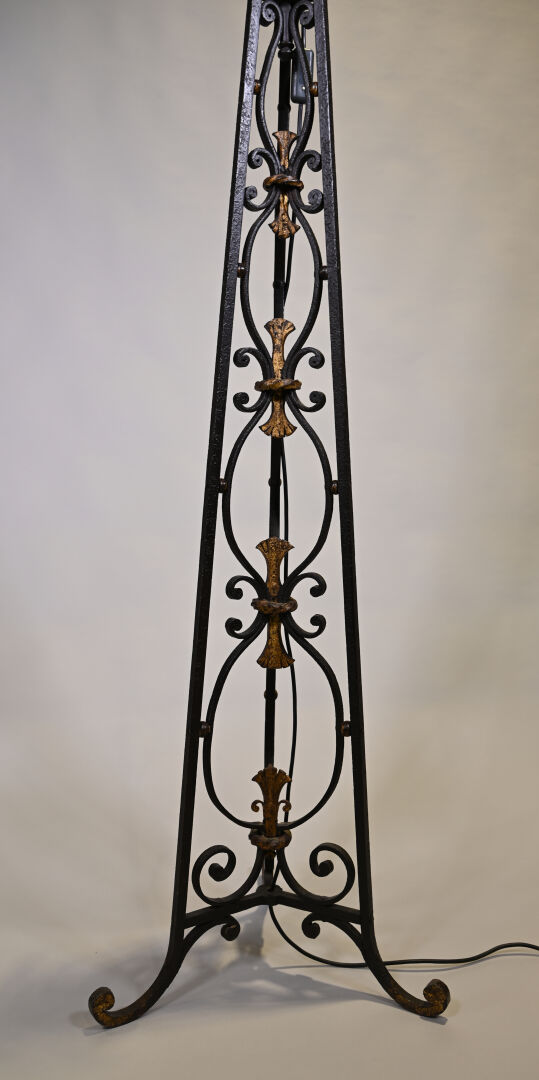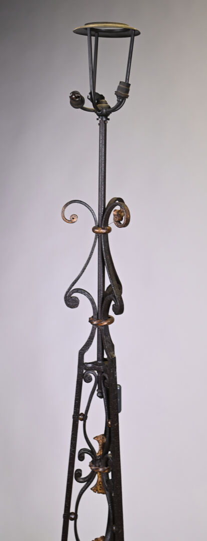 Important lampadaire en fer forgé ajouré de consoles et palmettes dorées à trois lumières. Piétement tripode en console. Haut. : 206 cm.