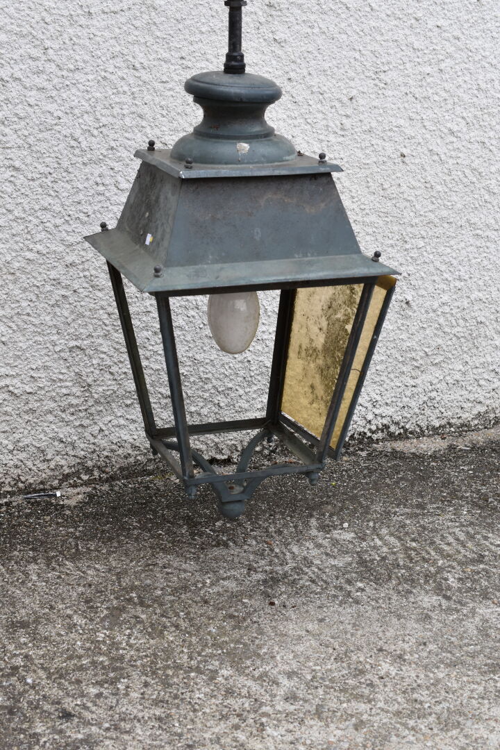 Important lampadaire en fonte et cuivre, le bras laqué noir en console (trois parois en plexiglas jaune, manque une). Première moitié du XXe siècle . Haut. : 162 cm.
