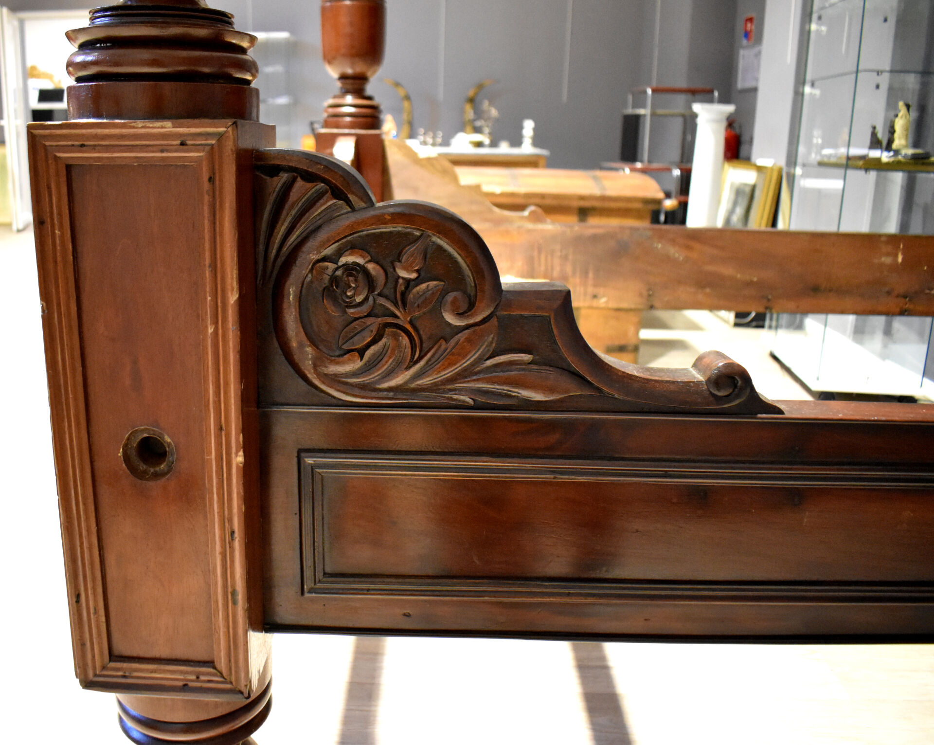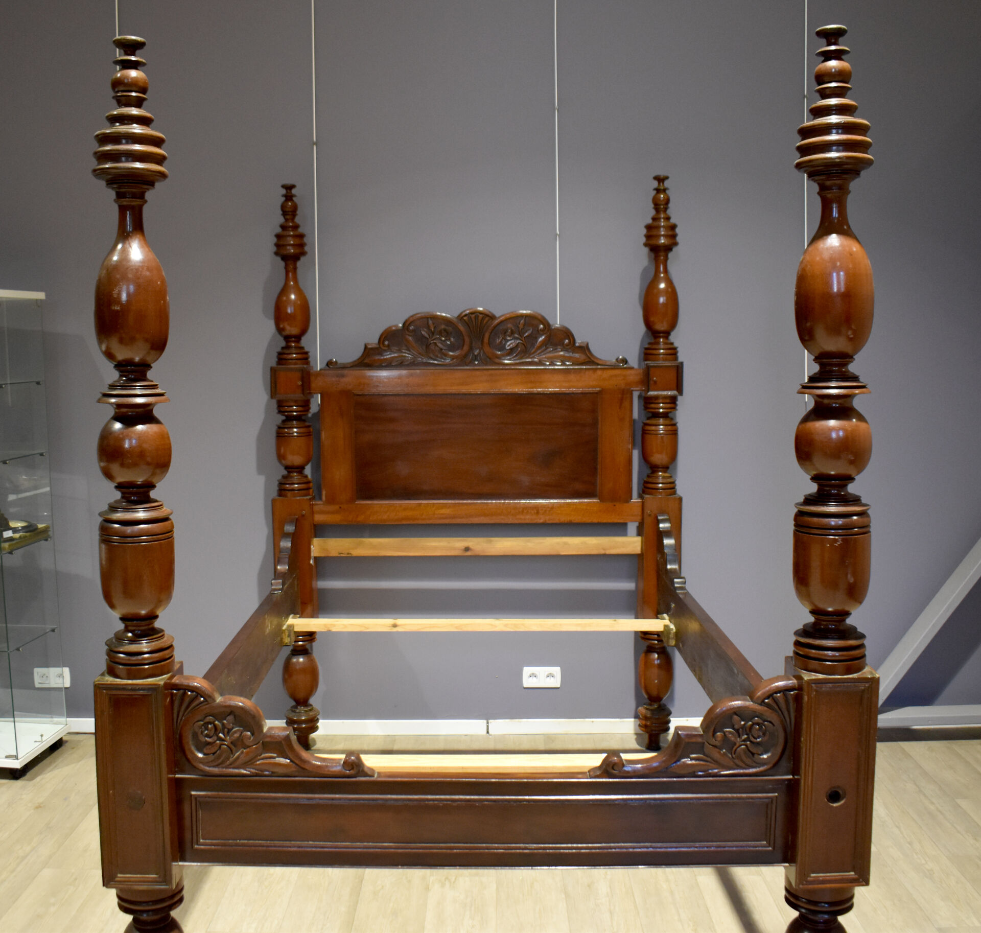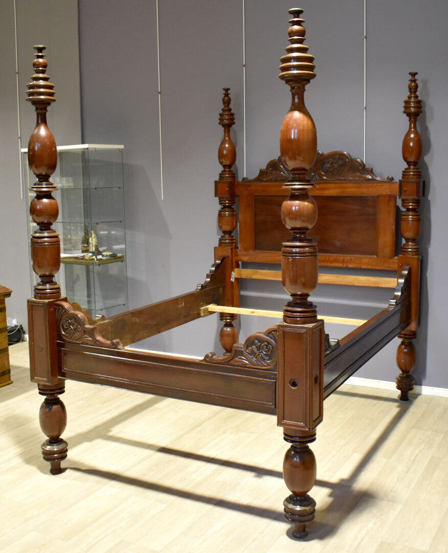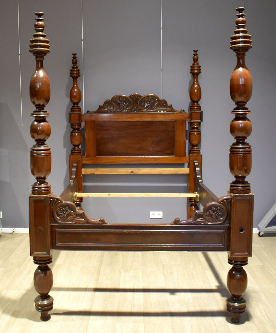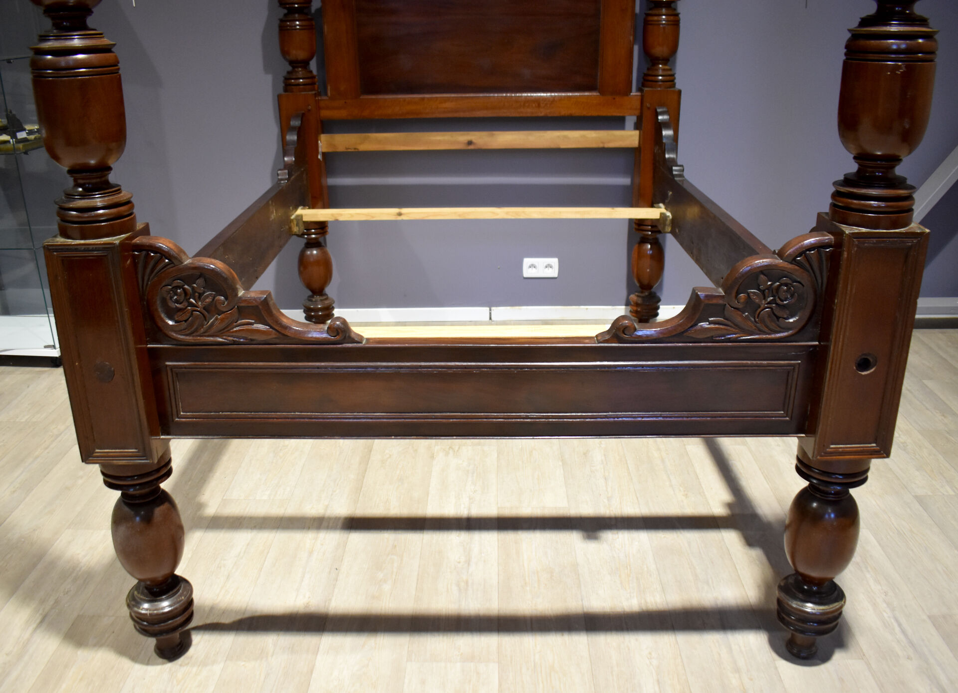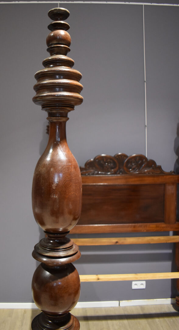 Important lit à baldaquin en acajou et placage d’acajou, les montants tournés, la tête à fronton sculpté de fleurs. Les pieds toupies. XXe siècle. Haut. : 220 cm – Larg; : 154 cm – Prof. : 214 cm. Dim. de l’emplacement du sommier : 185 x 135 cm.