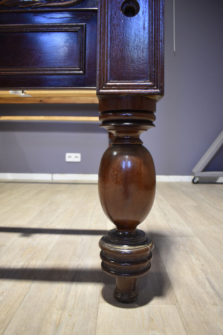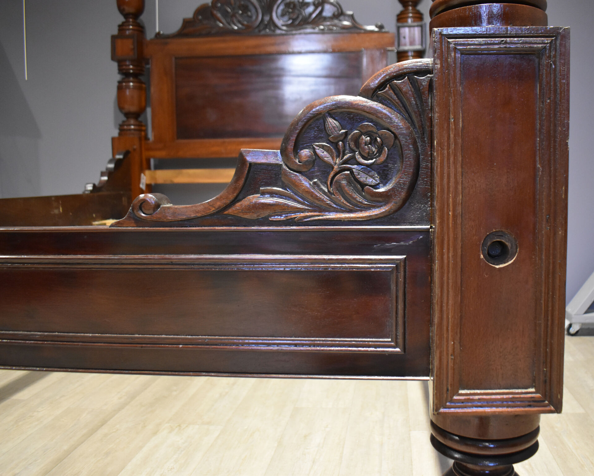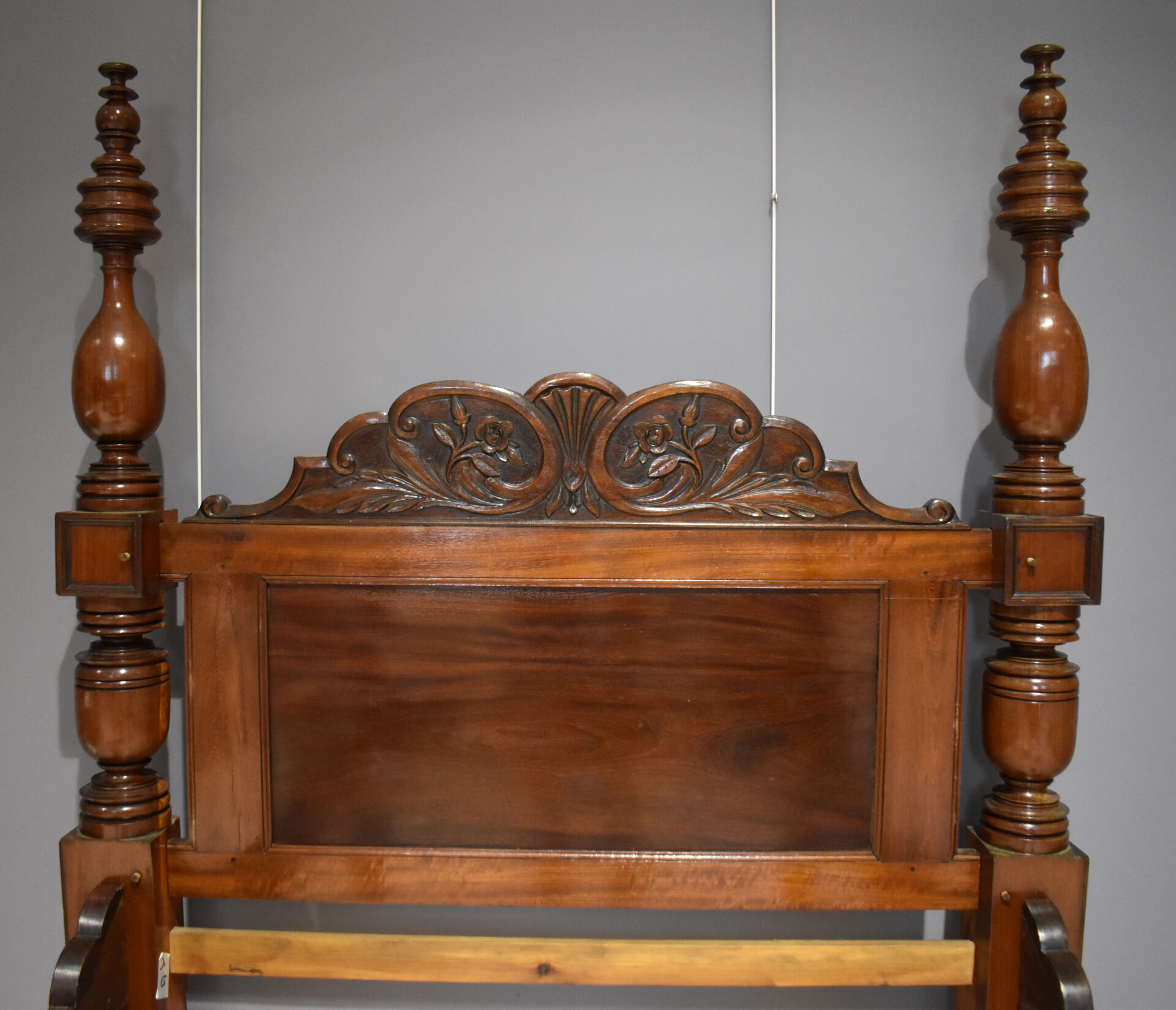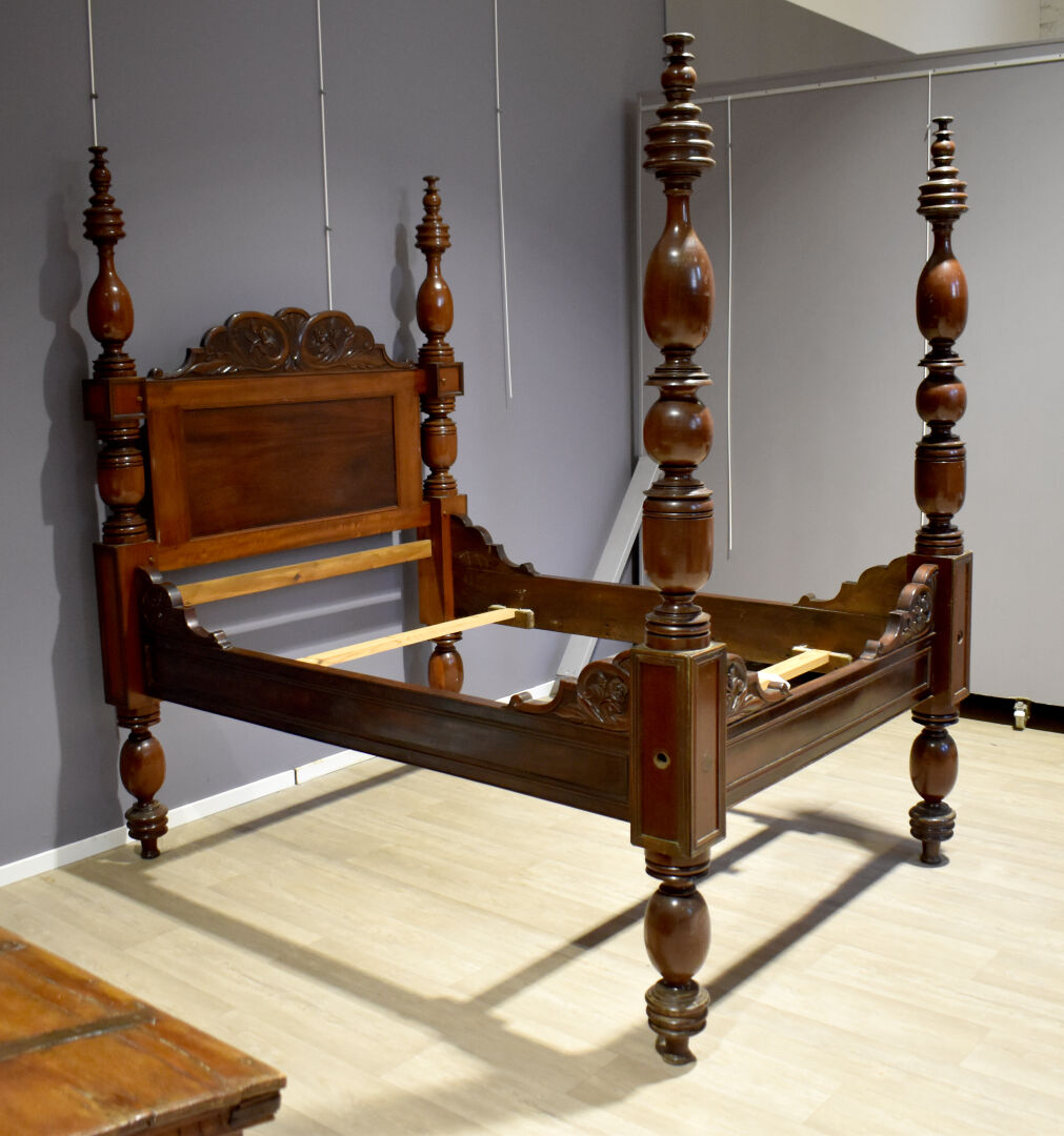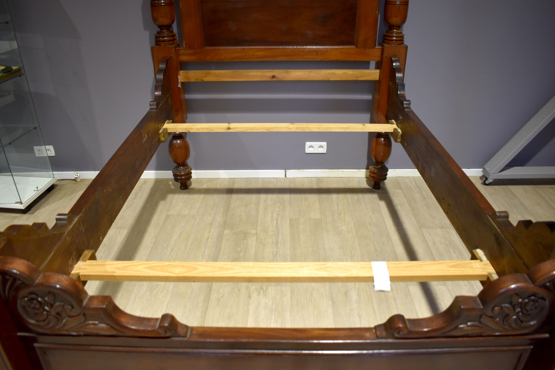 Important lit à baldaquin en acajou et placage d’acajou, les montants tournés, la tête à fronton sculpté de fleurs. Les pieds toupies. XXe siècle. Haut. : 220 cm – Larg; : 154 cm – Prof. : 214 cm. Dim. de l’emplacement du sommier : 185 x 135 cm.