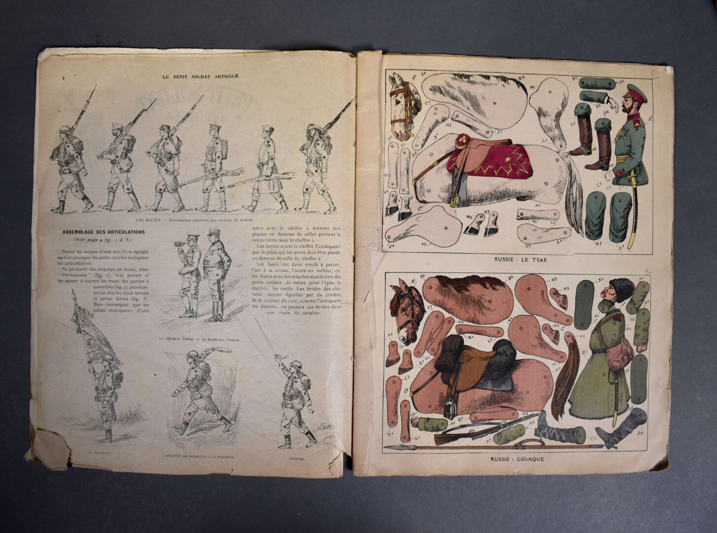 Important lot de figurines à découper édition bouquet, collection pour Pro Patria, lot de soldats en papier ou cartonnage découpés, figurines de papier découpés et des figurines peintes sur papier, également 2 livres jeux d’enfant, un livre à colorier l’autre à découper déjà utilisé.