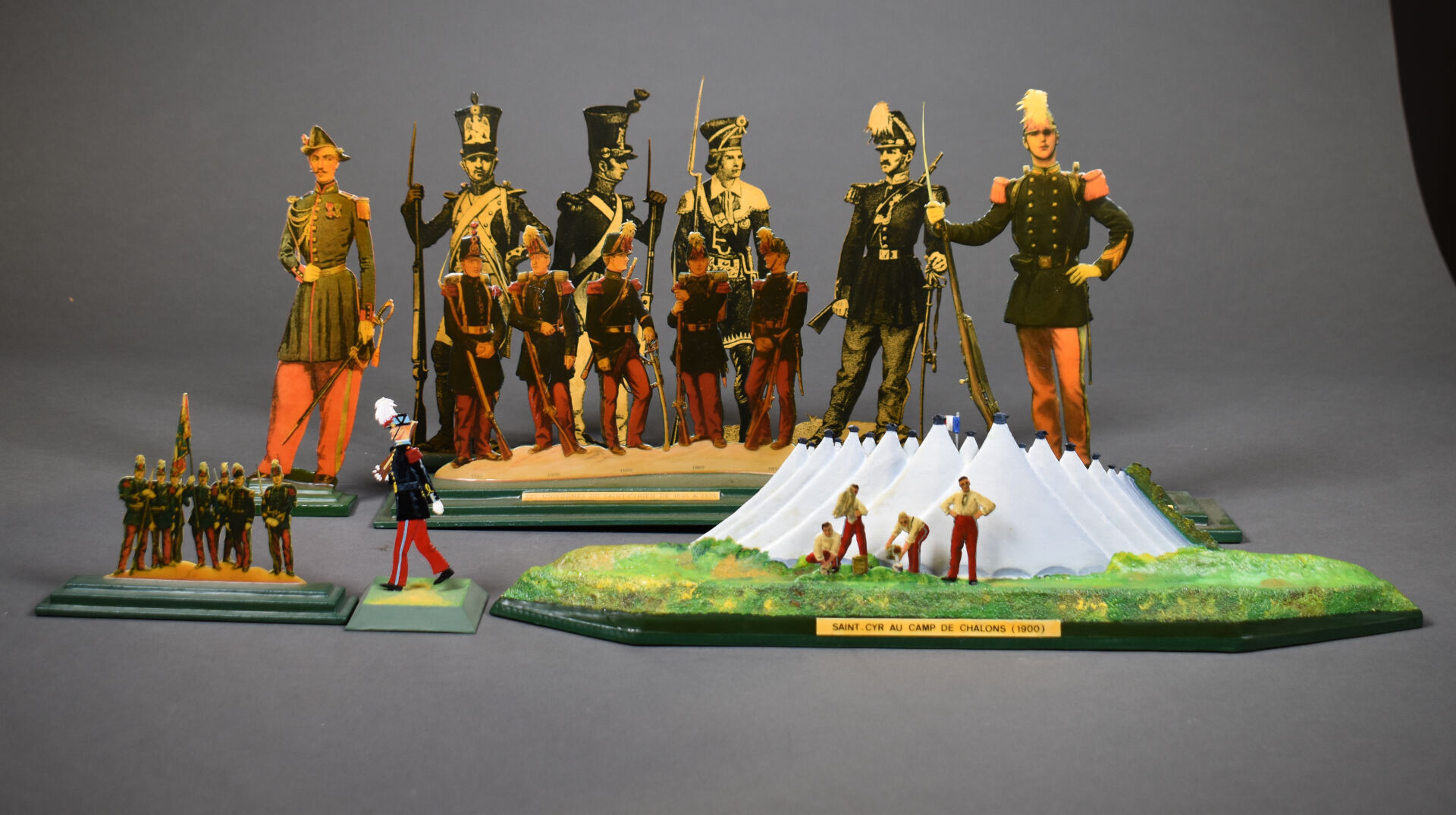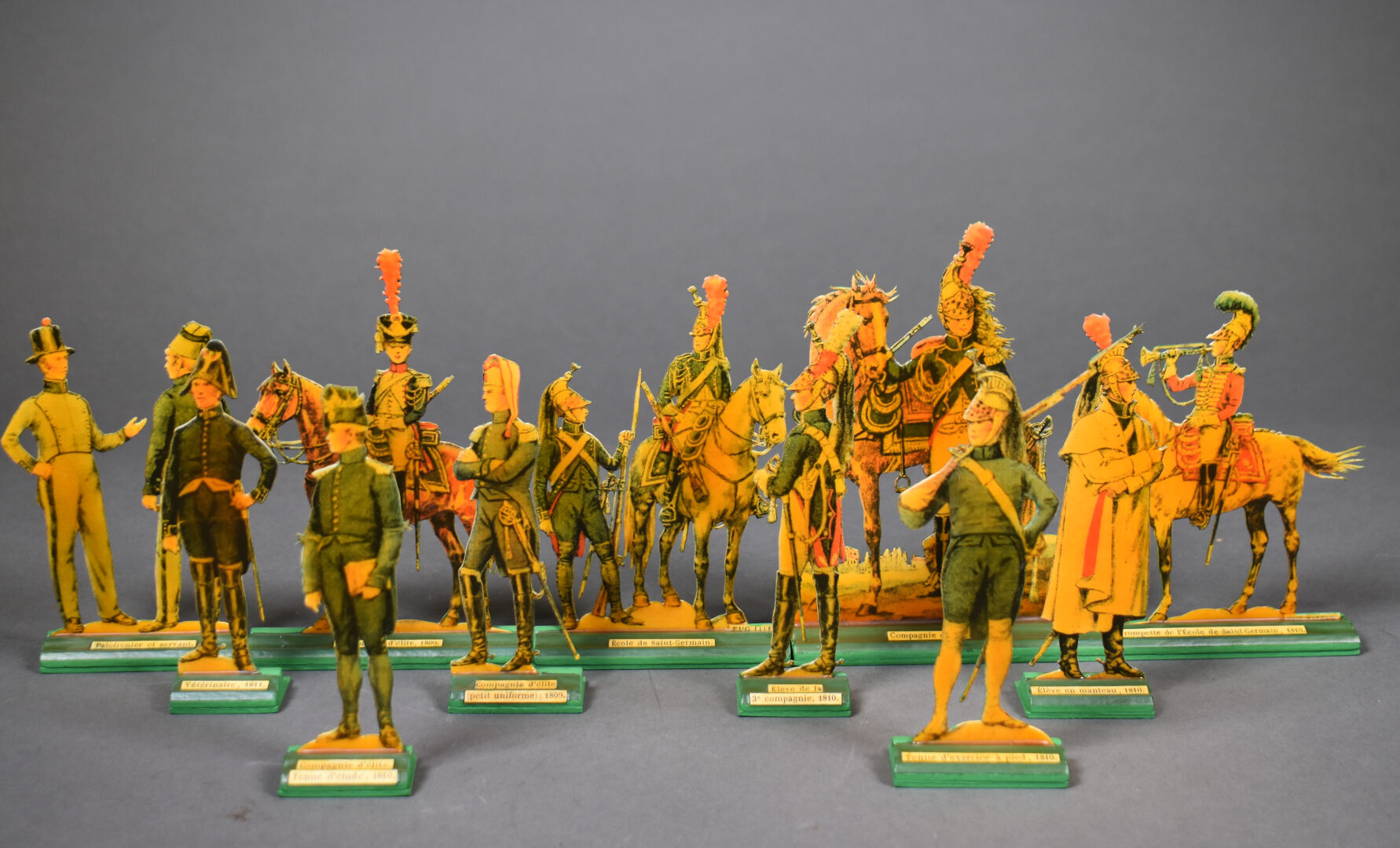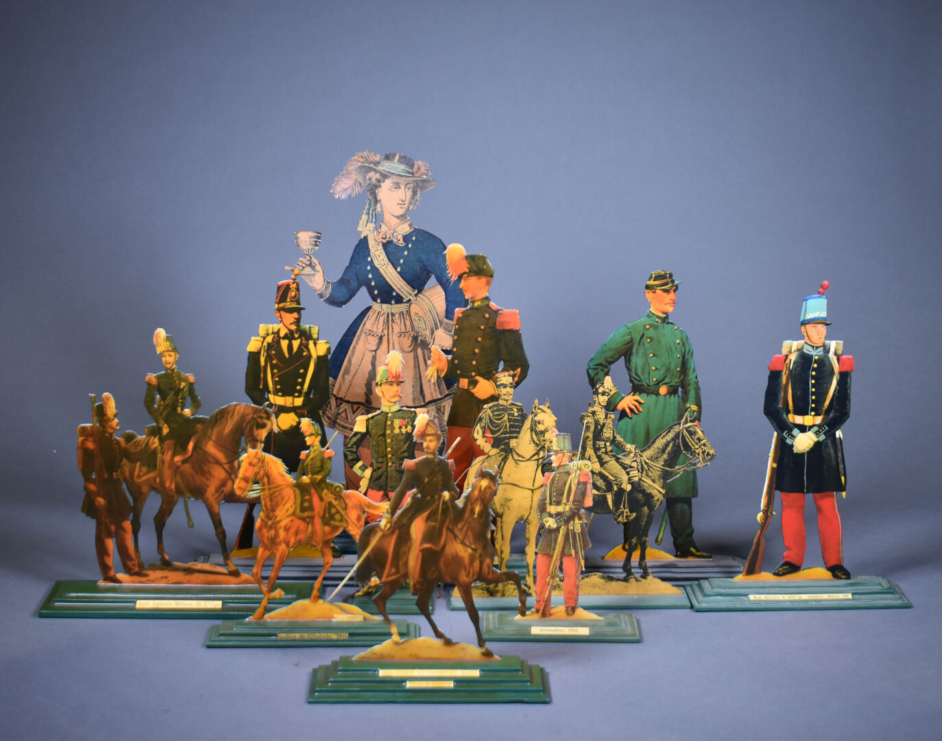 Important lot de figurines militaires de toutes tailles réalisées avec des gravures de publication militaires. Plus de 100 pièces.