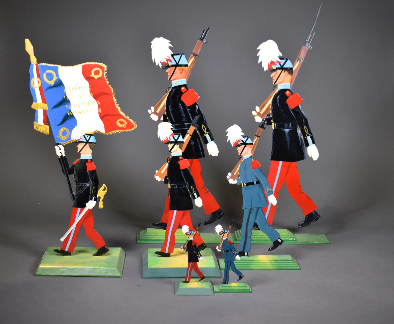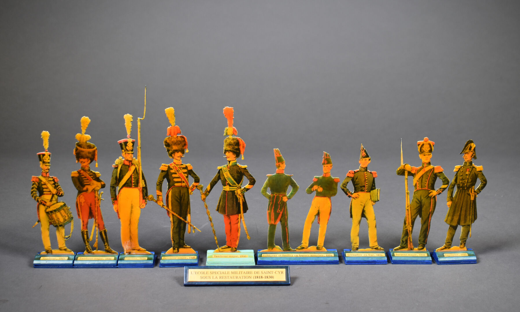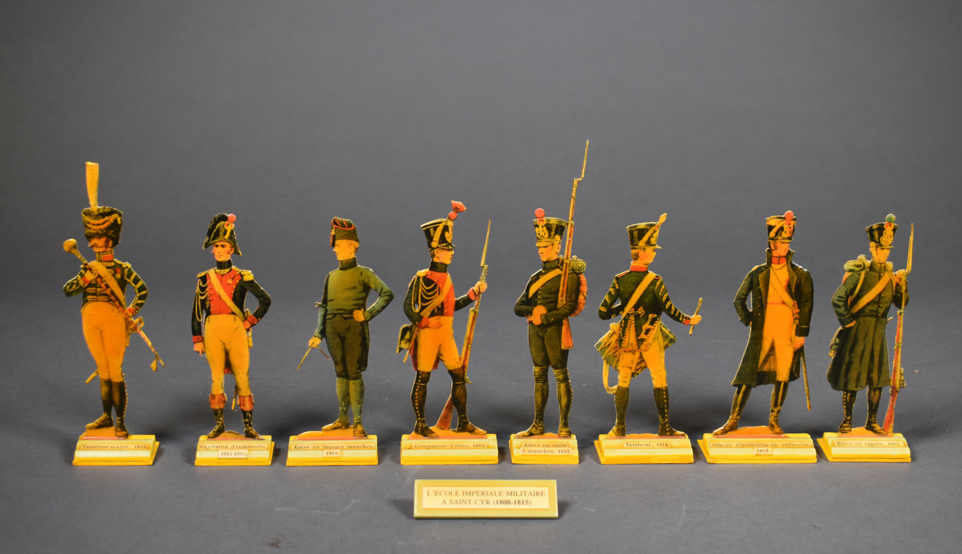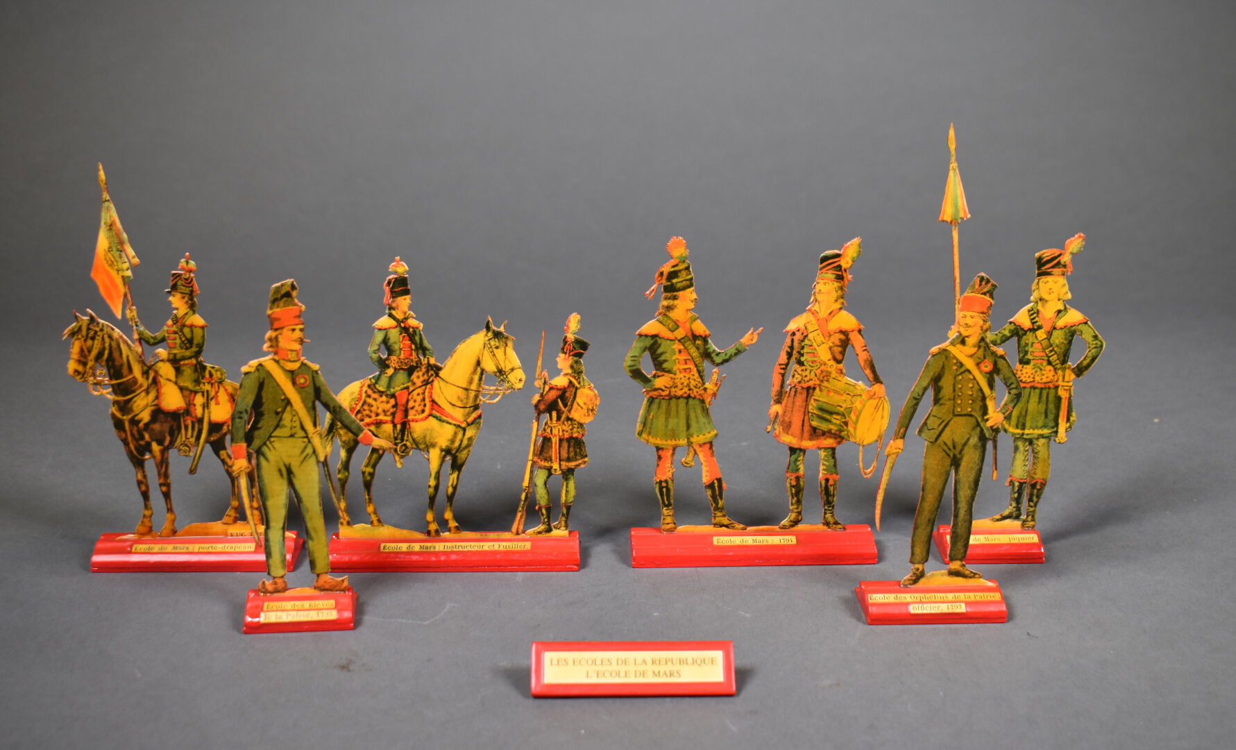 Important lot de figurines militaires de toutes tailles réalisées avec des gravures de publication militaires. Plus de 100 pièces.
