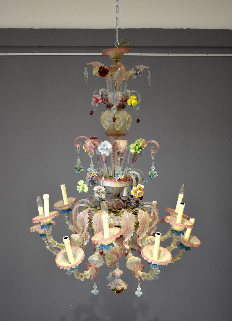 Important lustre en verre clair et verre de couleurs soufflé à douze bras de lumière à décor de feuilles, fruits et fleurs en verre de couleur (petits éclats et manques,restaurations). Murano, XXe siècle. Haut. du fût : 125 cm.