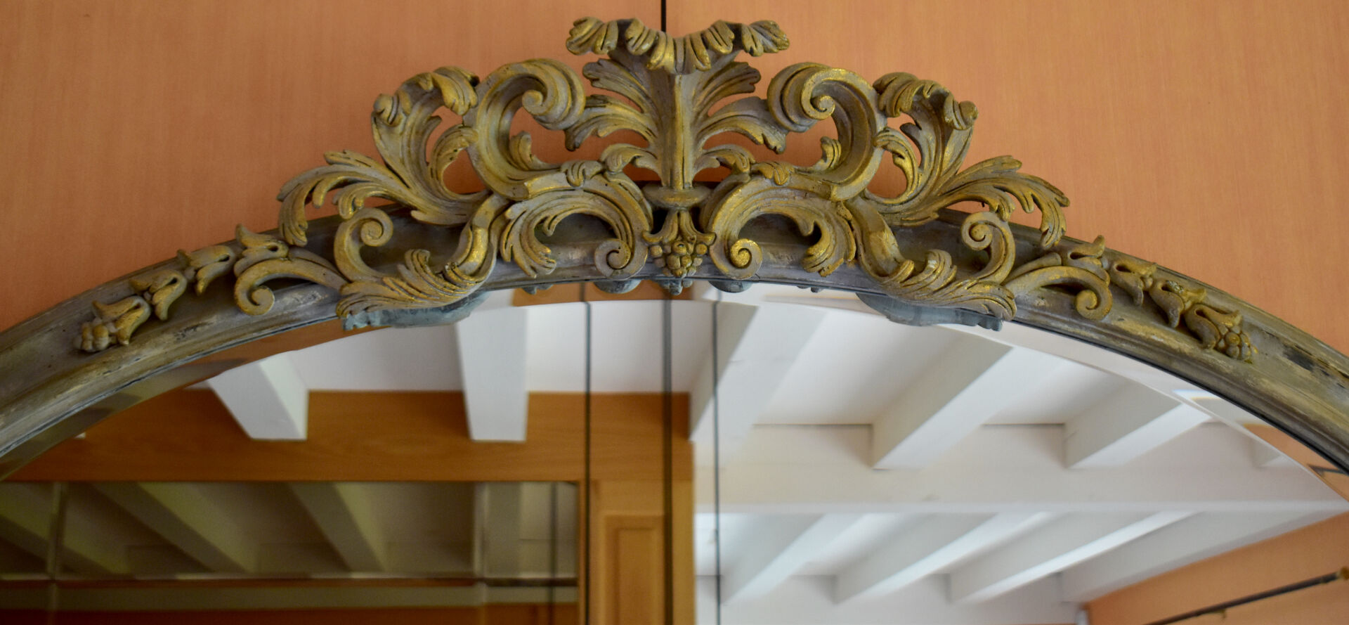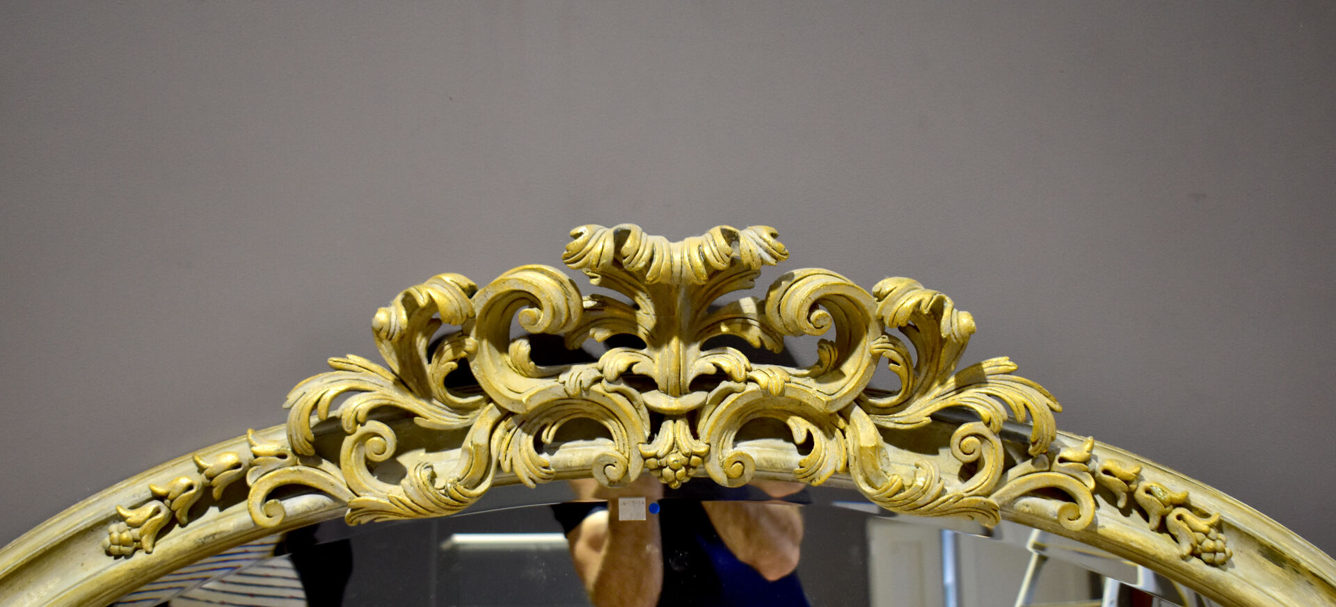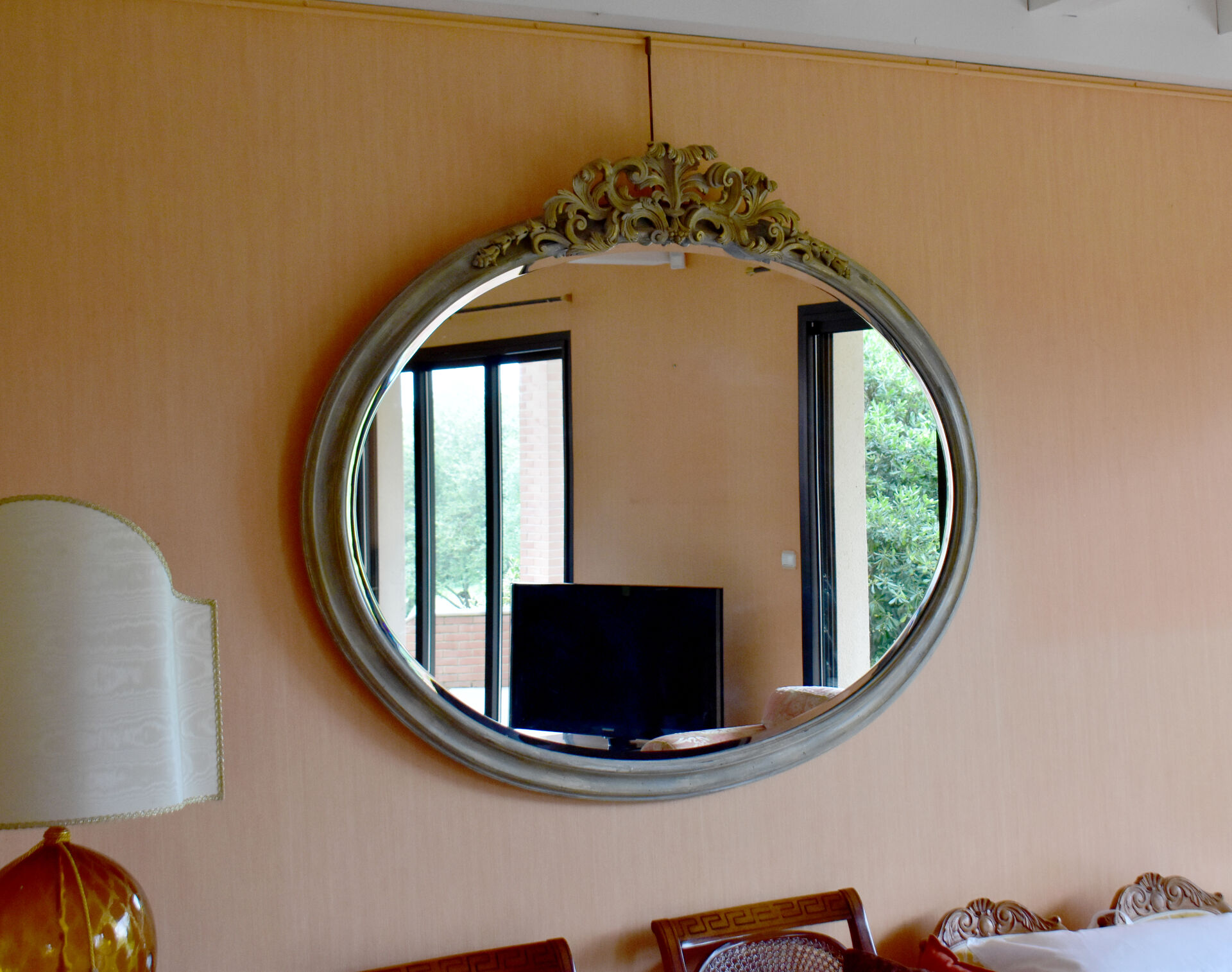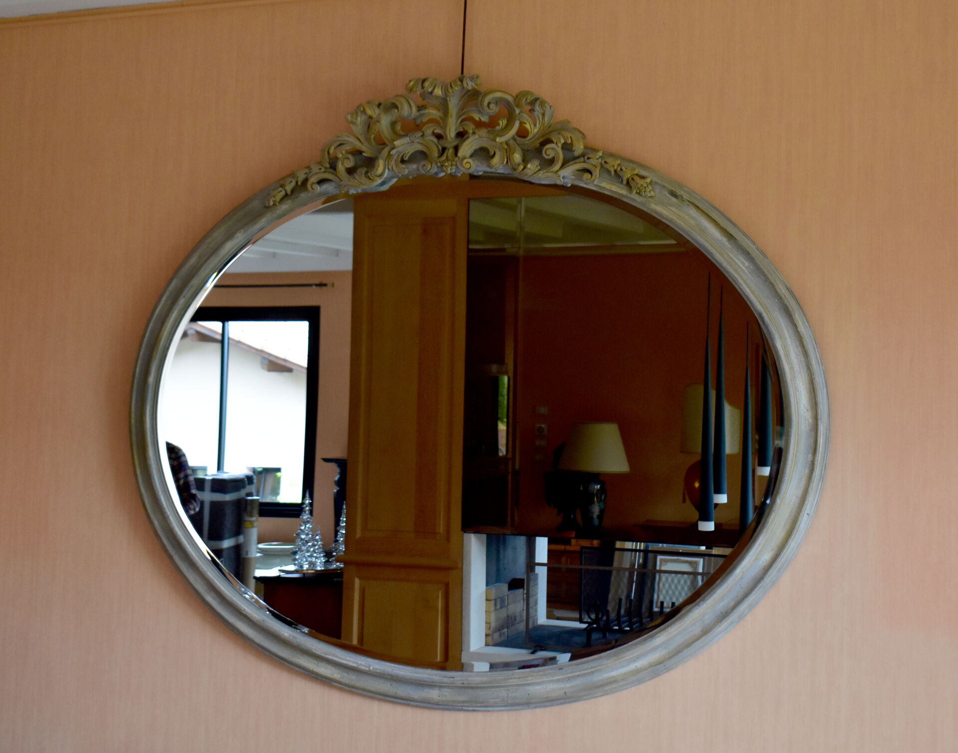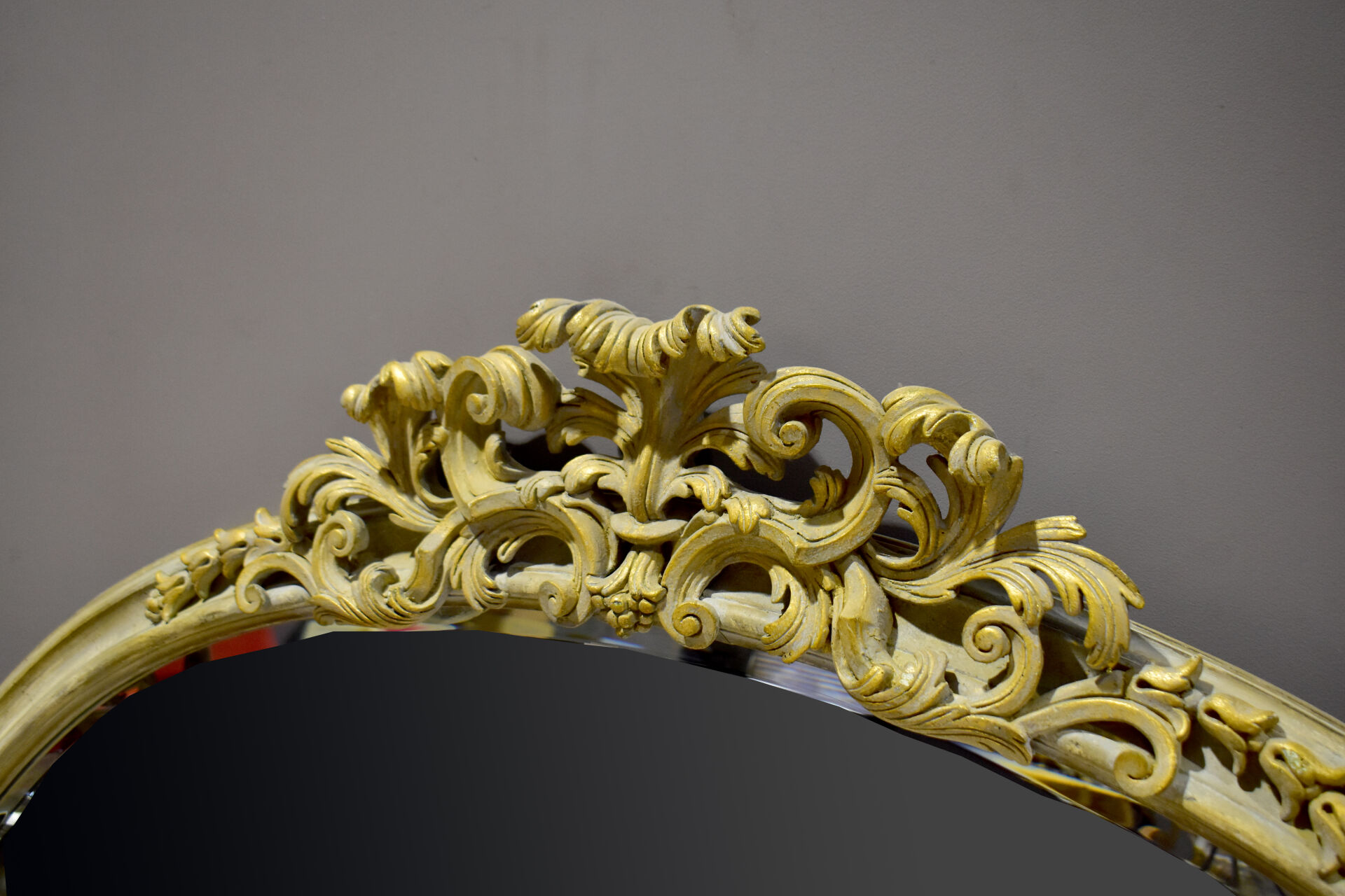 Important miroir ovale en bois mouluré creusé et doré, sommé d’une palmette et d’acanthes. La glace biseautée. Travail moderne dans le Style Louis XVI. 126 x 147 cm.