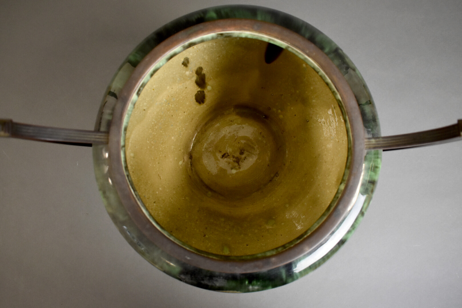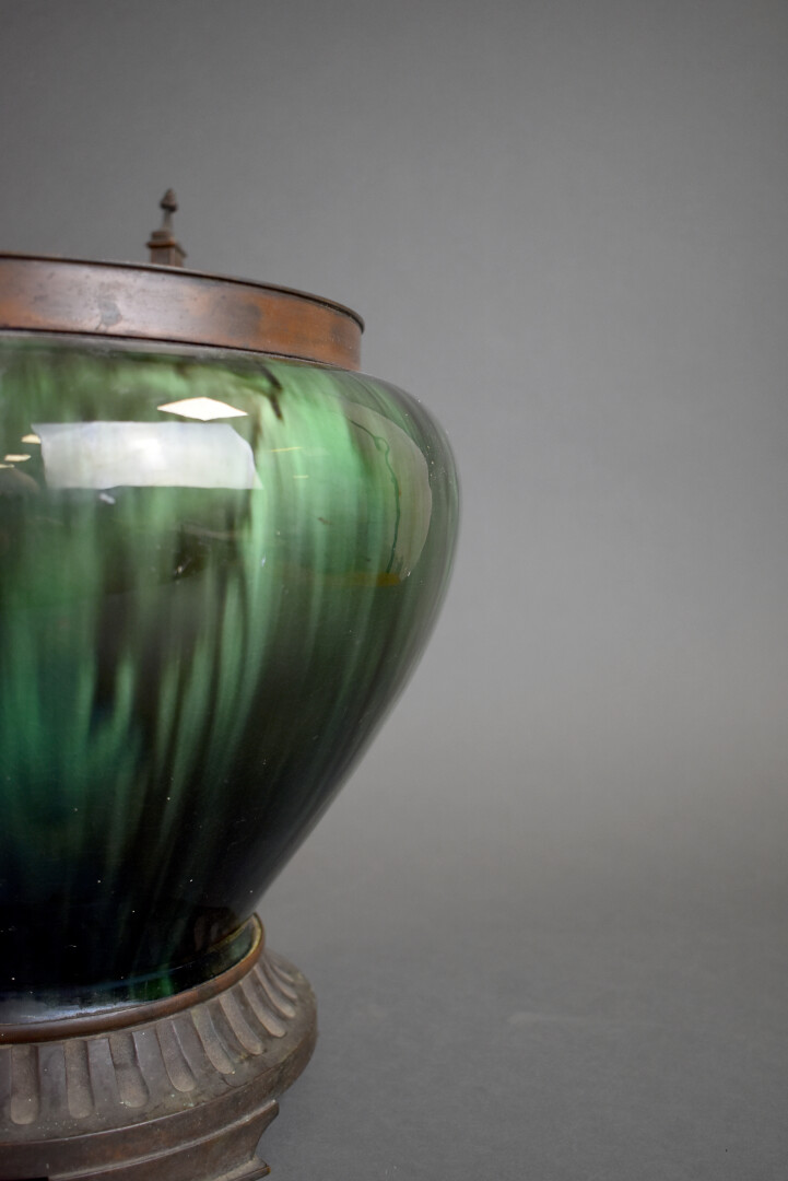 Important pot à anses, la panse en céramique émaillée à coulures vertes en noir légèrement irisé, la monture et les anses en bronze (un bras légèrement tordu). Travail néo-classique vers 1900. Haut. : 39,5 cm.